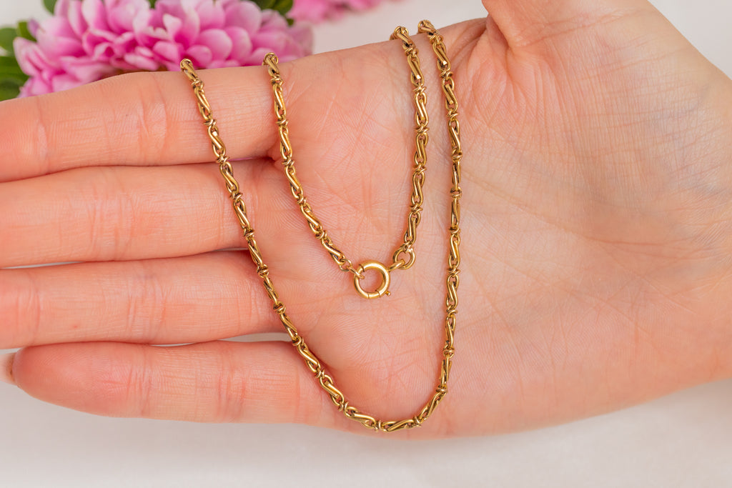 EXCELLENT. An excellent 28" antique French 18ct Gold fancy chain. This gorgeous piece has so much beauty to admire, with its rich Gold hue, lovely links and secure bolt ring. Steeped in French deliciousness, this necklace can be adored for decades more!