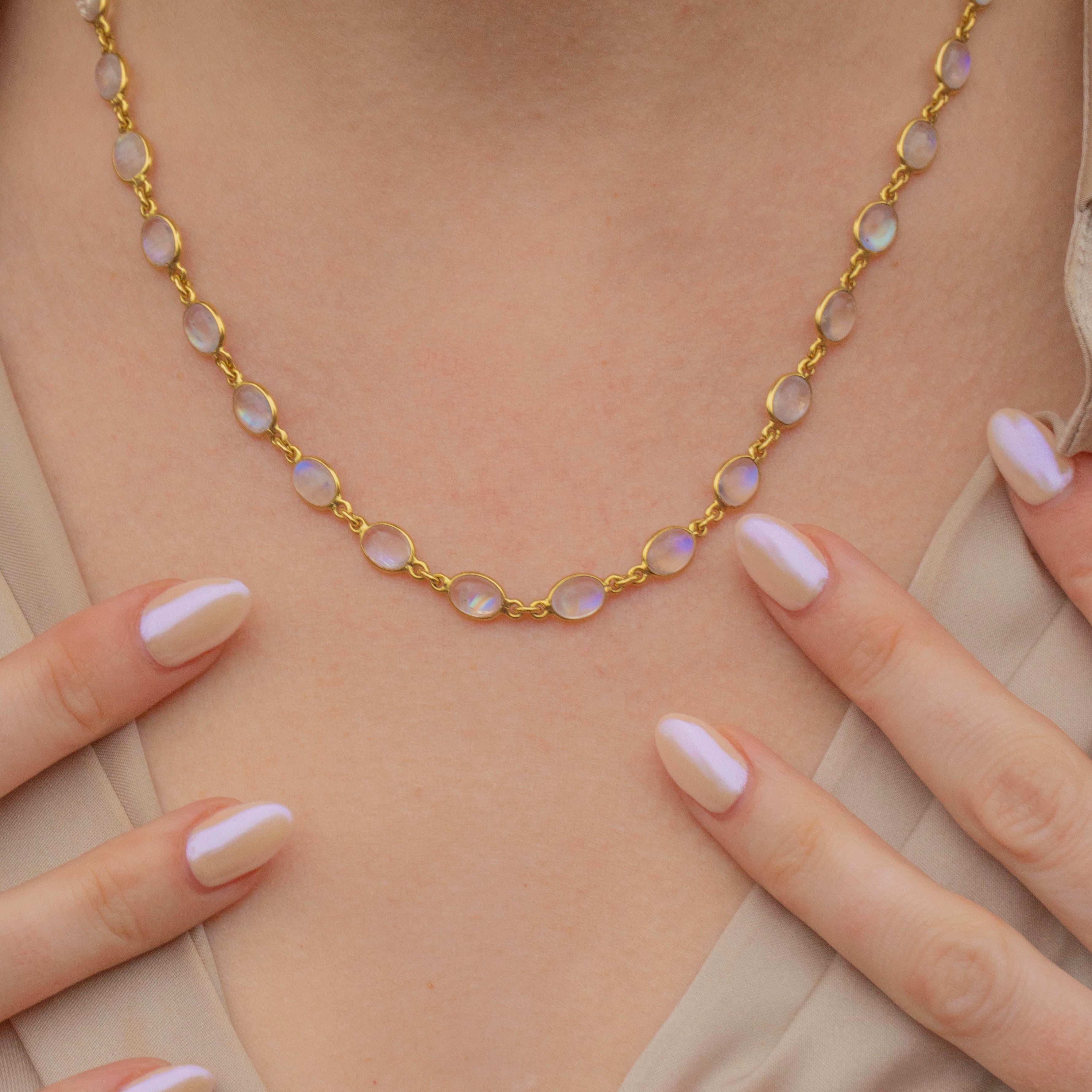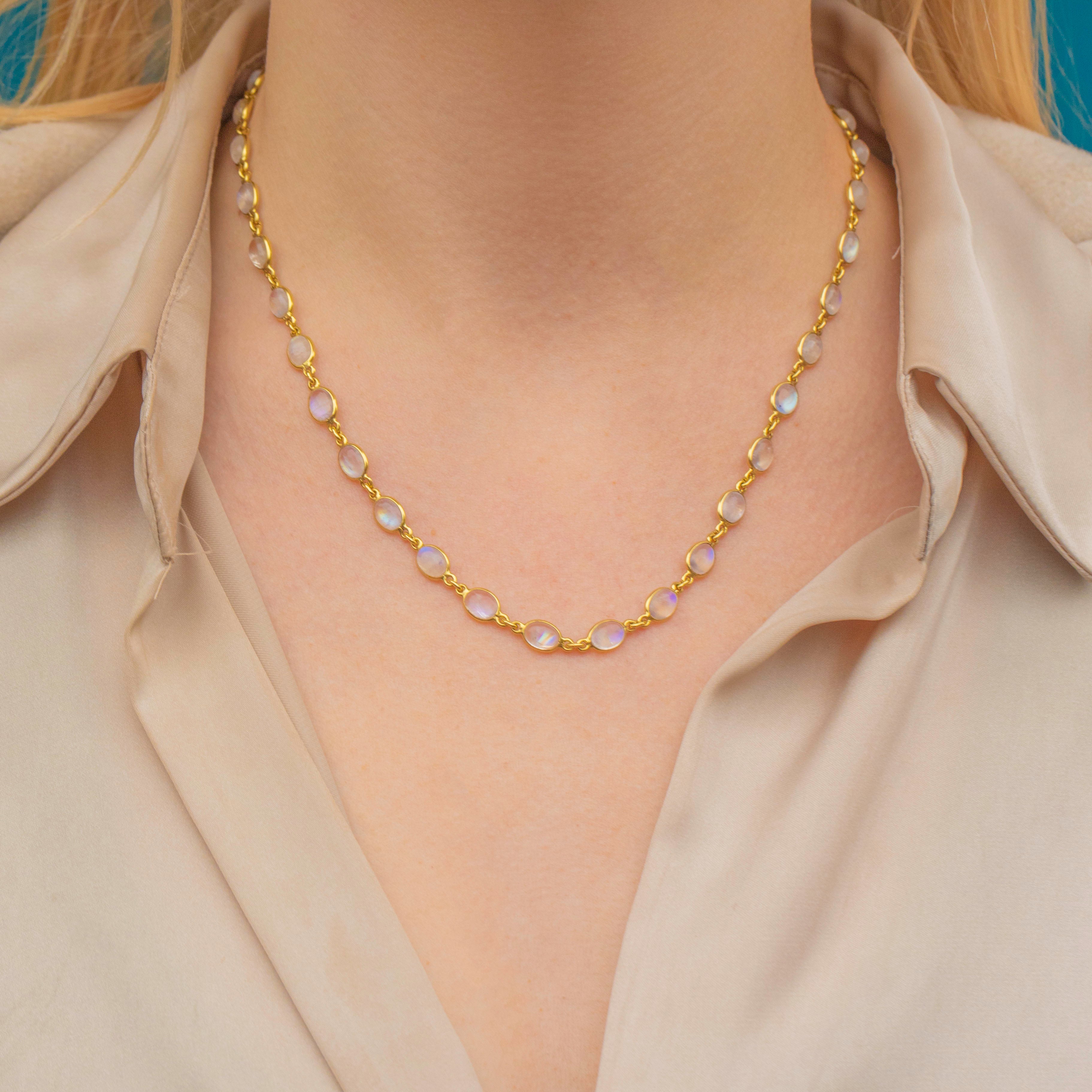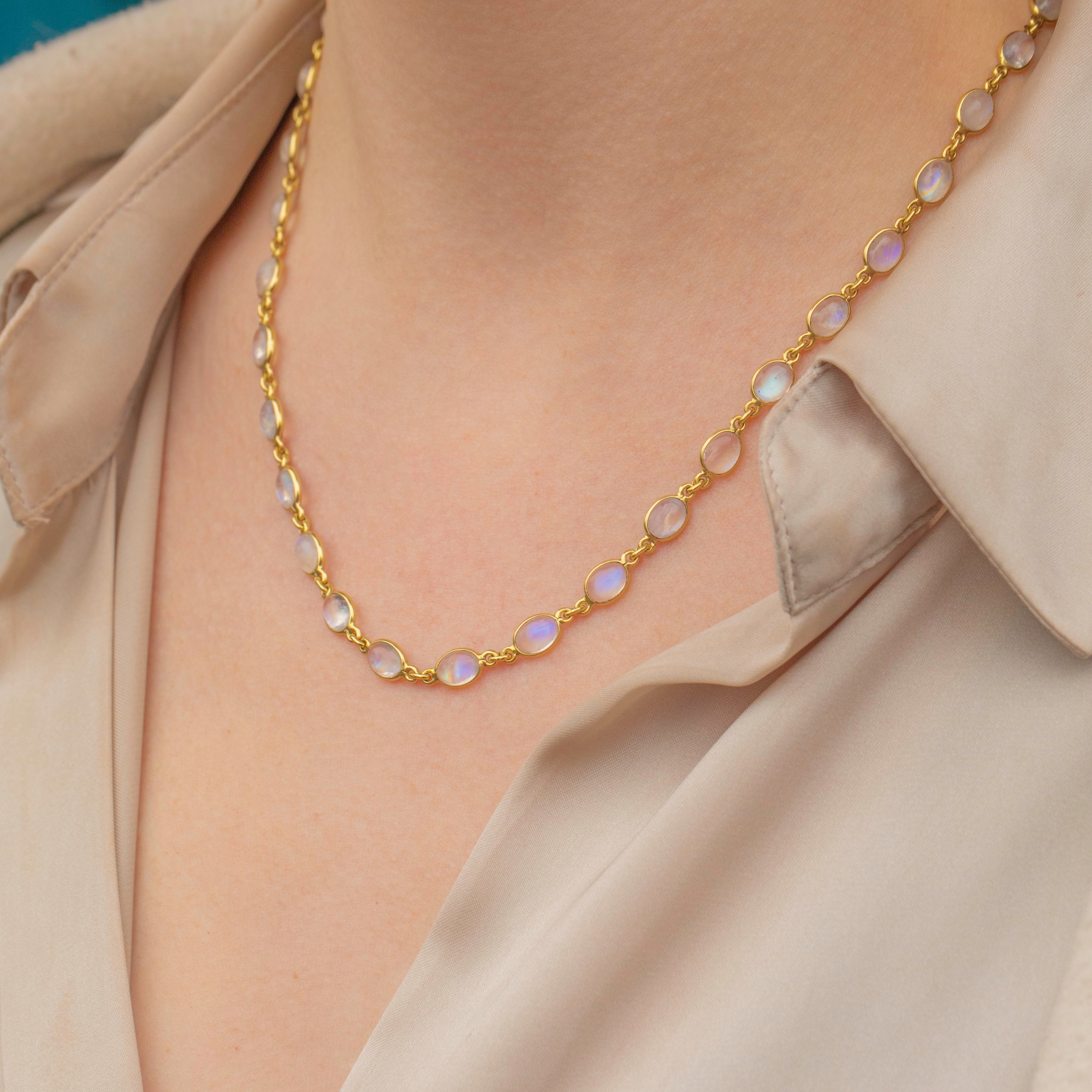 Bursting with ethereal beauty, this bezel-set Labradorite necklace will enchant anyone lucky enough to lay eyes on her! Featuring 35 Labradorite cabochons, with a combined weight of 26.95ct, all set into chunky bezels, this mid-century necklace is the perfect piece for everyday wear.