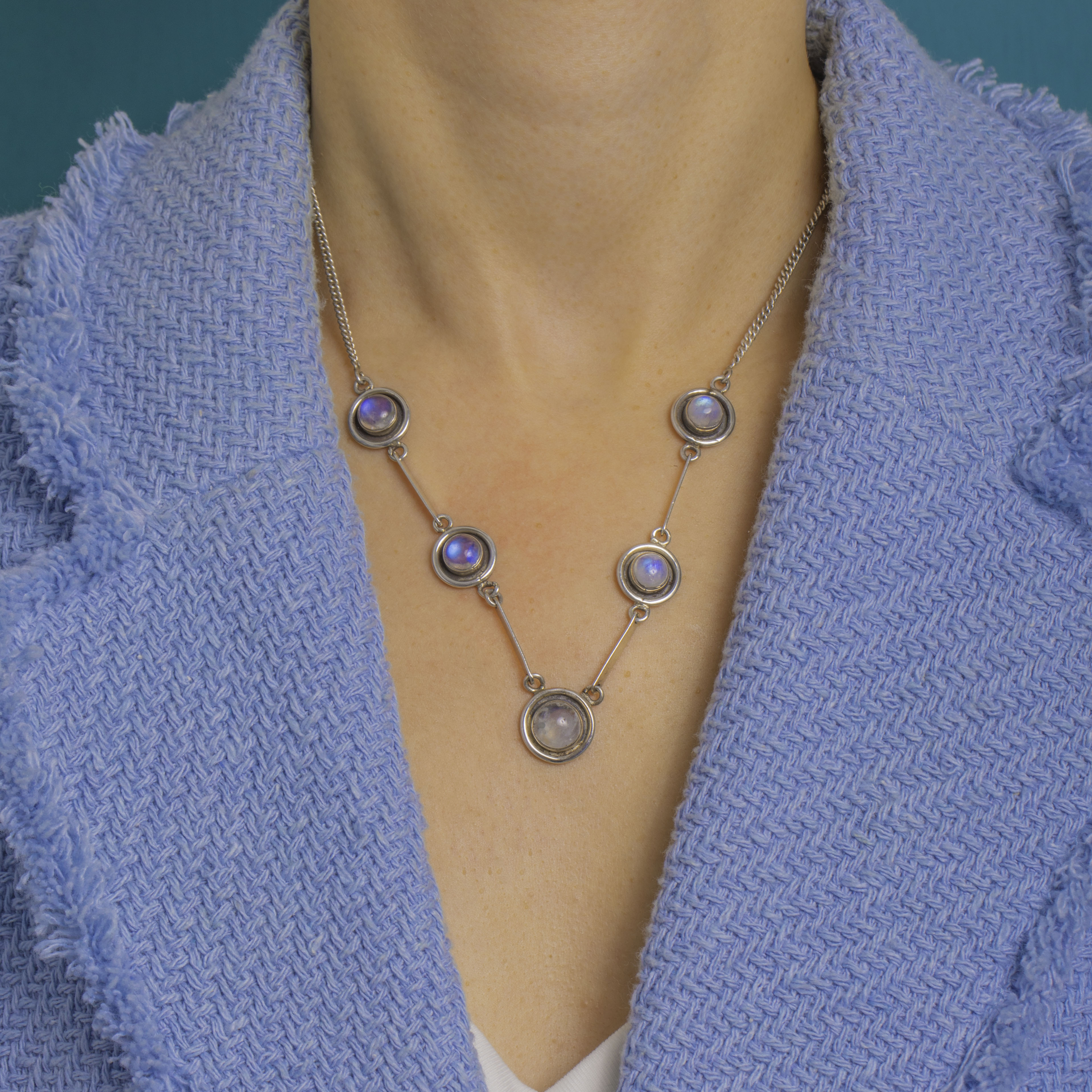 A sleek Art Deco station necklace alive with blue-flashed Moonstone cabochons, this piece balances minimalism with quiet drama. Five round Moonstones glow within concentric circular “target” mounts, their luminous sheen amplified by softly oxidised Silver that lends depth and definition.