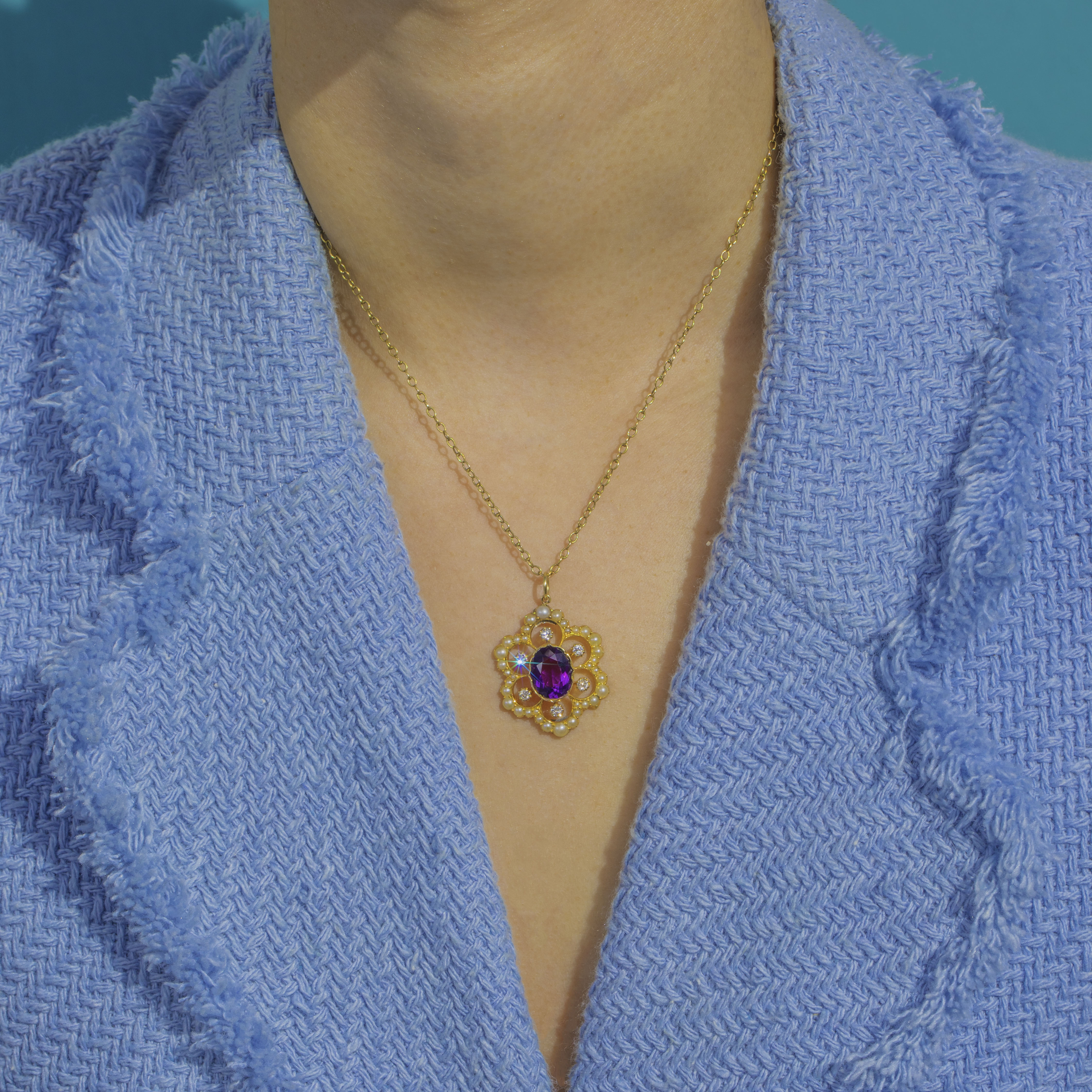Glowing with Late Victorian romance, this 18ct Gold cluster pendant centres on a richly hued oval Amethyst, haloed by lively Diamonds and encircled with a scalloped border of lustrous Natural Pearls. The openwork floral frame and raised collet lend beautiful depth and texture, while the warm Gold sets off the Amethyst’s regal purple to perfection.