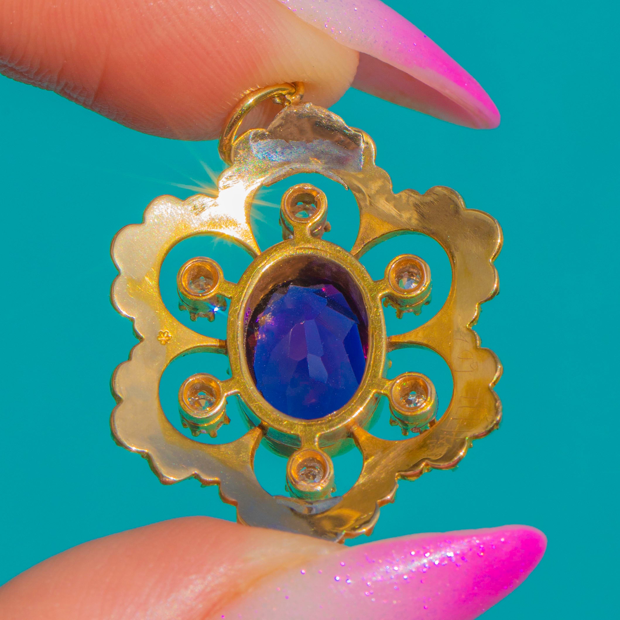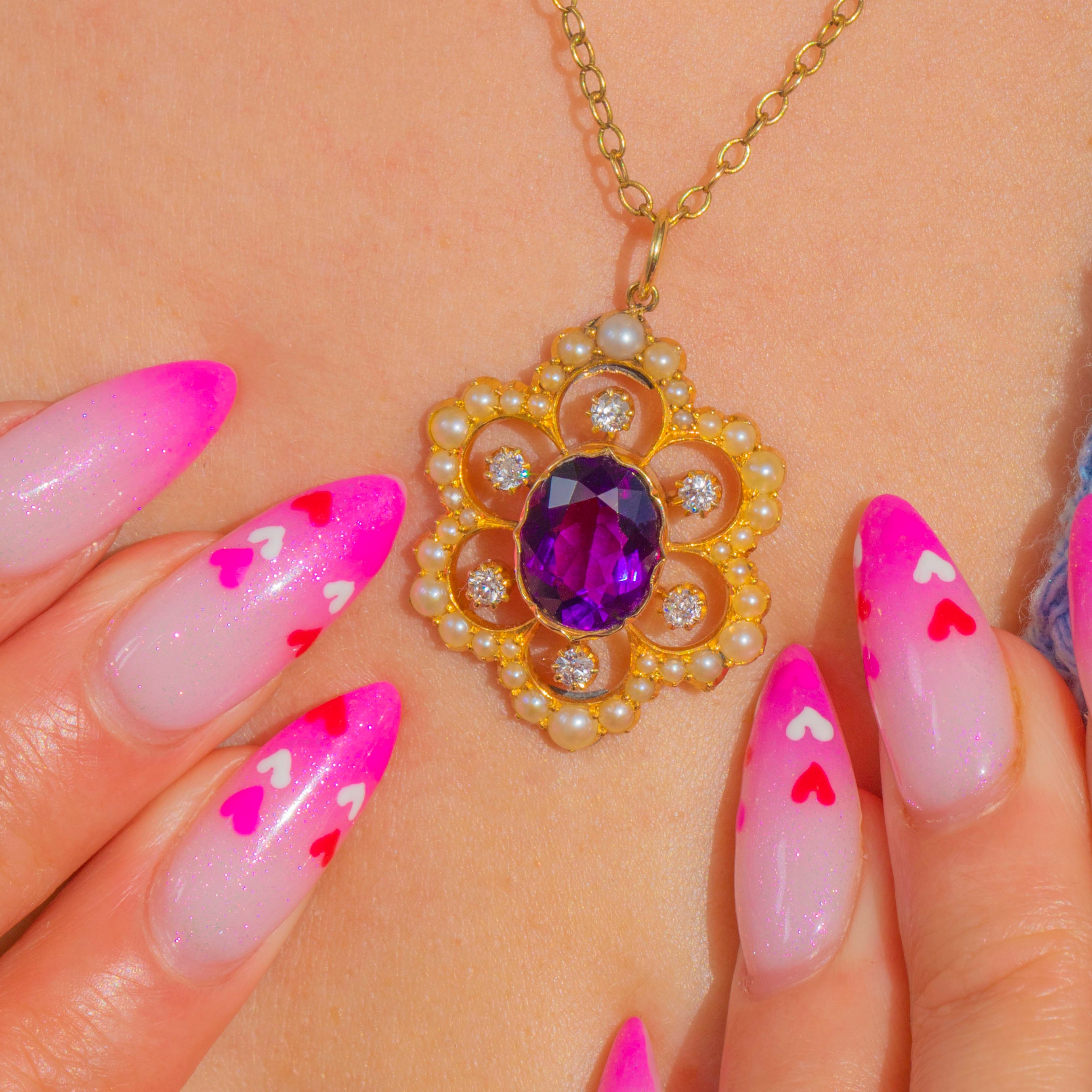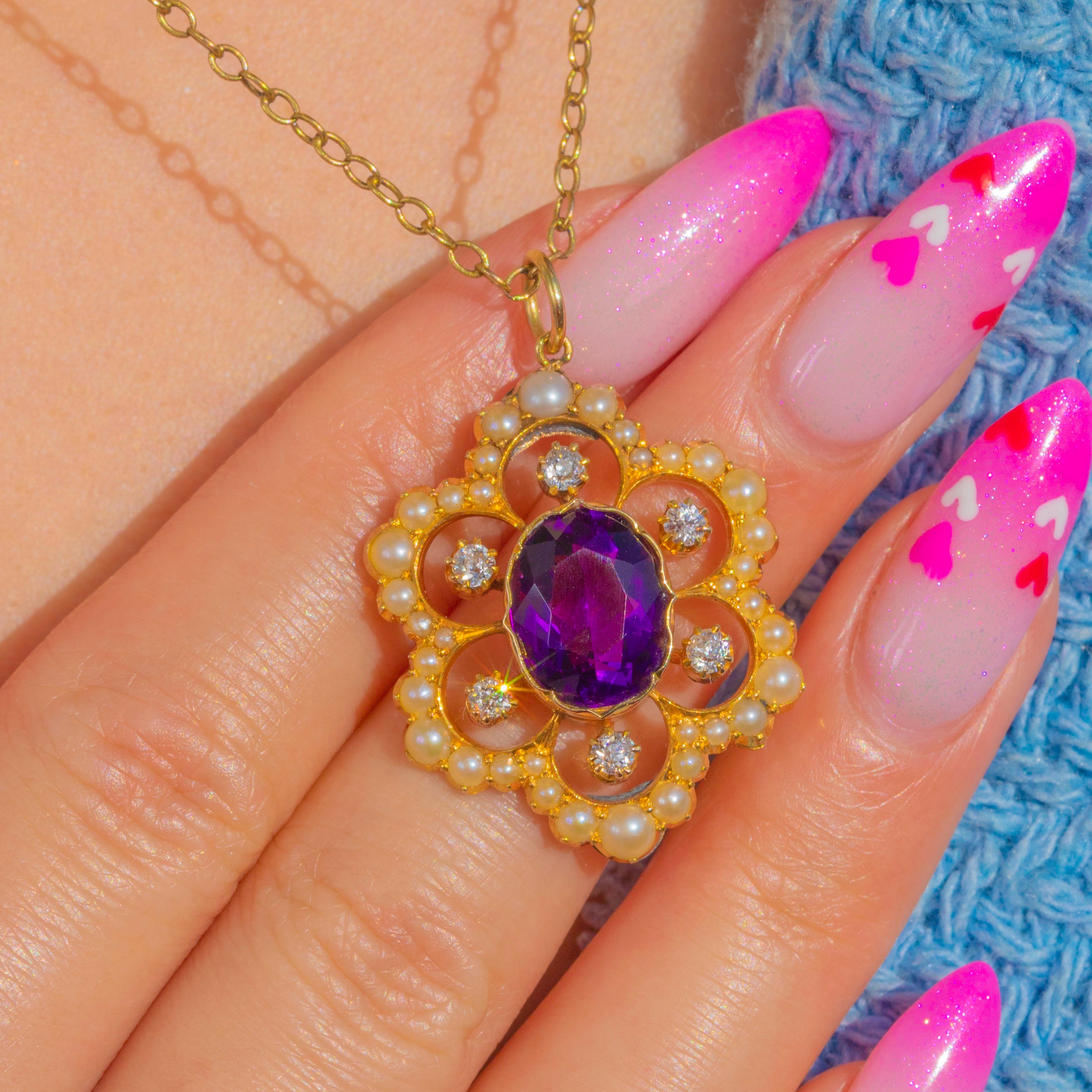 EXCELLENT: The Amethyst, Diamonds and Pearls are bright with no visible chips or significant abrasions; the Amethyst’s facets remain crisp. The 18ct Gold settings and decorative openwork are secure with light surface wear commensurate with age. A beautifully preserved antique pendant, ready to wear and enjoy.