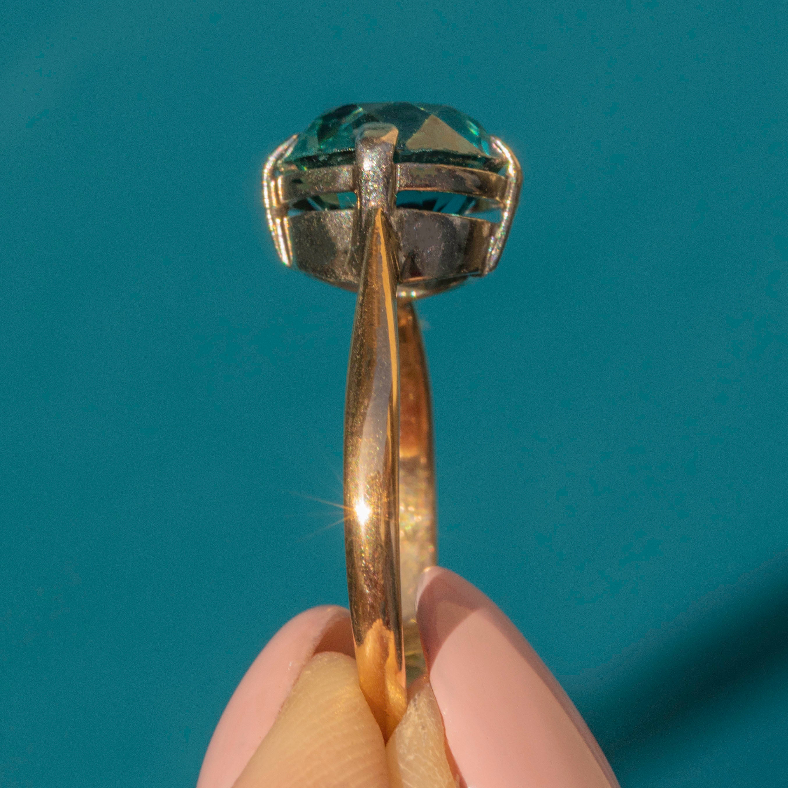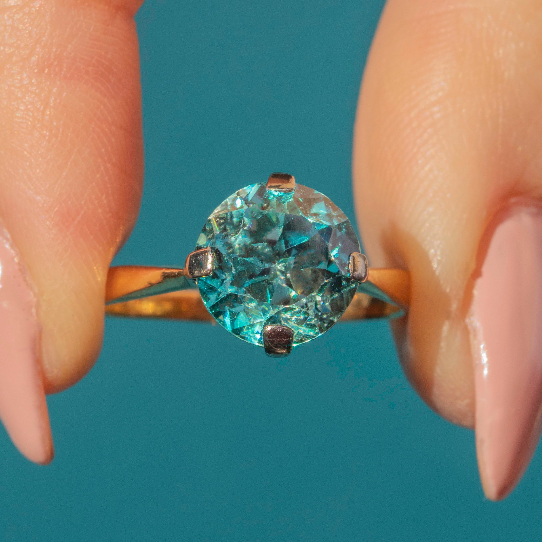 This 18ct Gold Art Deco blue Zircon solitaire ring is absolutely gorgeous! Her luminous 4.75ct azure-hued Zircon takes centrestage, radiating soft, calming cerulean hues whilst glistening in the light.