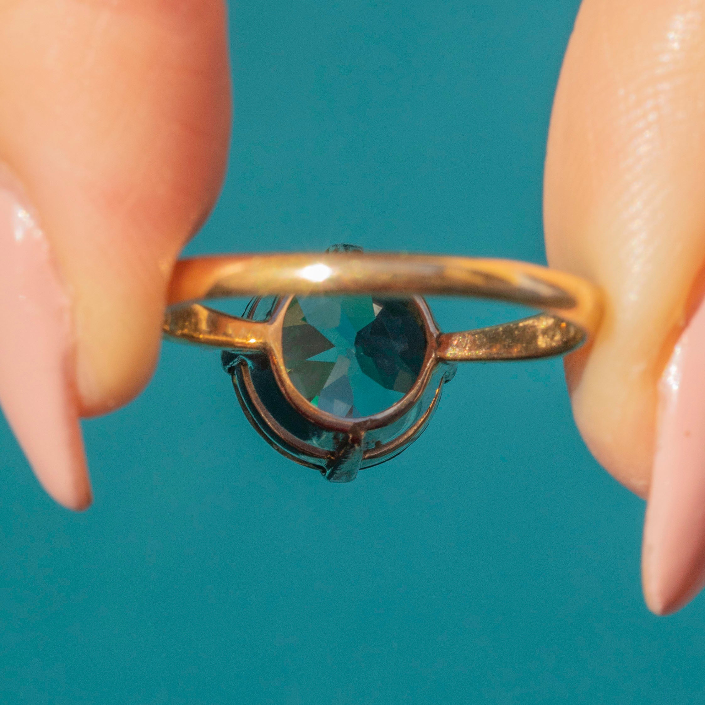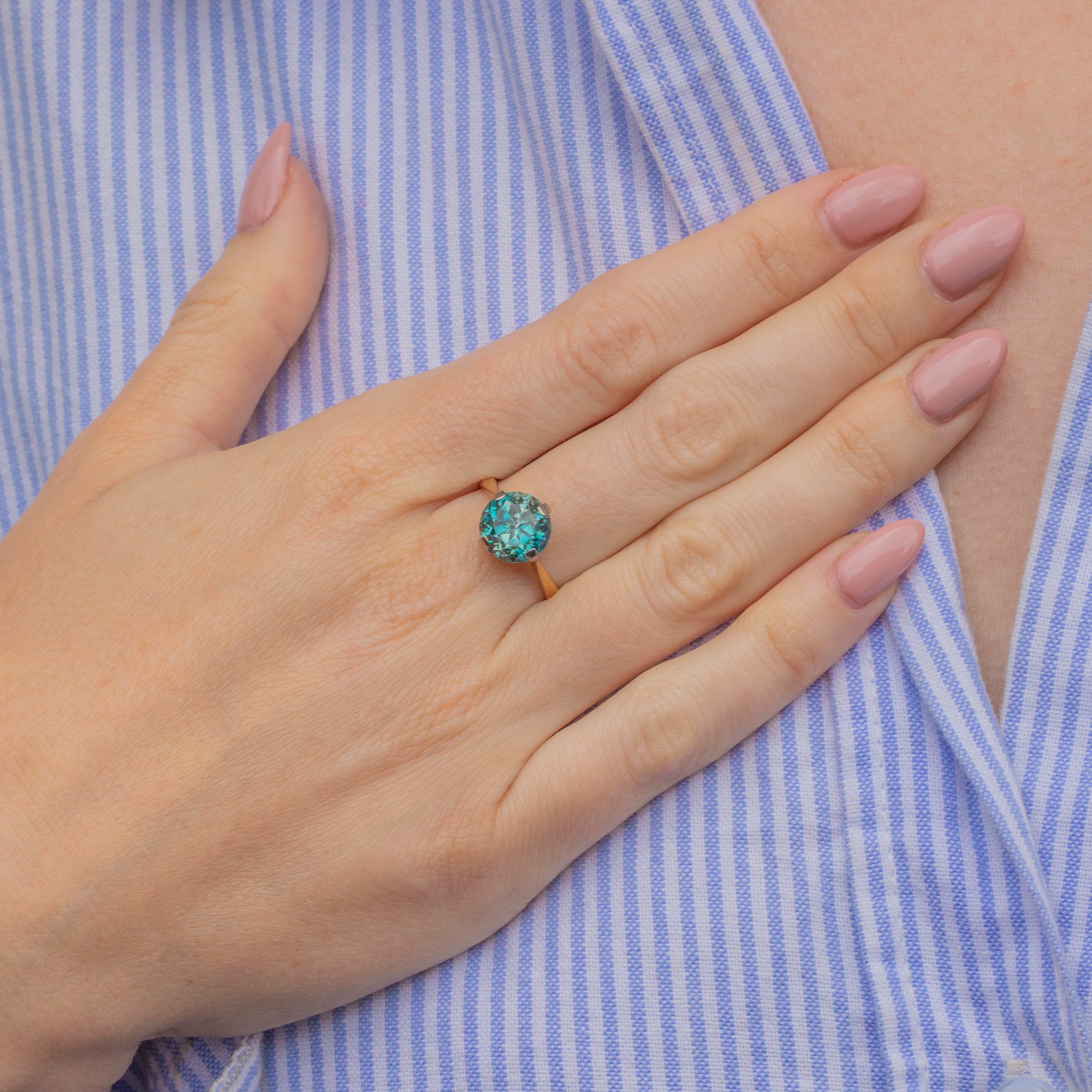 Her shank is crafted from 18ct yellow Gold, and the bright blue Zircon is held into place by robust 9ct white Gold claw settings. Blue Zircons are a wonderful stone for providing inner peace, and with this Art Deco solitaire ring you are sure to find it! Versatile and sophisticated, she will make the perfect addition to your collection.
