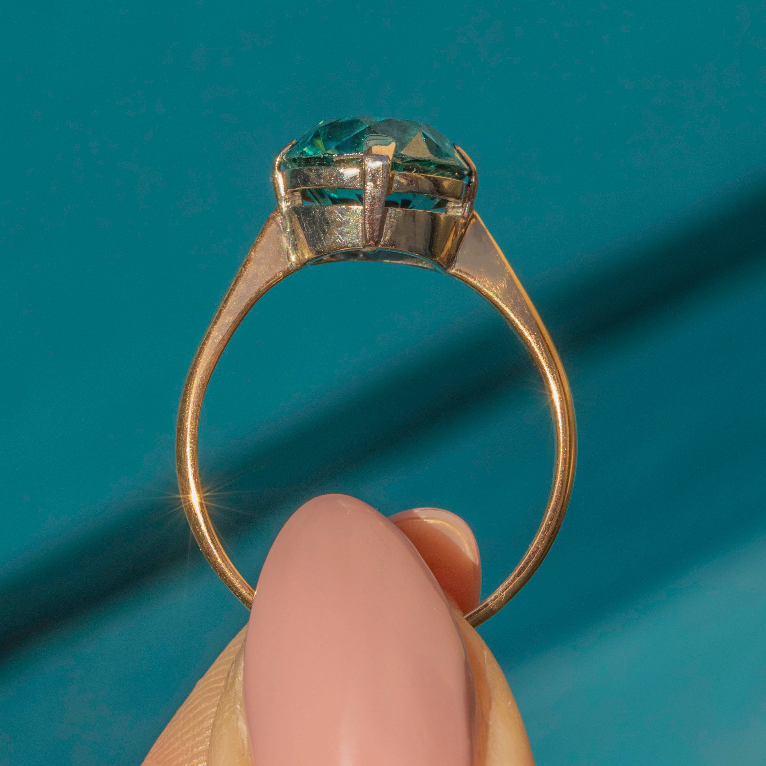 The Zircon is held securely in place by her 9ct White Gold claw settings, and rests gracefully on an 18ct yellow Gold band which is free from any visible signs of wear. Although unusual to see a combination of Gold finenesses in one ring, both parts appear original and it's likely the jeweller used 9ct settings, it would have been stronger and more durable than 18ct Gold at the time.