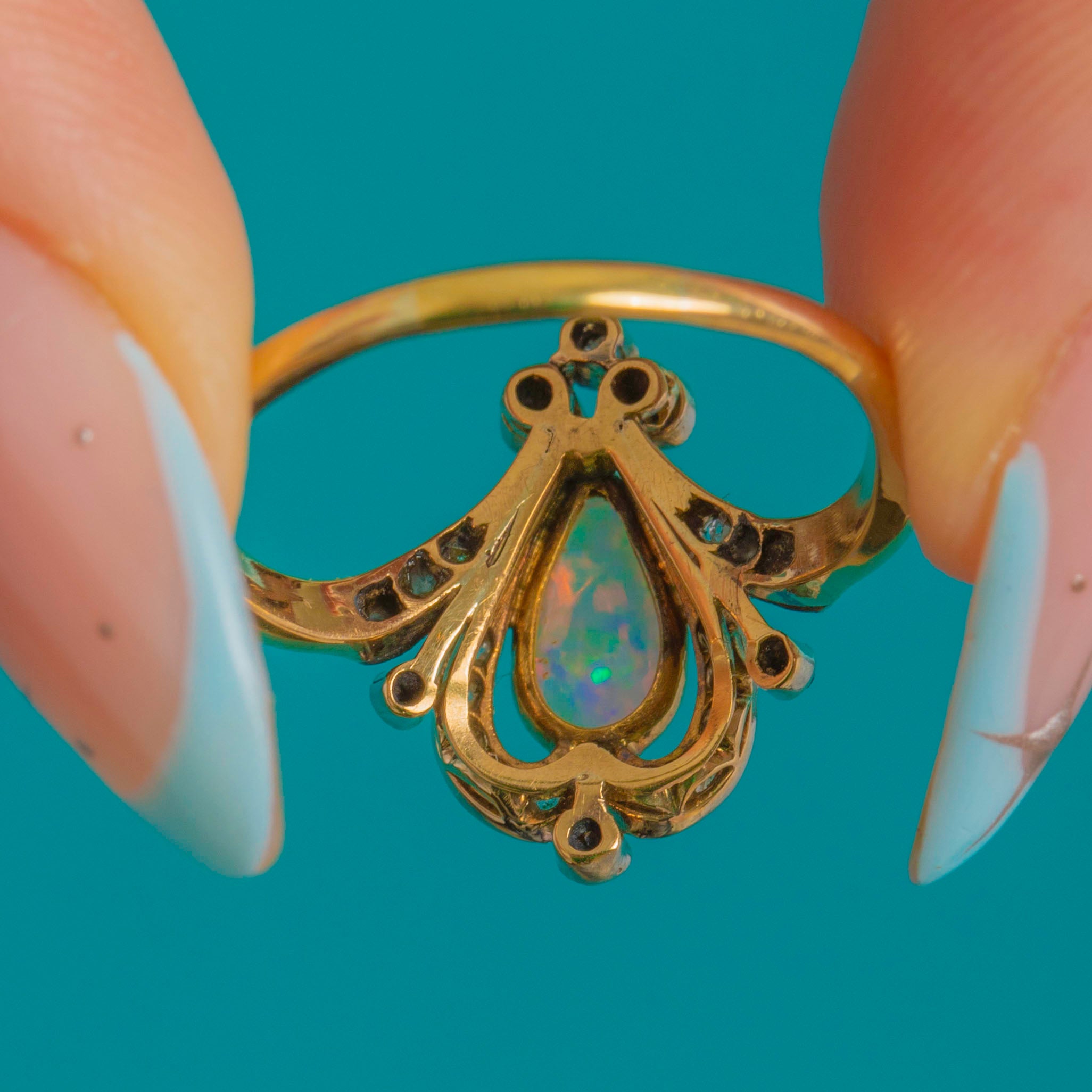 A wonderfully romantic Art Nouveau ring, shaped like a little jewel-box tiara. The centre holds a pear-shaped Opal with lively flashes of colour, framed by a glittering sweep of Diamonds set into cool Platinum for extra sparkle and contrast.