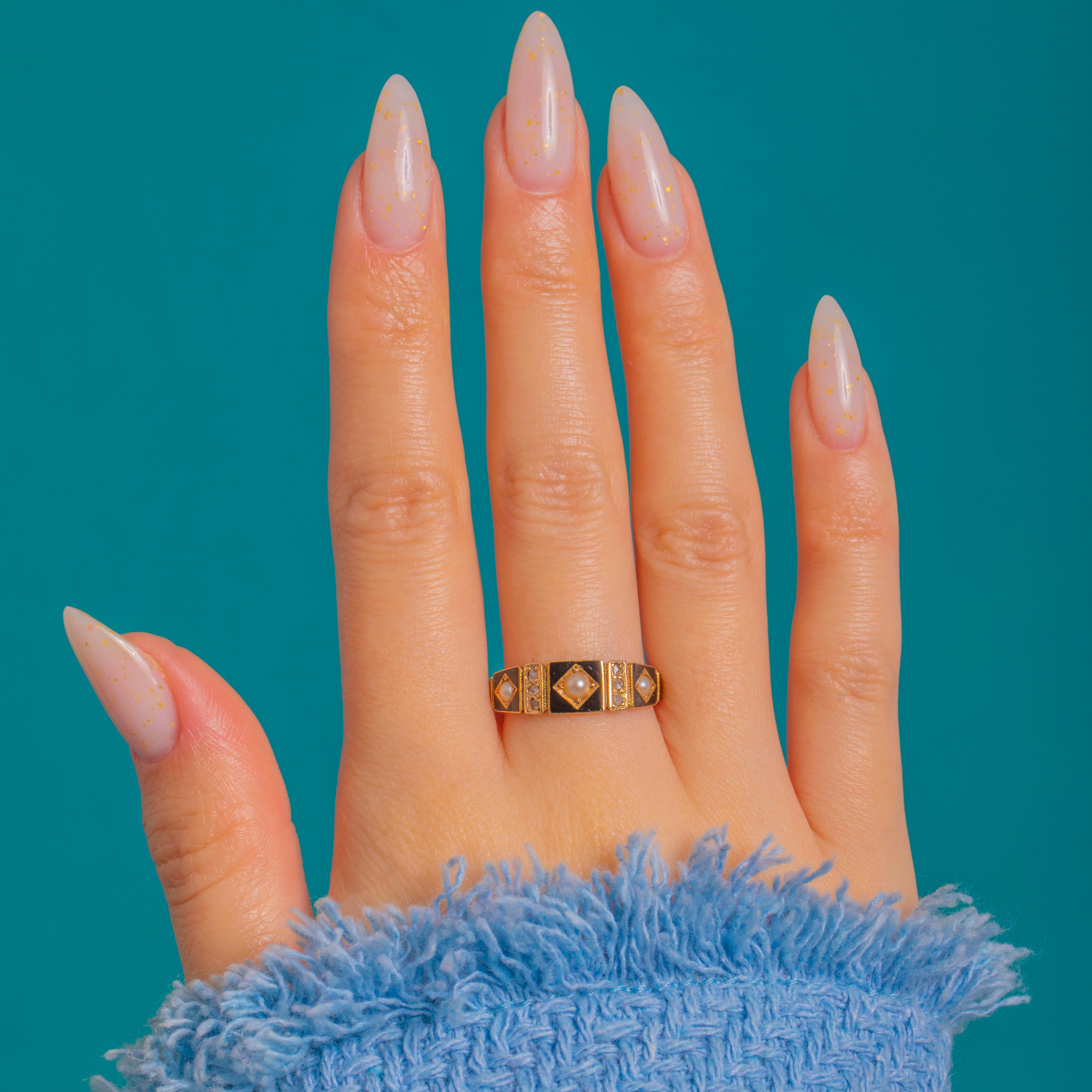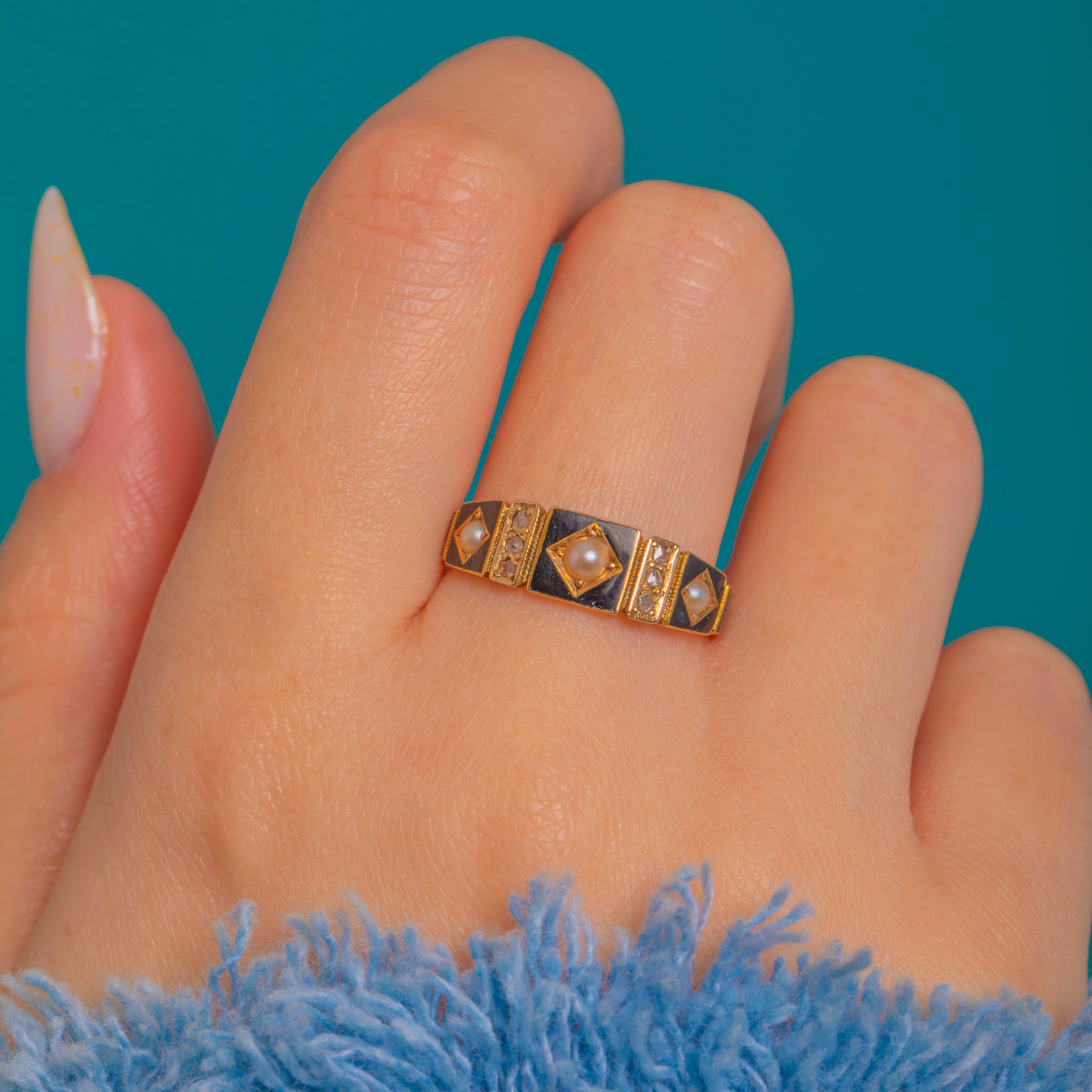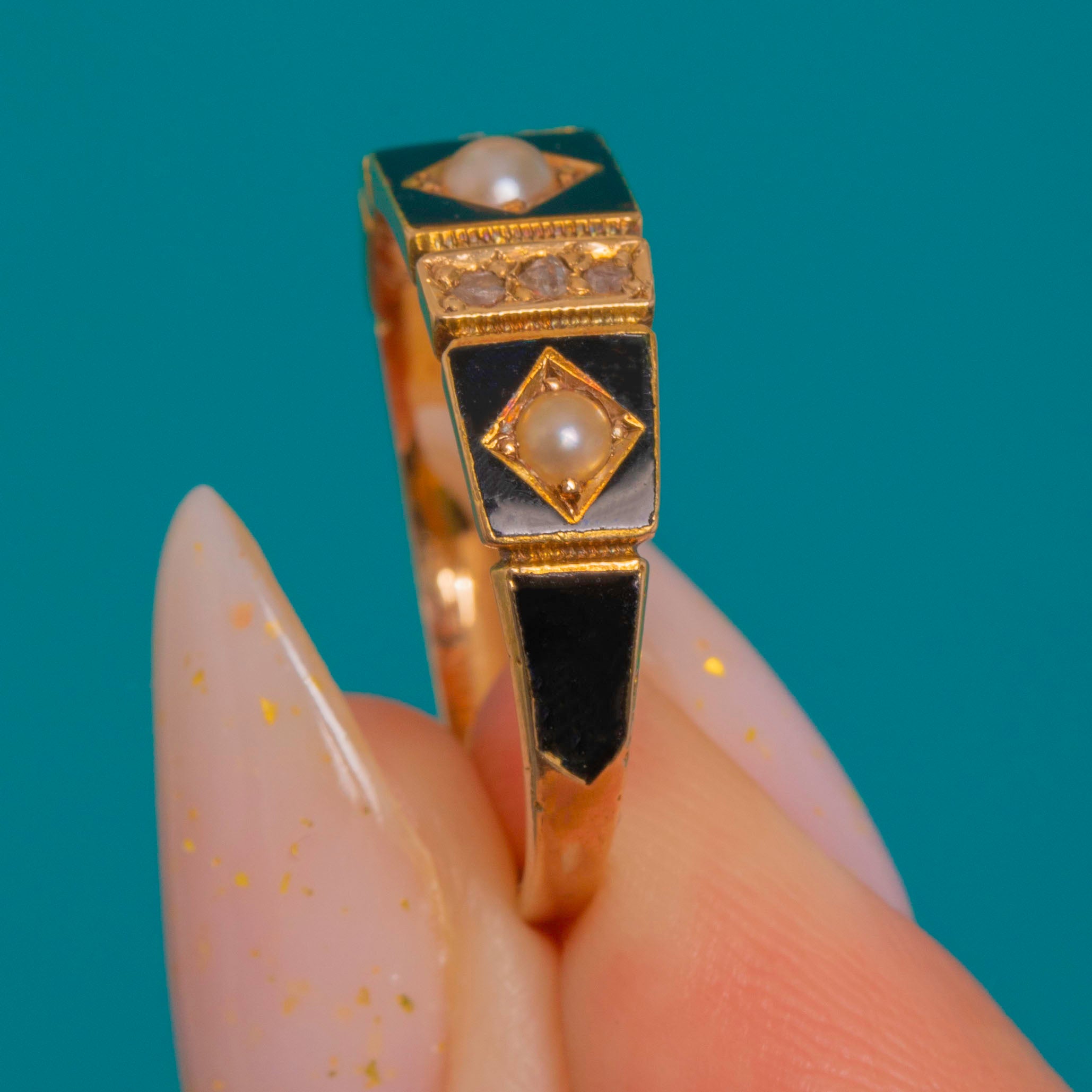 A refined Victorian mourning ring in 18ct Gold, pairing glossy black Enamel with luminous Pearls and delicate Diamonds. The low, multi-panel head is composed of lozenge-shaped frames set over inky Enamel fields, each centred by domed Pearls and bordered by fine beaded edging and tiny pellet dividers. Vertical trios of petite rose-cut Diamonds accent the shoulders, lending a subtle glimmer to the striking black, white and Gold palette.