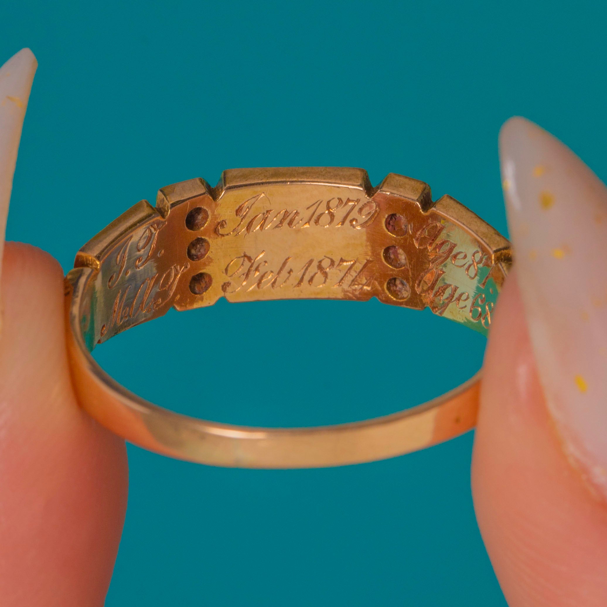 Beautifully crafted in the late Victorian era (circa 1879), the ring sits low on the finger for effortless wear, with crisp geometric detailing and classic Etruscan-revival nuances. The interior bears hand-engraved script including “J.J Jan 1879 Age 87" and “MAJ Feb 1874 Age 68", adding a moving personal history. Underneath, neat rectangular back-plates with breathers speak to the careful workmanship of the period.