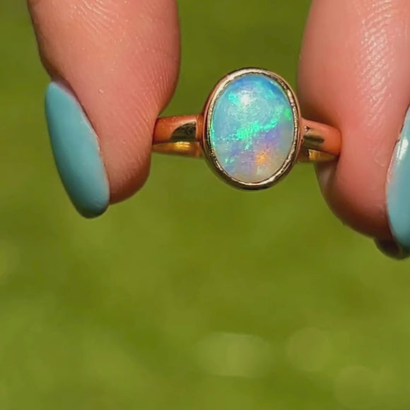 EXCELLENT. We are pleased to present this 18ct Gold Opal solitaire bezel-set ring in excellent condition! The Opal sits securely in the bezel setting, with no damage to her smooth cabochon cut to note. The bezel setting hugs the Opal with a rich and buttery hue that is securely soldered to the ring shank. With a well rounded ring band that is smooth to the touch, she can be worn with comfort and confidence!