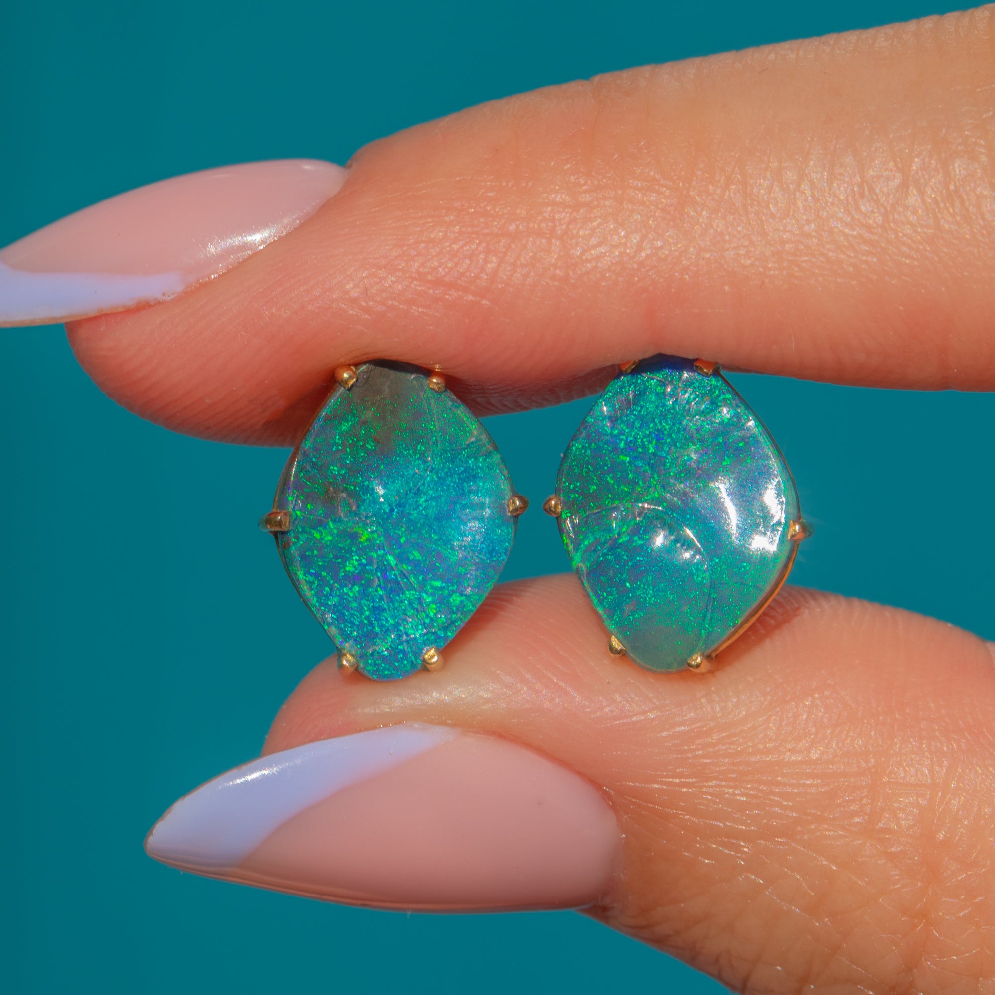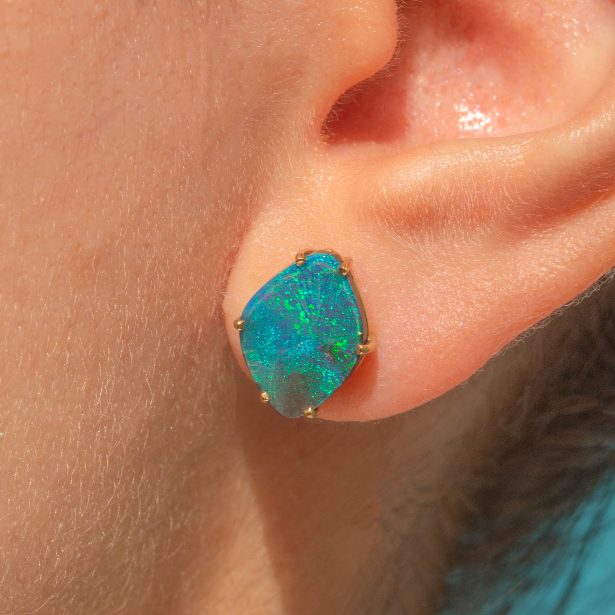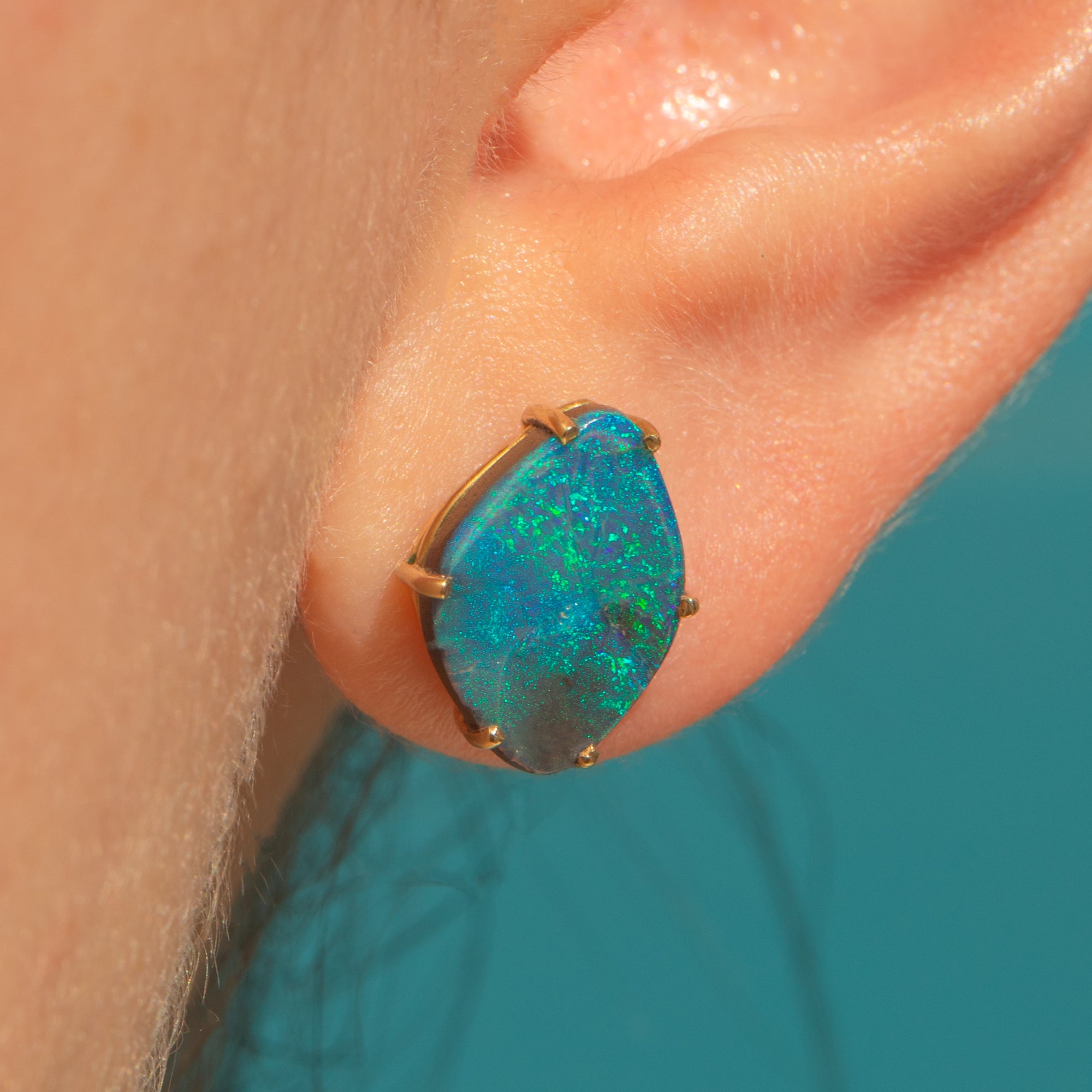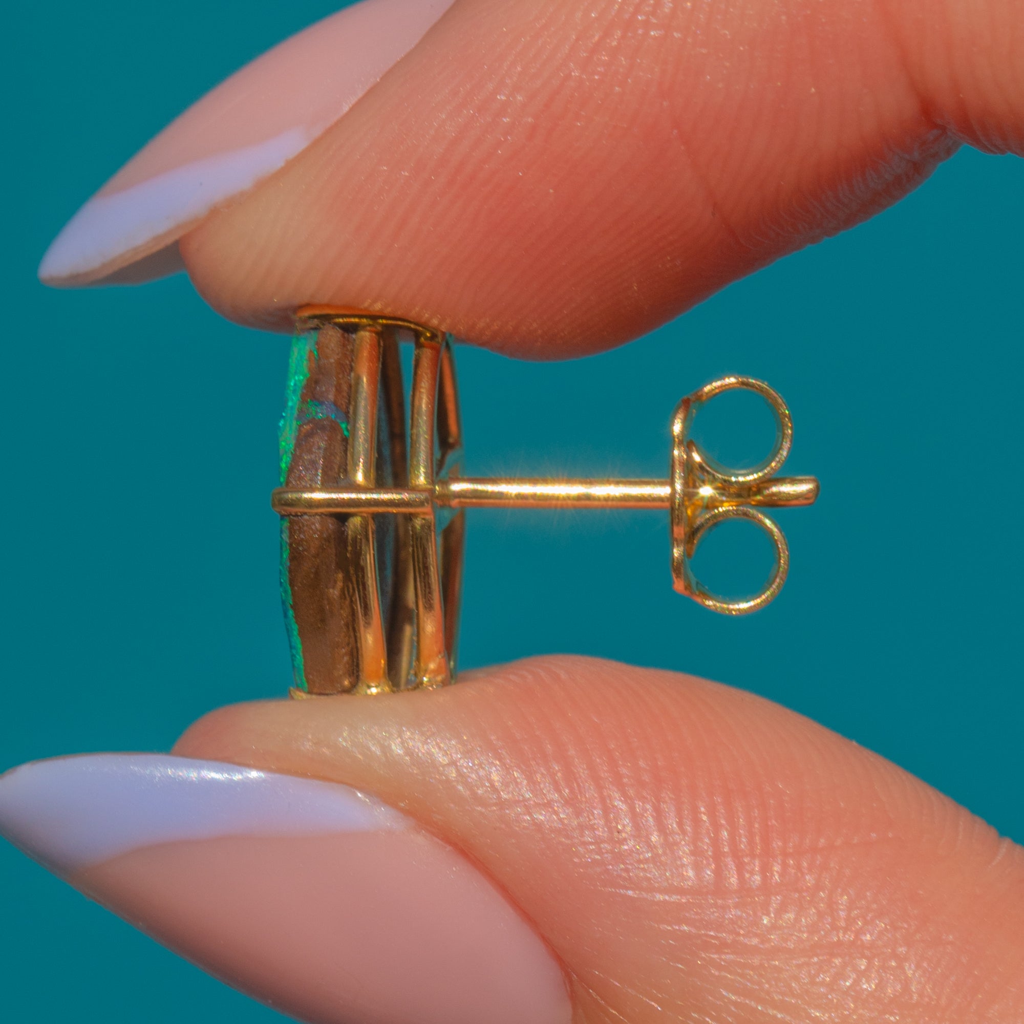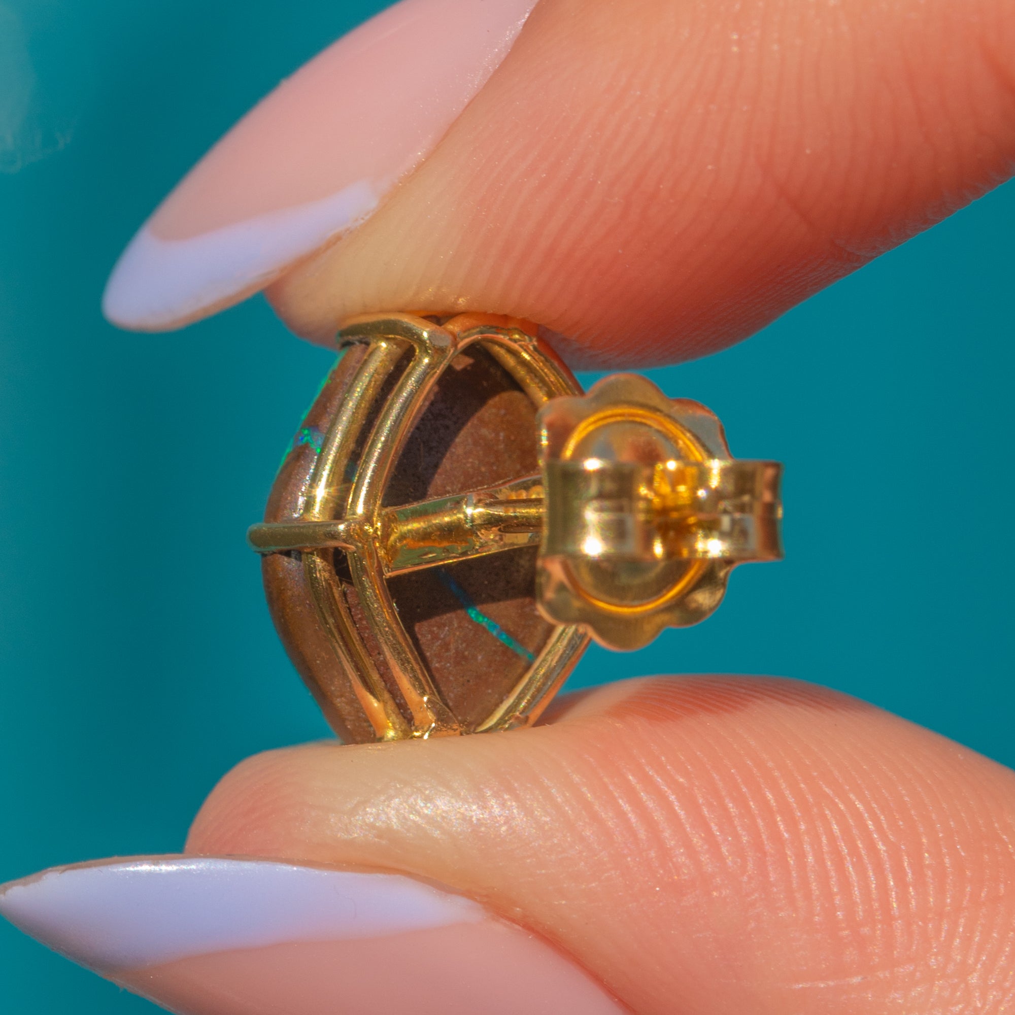 EXCELLENT: These 18ct Gold Boulder Opal stud earrings are in excellent condition. The Boulder Opals are securely held within their claw settings and are free from visible surface wear. The Gold is brightly saturated and the butterfly backs are snug-fitting, providing comfortable and secure wear!