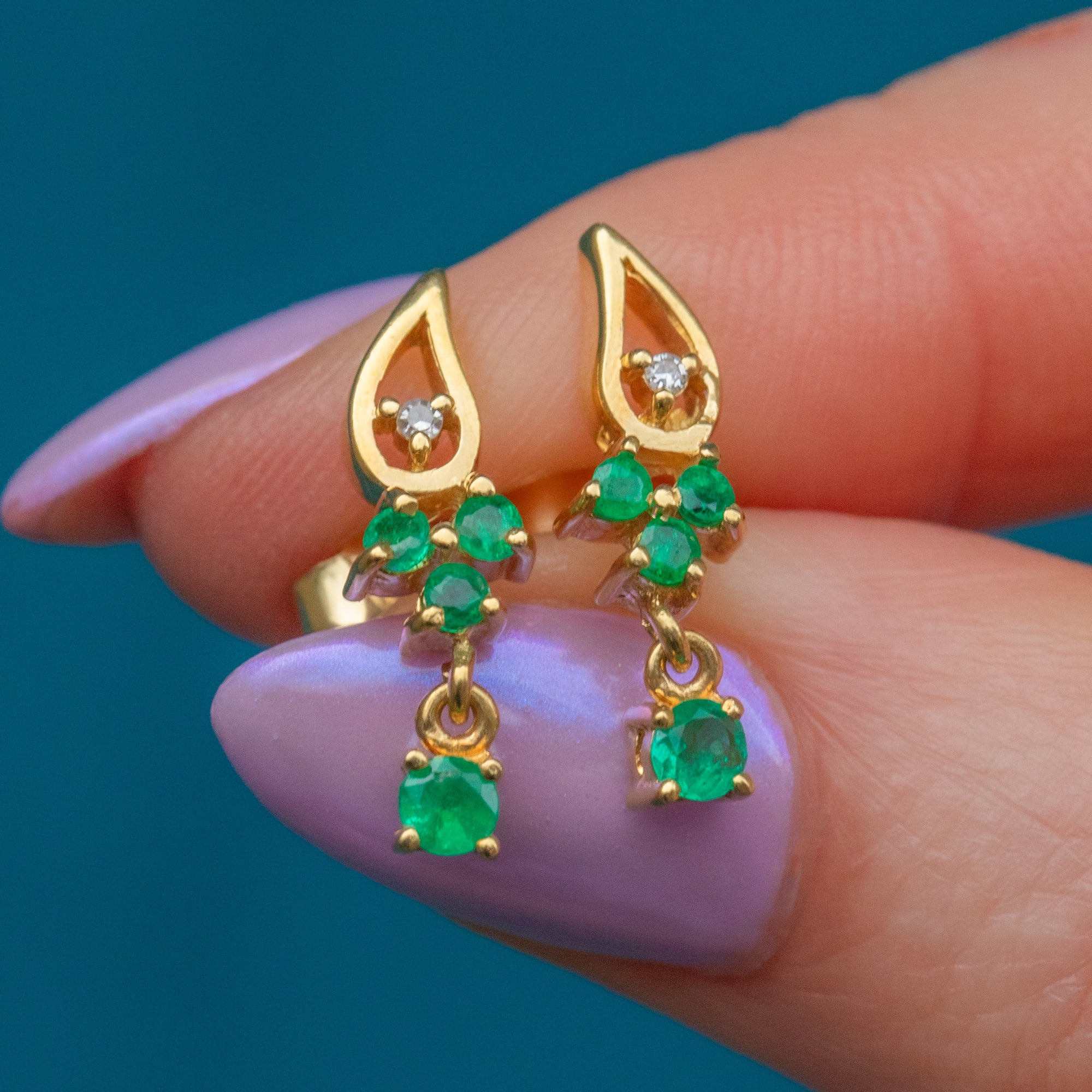 EXCELLENT. These 18ct Gold Emerald Diamond earrings are in excellent condition. The Gold is brightly saturated and the gemstones are all securely set, with no signs of surface wear. With snug-fitting butterfly backs, you can enjoy wearing these mid-century earrings with absolute confidence!