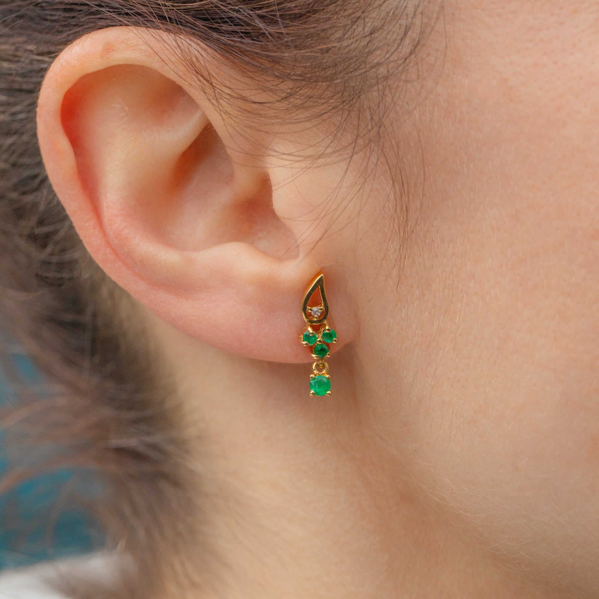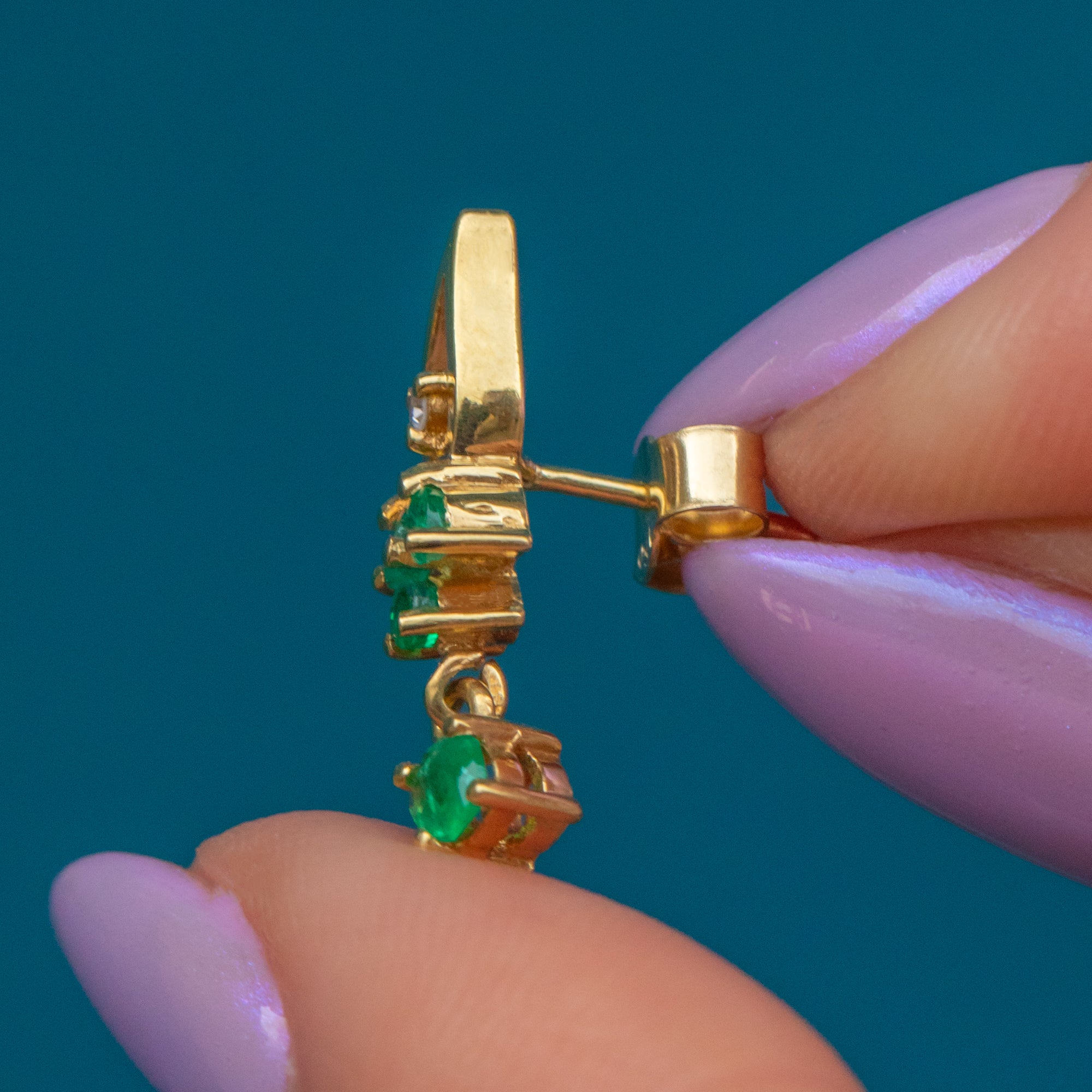 These elegant 18ct Gold Emerald Diamond earrings are an easy yes! Each stud features a distinct droplet form inlaid with a petite shimmering Diamond and suspending vibrant verdant Emeralds, all set in saturated 18ct Gold.