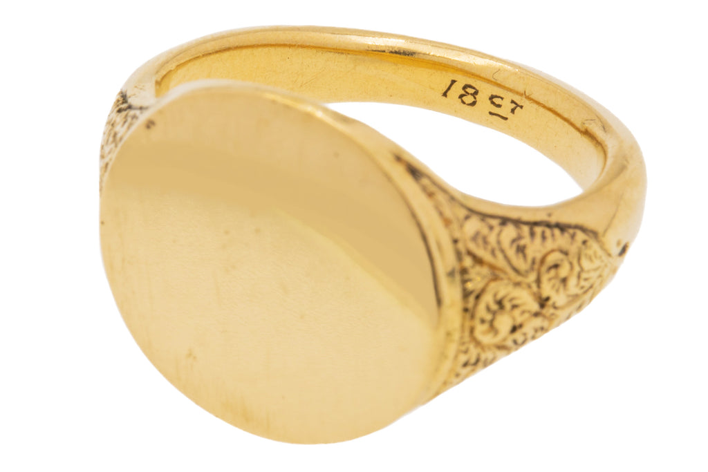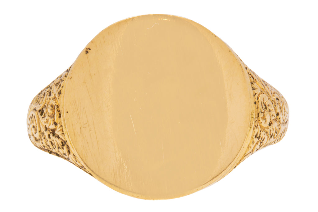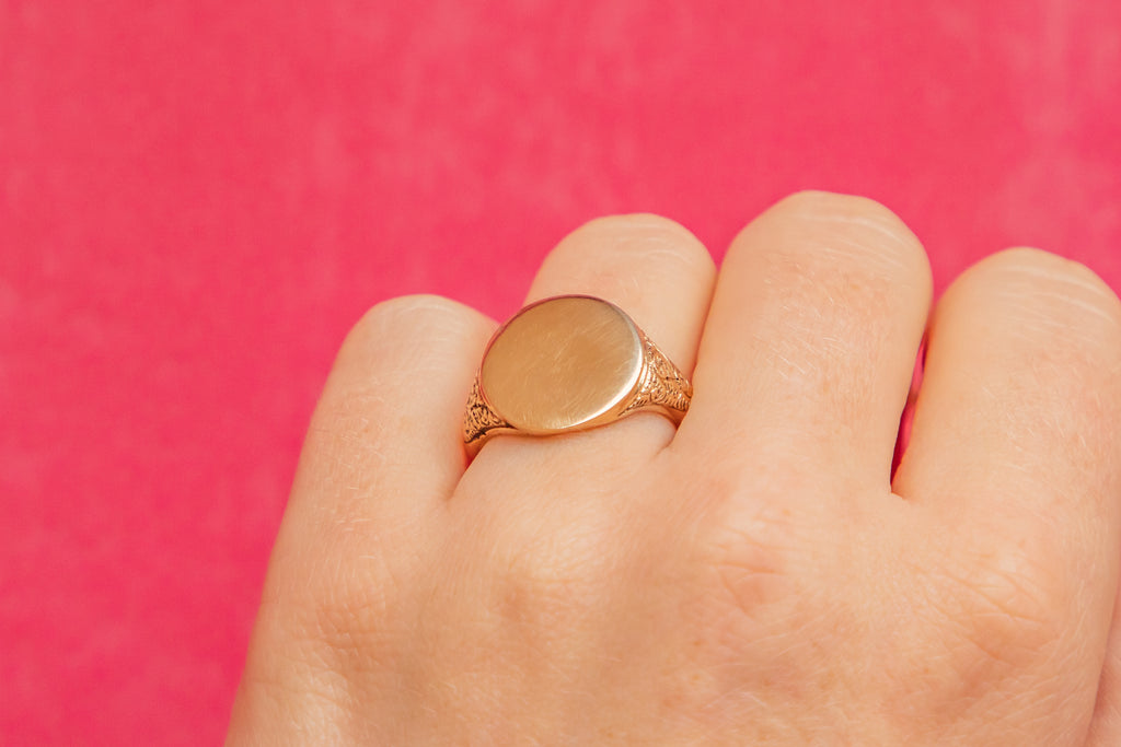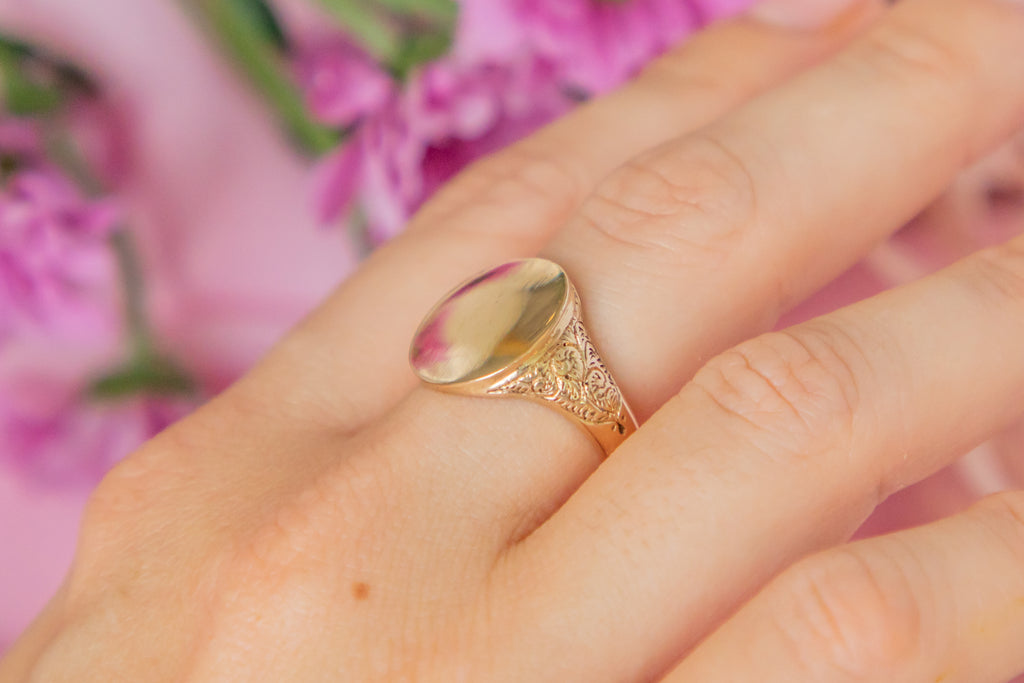 A fabulous 18ct Gold engraved signet ring! This chunky ring wears like an absolute dream, and we love how the front of the band is super smooth contrasting with the ornately detailed shoulders.