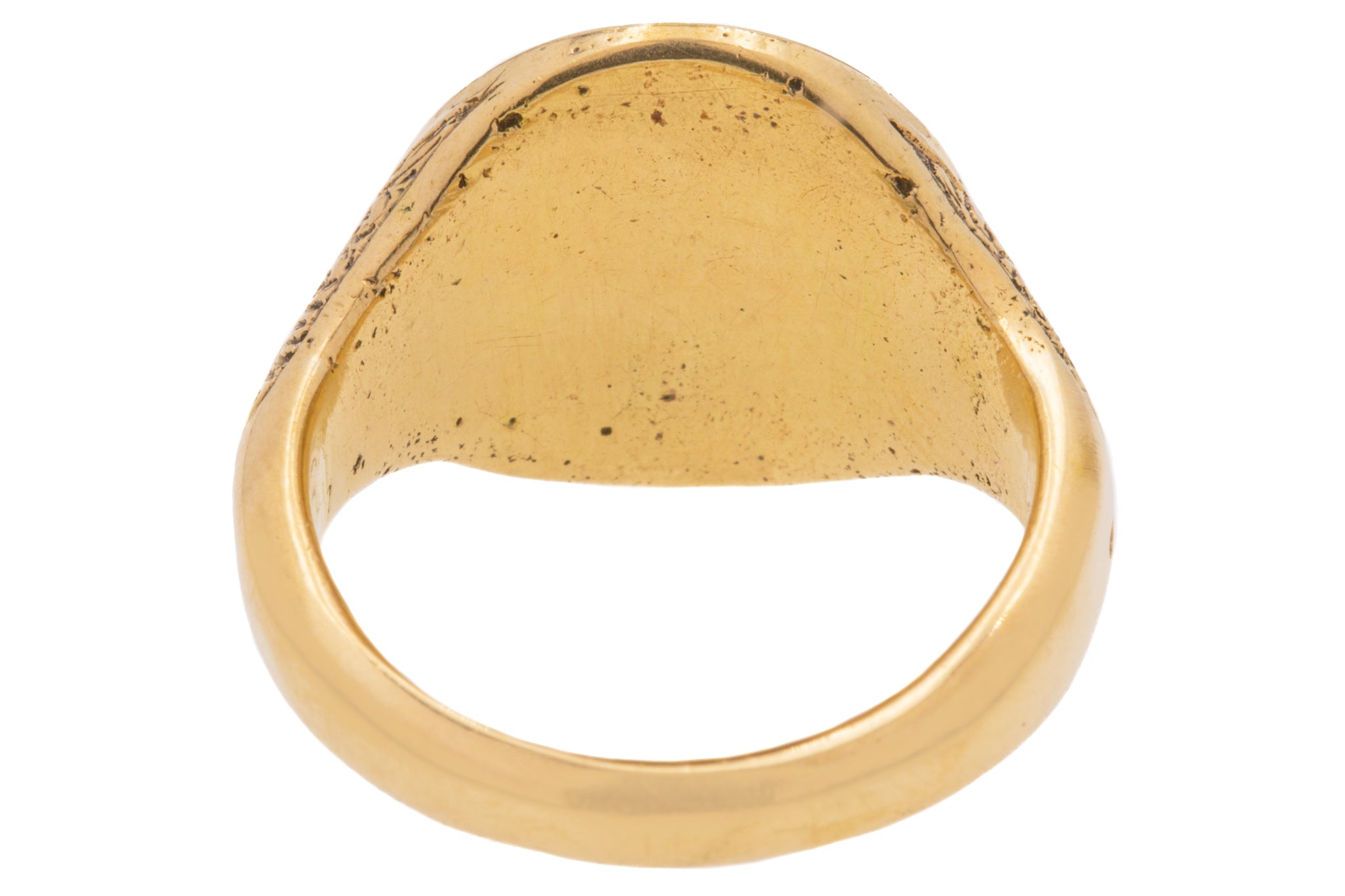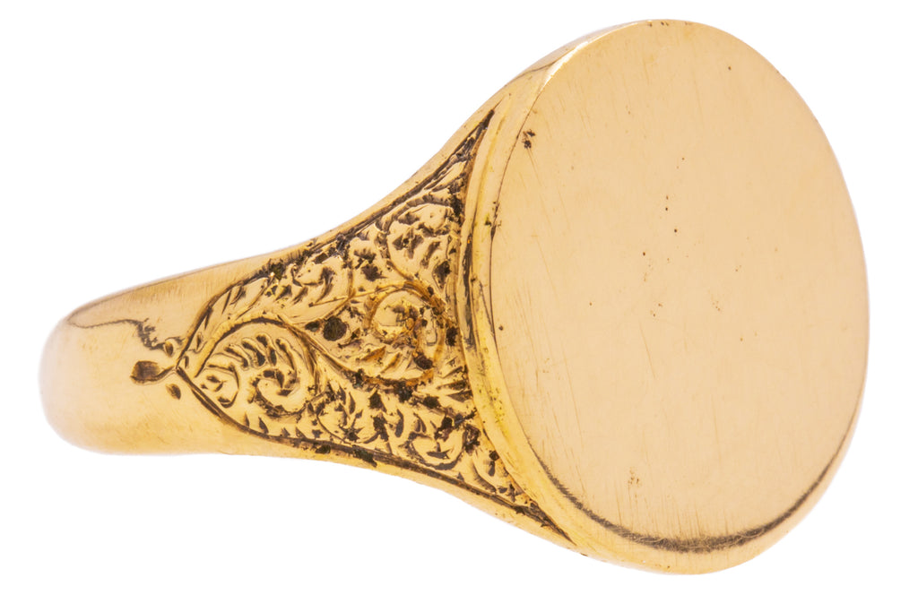 VERY GOOD. We absolutely adore this 18ct Gold engraved signet ring. This piece is a Victorian beauty, ripe with splendour and beautifully crafted. The Gold is absolutely divine and striking to the eye. The inside of the band has an '18CT' hallmark and the piece is smooth and comfortable to wear. This is a gorgeous piece with minimal wear to note, only to the inside of the band behind the signet face with a little porosity.