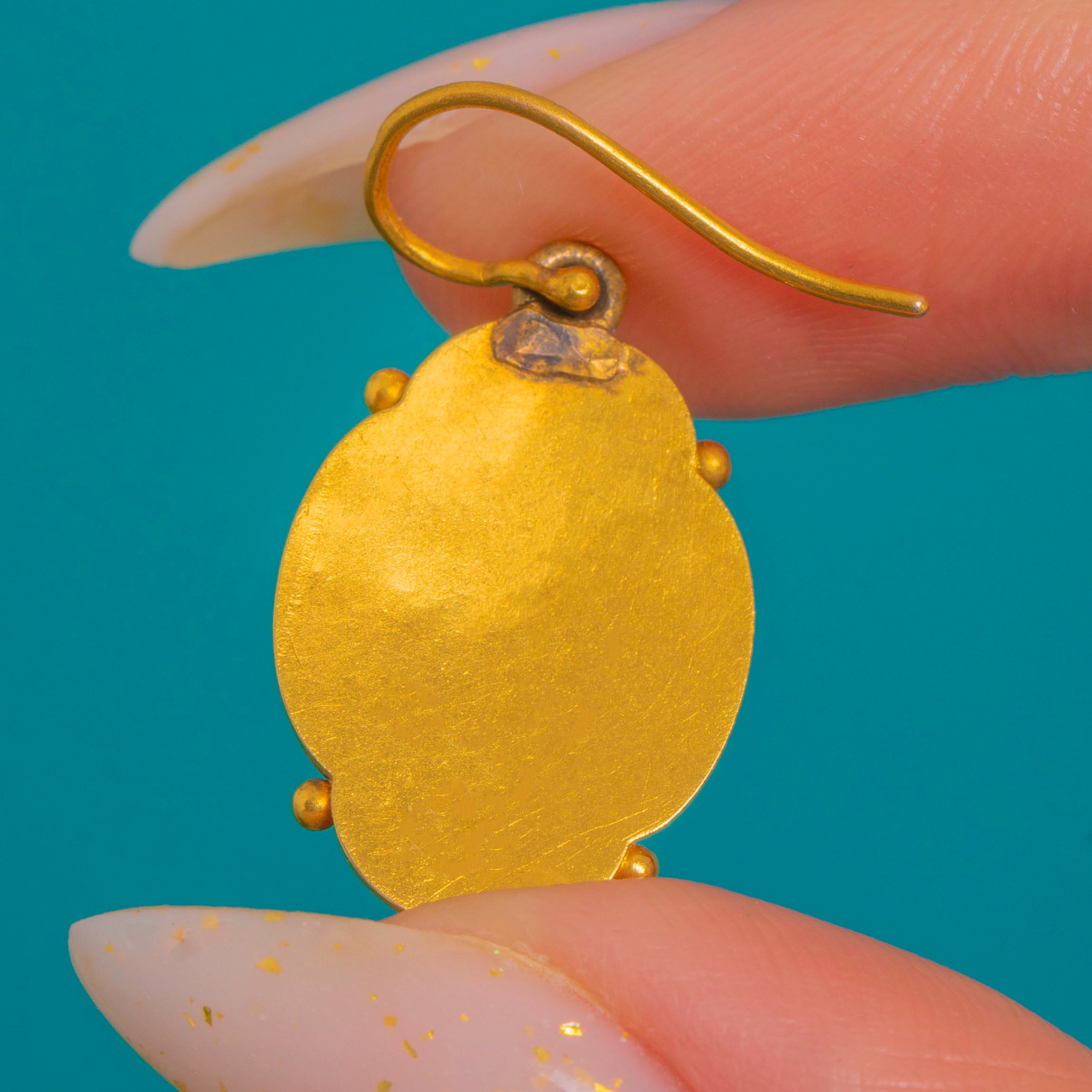 Elegant and ornate, these Victorian Etruscan Revival drop earrings are crafted in rich 18ct Gold. Each petite oval plaque is adorned with applied granulation, cannetille scrolls and a beaded border, centring an engraved eight‑point star set with a tiny white Pearl. The intricate wirework and beaded accents create a beautiful interplay of texture and light.