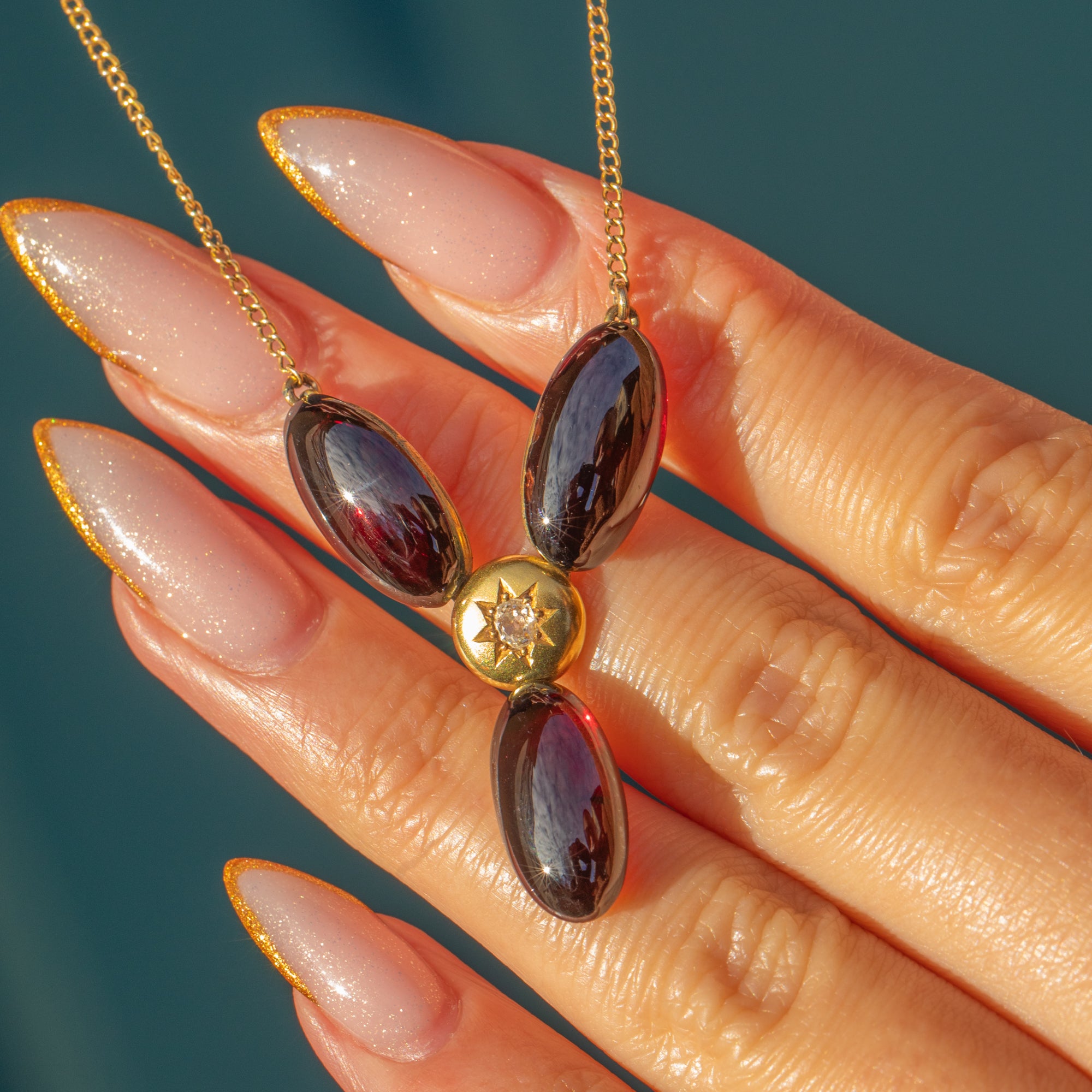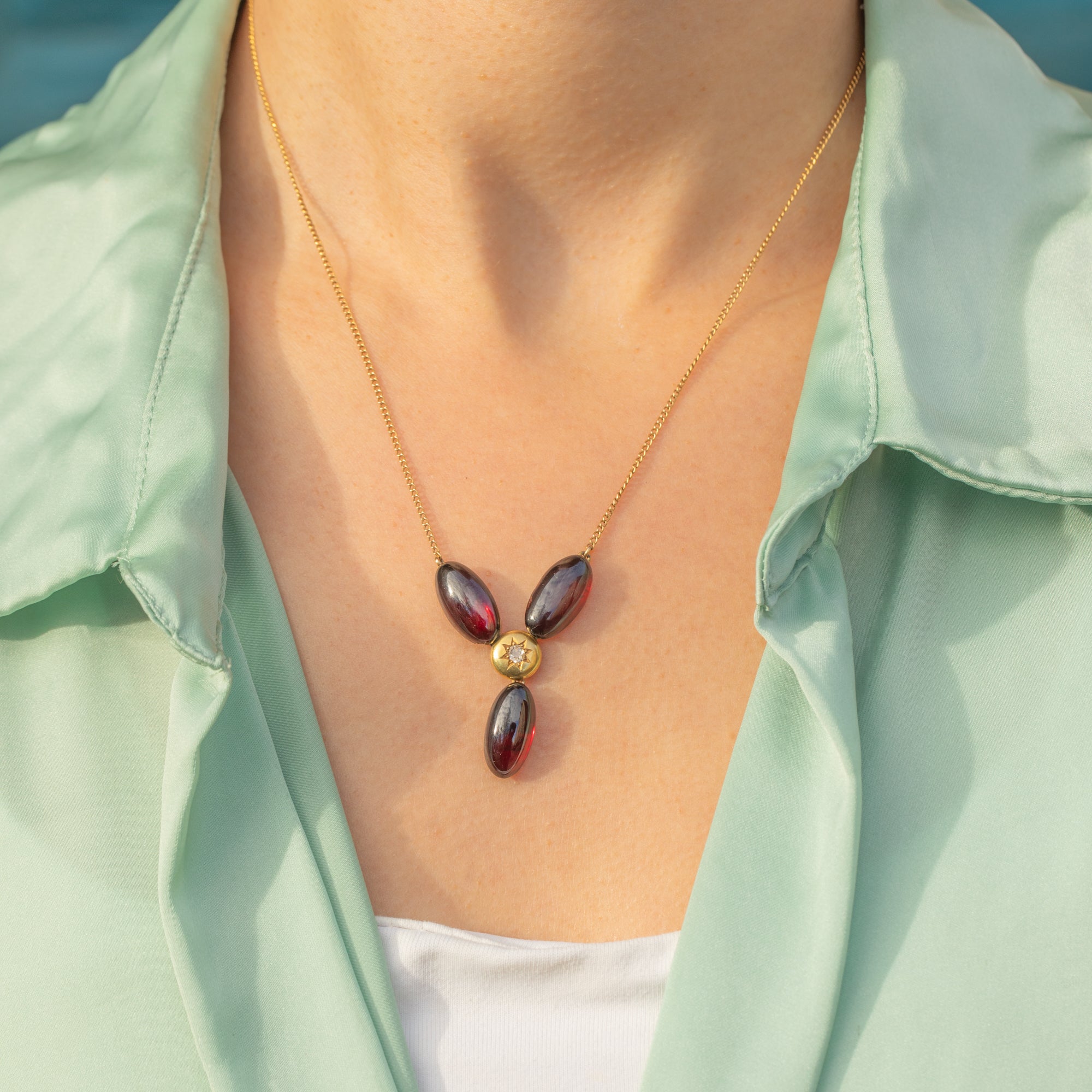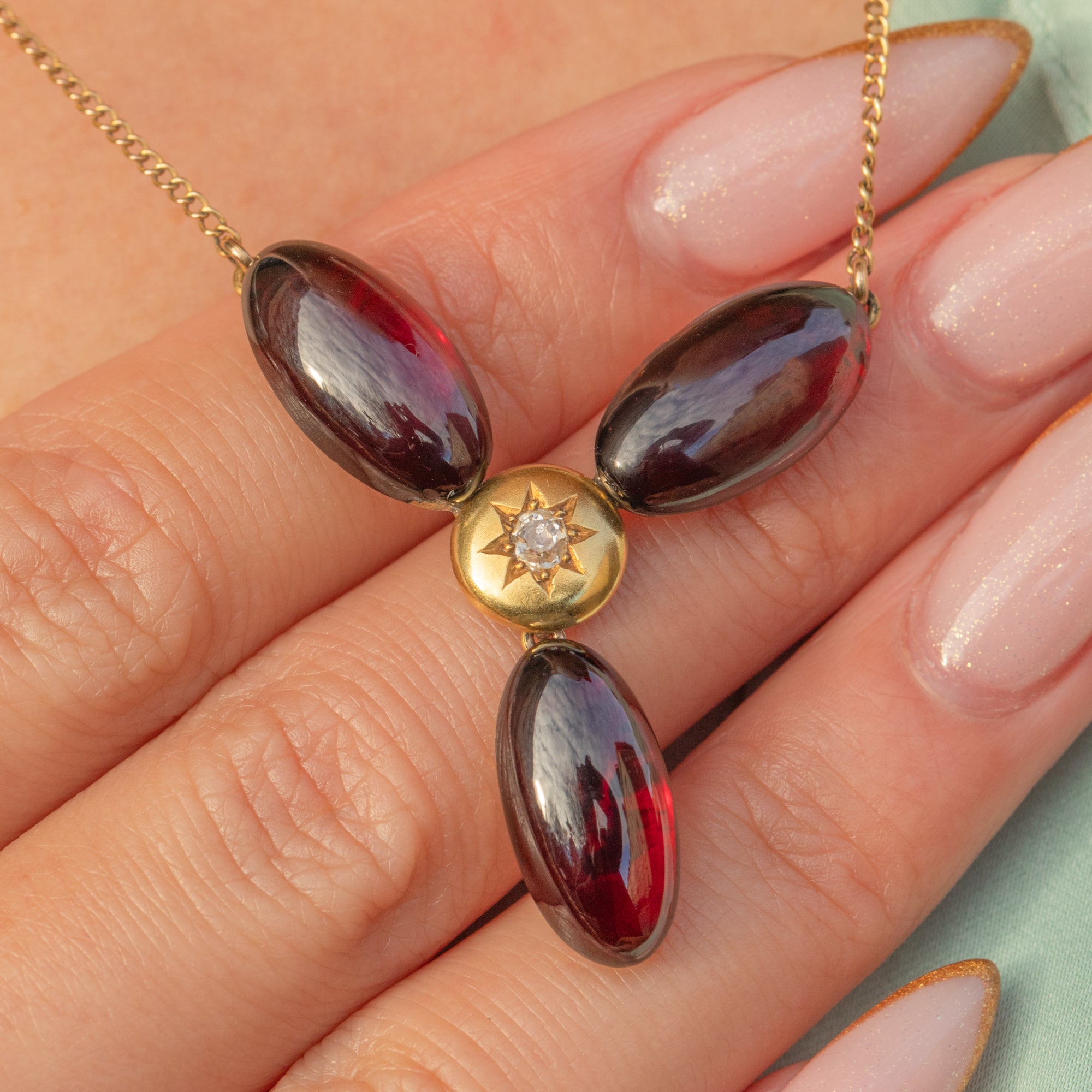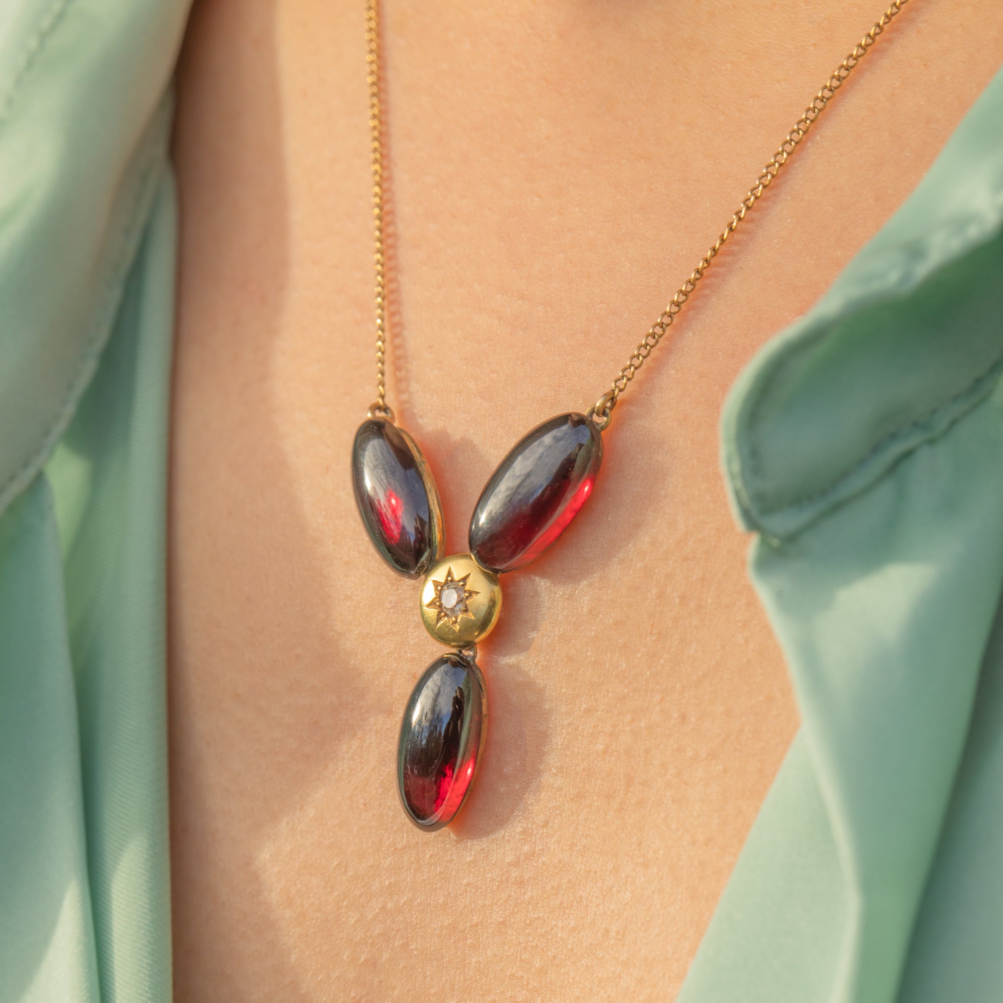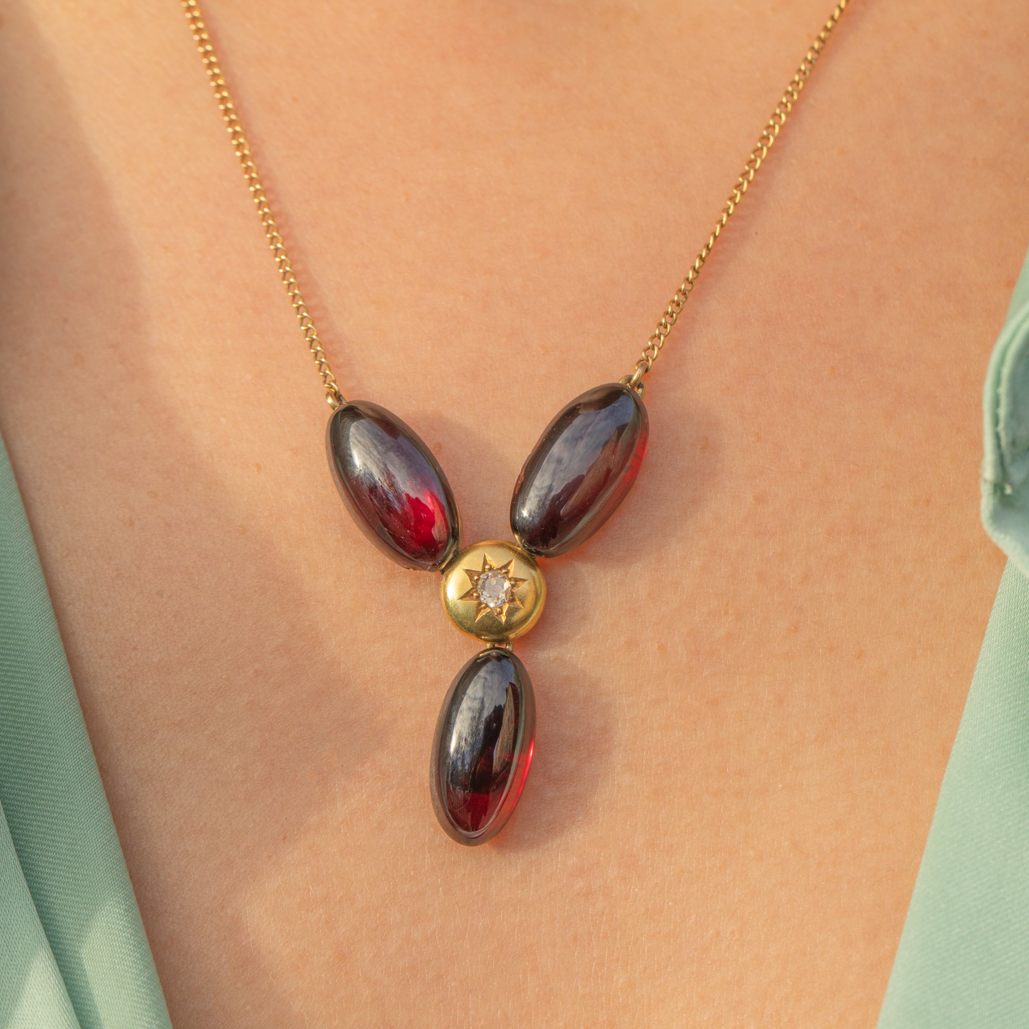 The Garnet cabochons have a deep, romantic red hue, while the central star-set Diamond adds a bright, delicate sparkle. Elegant, feminine and full of antique character, this Victorian necklace is a gorgeous choice for everyday wear or special occasions.