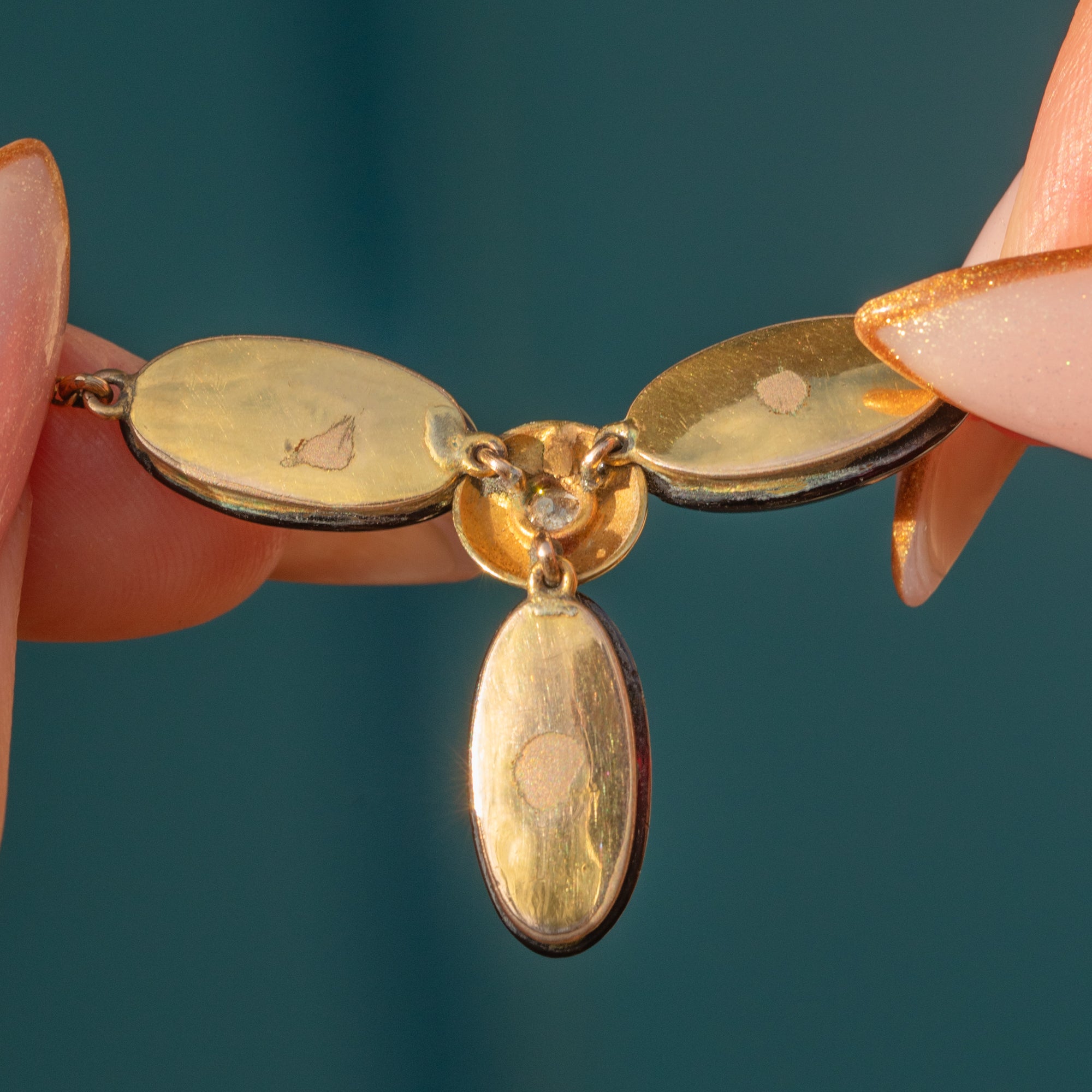 VERY GOOD: The Garnets are smooth with light surface wear expected of antique cabochons. The Diamond is bright and secure in its setting. Gold surfaces are well preserved overall, with some age-related wear to the back of the pendant. Chain and all settings remain strong and ready to wear.