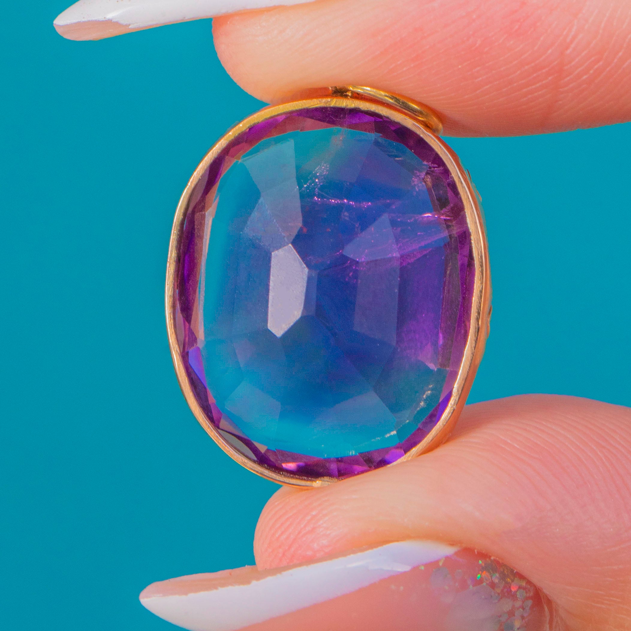 VERY GOOD: The Amethyst is securely set and displays natural fingerprint inclusions, colour zoning typical of Georgian gems. Light wear to facets in keeping with age, but no chips or cracks visible under close inspection. The Gold bezel and jump ring are well-formed and structurally sound. A beautifully preserved early pendant.