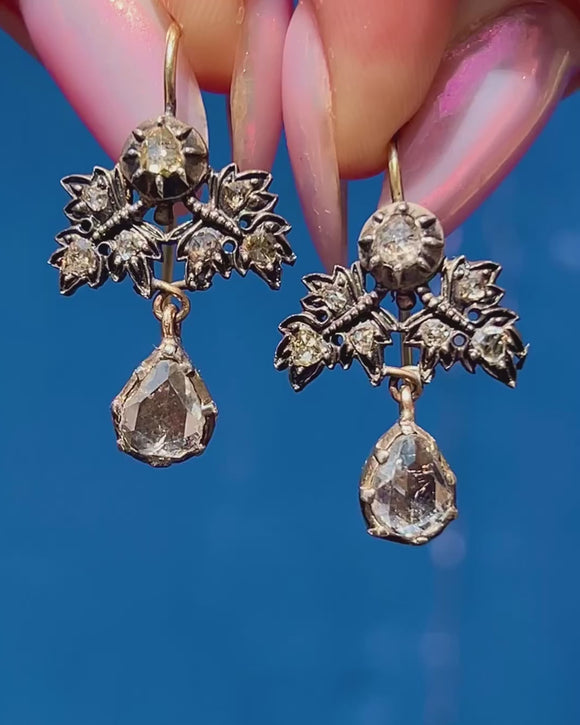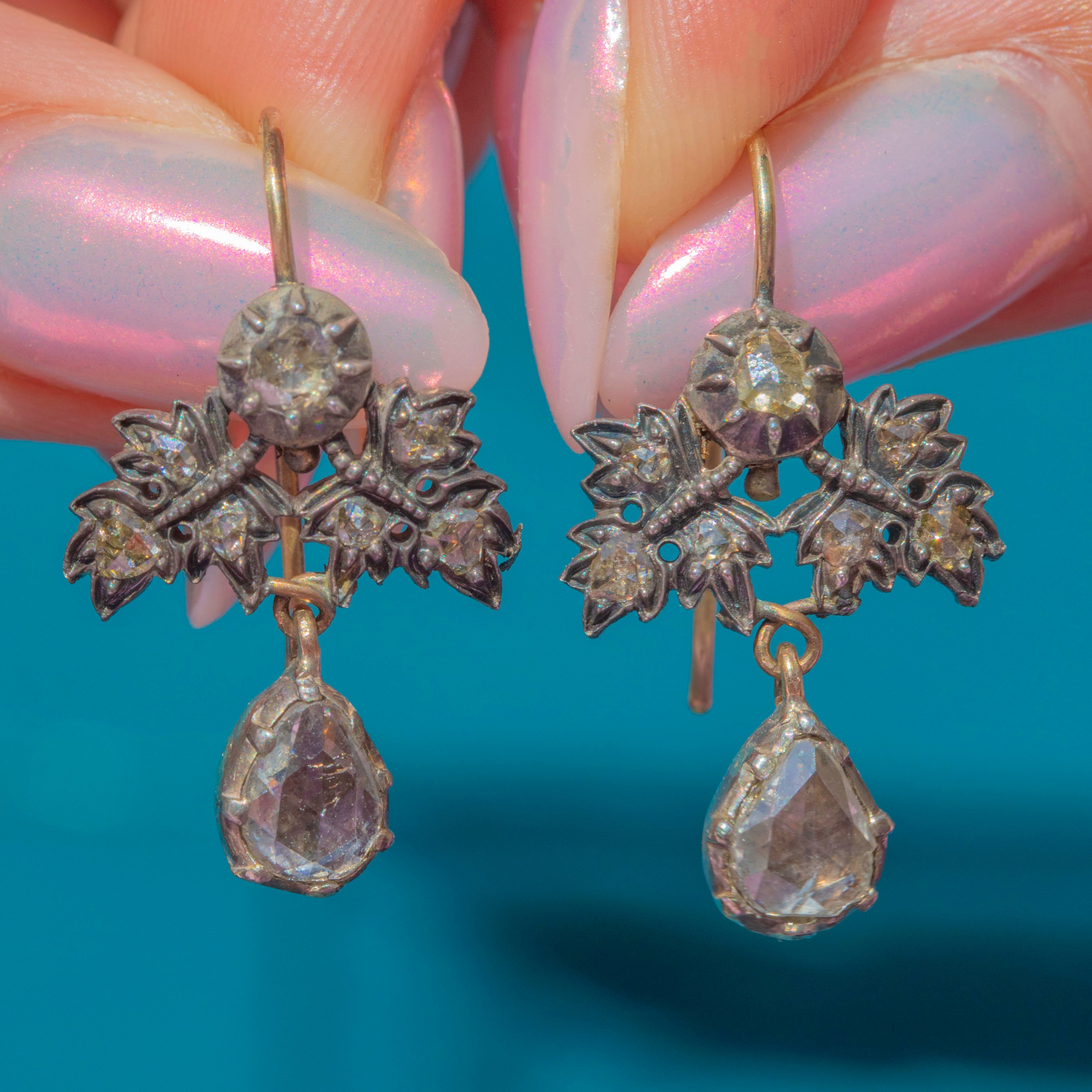 Complete with Silver settings, 18ct Gold hooks and rare Georgian rose-cut Diamonds, these antique earrings are certainly show stoppers!