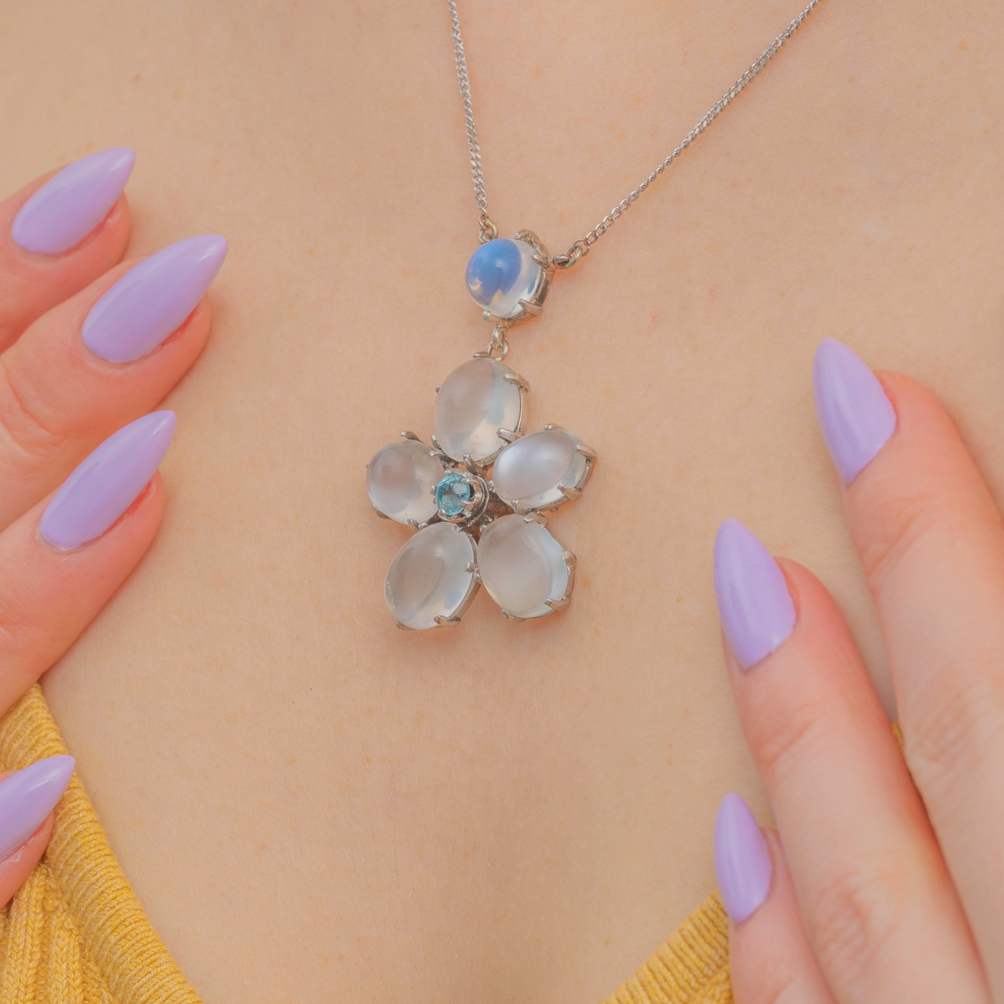 This 18ct Gold Moonstone and Blue Zircon flower drop necklace is just adorable!