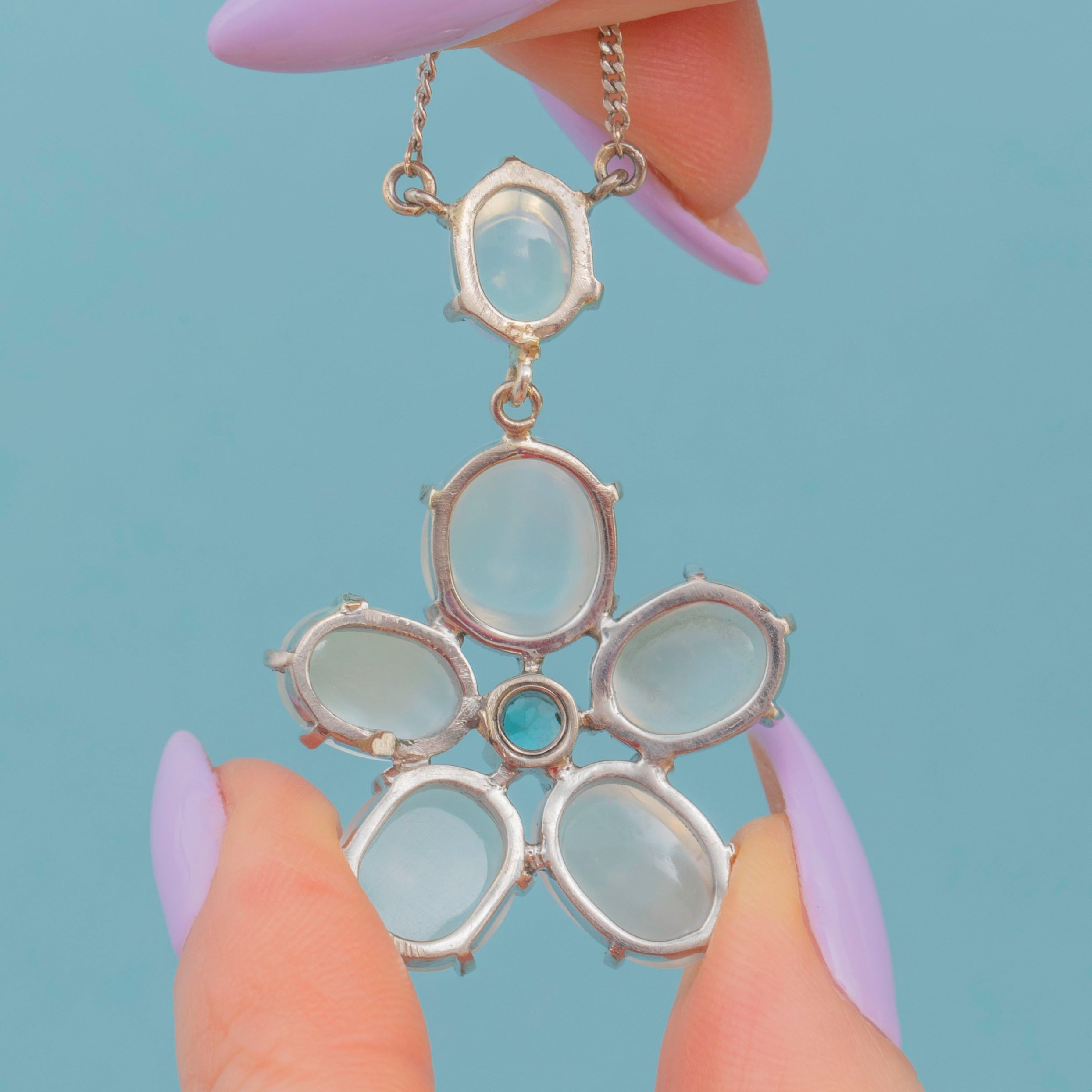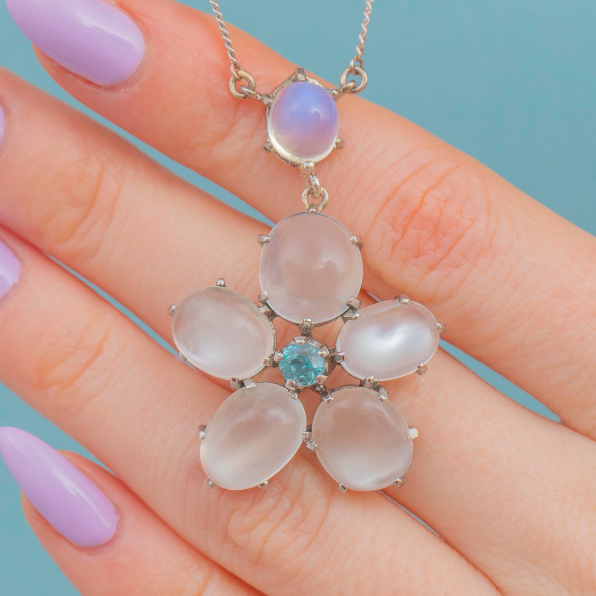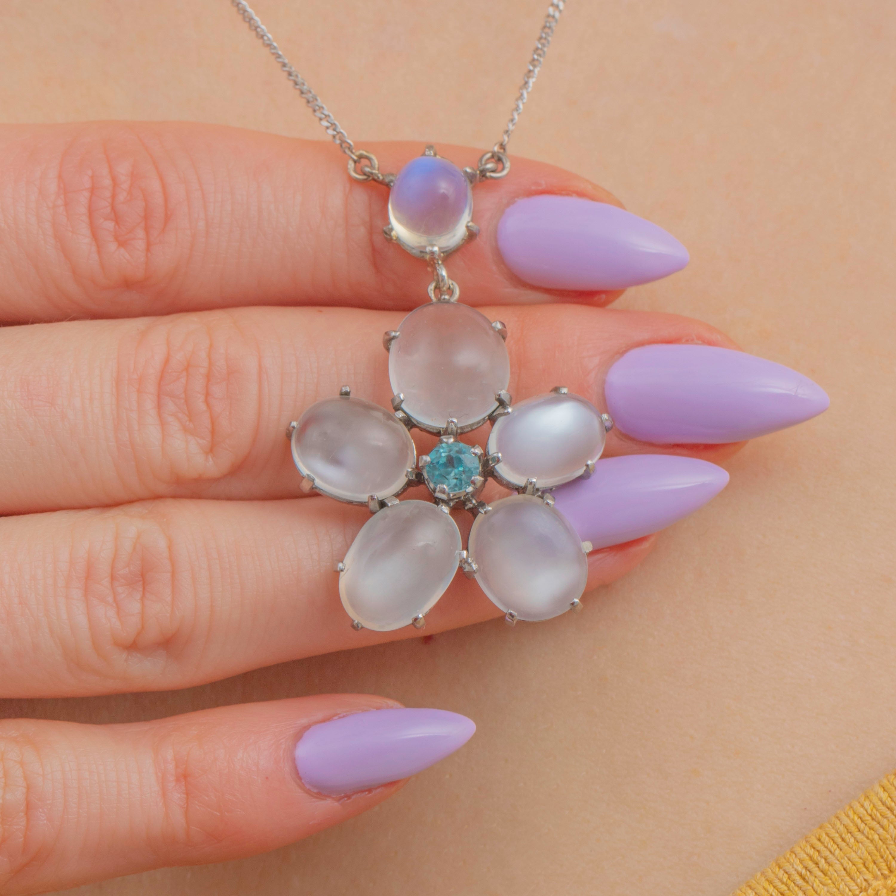 Six plump Moonstones are arranged in a gorgeous flower design, each billowing a wonderful silvery-blue adularescence. Her floral motif is centred by a vibrant blue Zircon, radiating gorgeous icy blue hues, effortlessly complimenting the softness of her surrounding Moonstones.