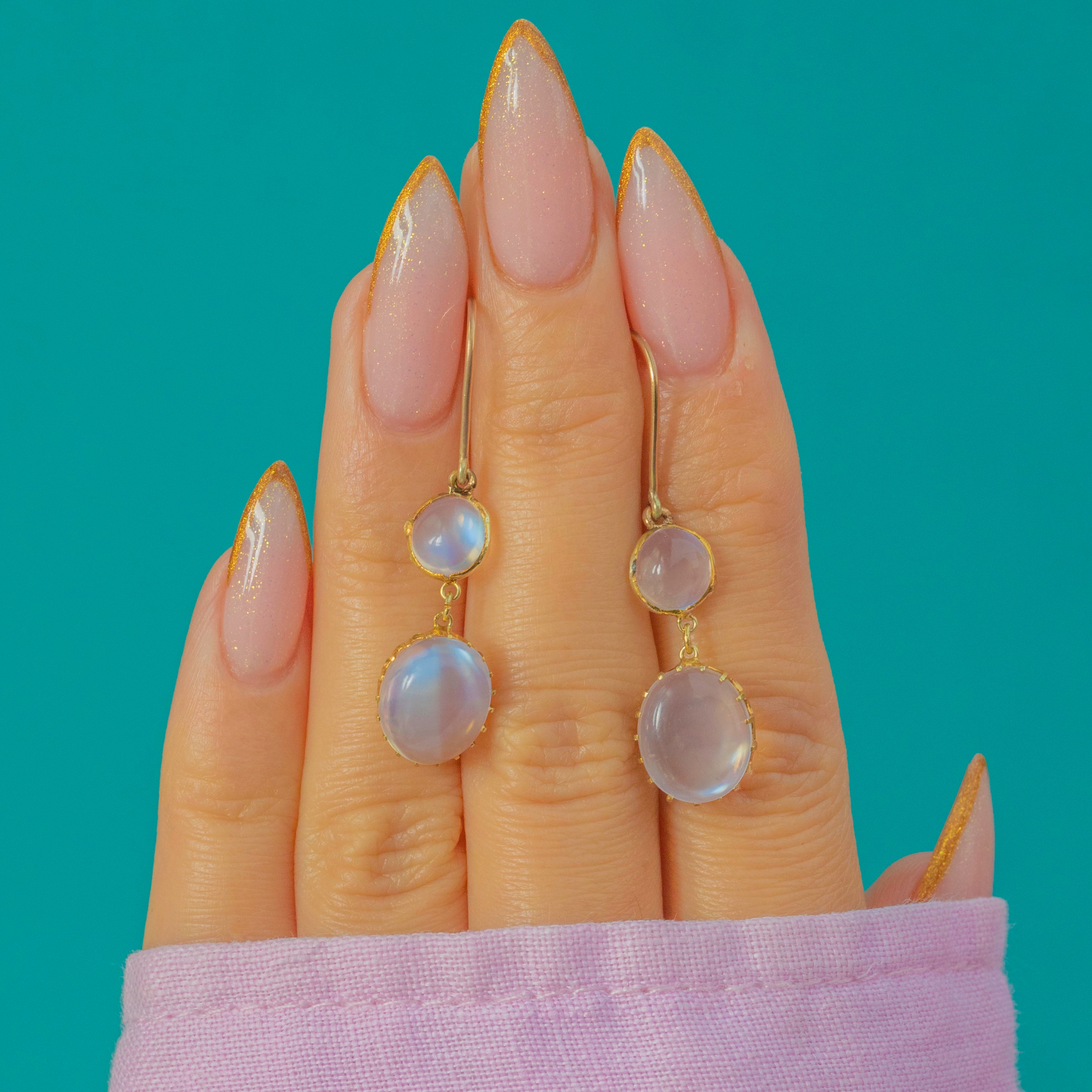 These glowing Victorian Moonstone earrings boast an ethereal double-drop design crafted in rich 18ct Gold. Each earring features a luminous round Moonstone above a larger oval cabochon, creating a beautiful play of adularescent blue light with every movement.