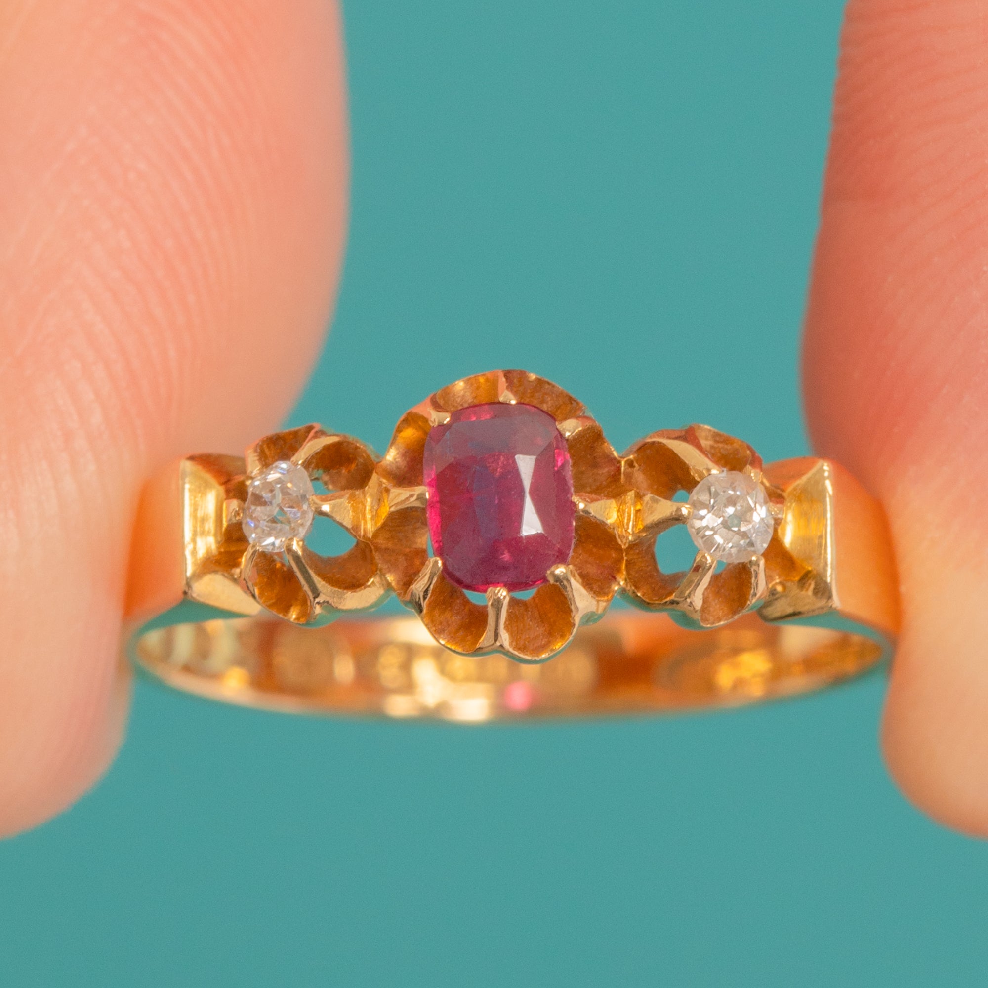 A romantic Belle Époque trilogy ring in rich 18ct Gold, set with a deep pink-red Natural Ruby in old cushion cut between two sparkling old mine cut Diamonds. The stones sit in characterful buttercup settings, with subtly scrolled, tapered shoulders flowing into a polished shank.