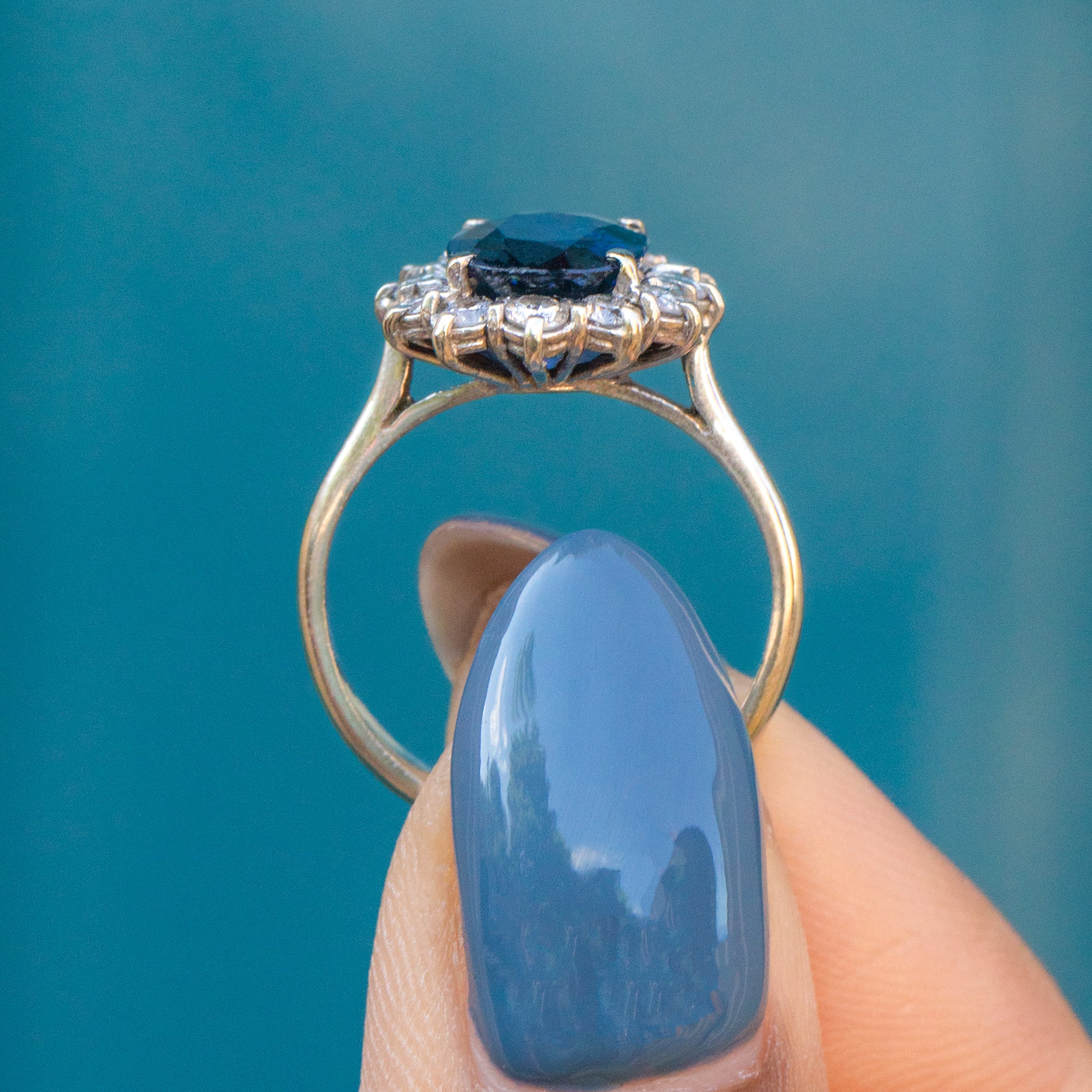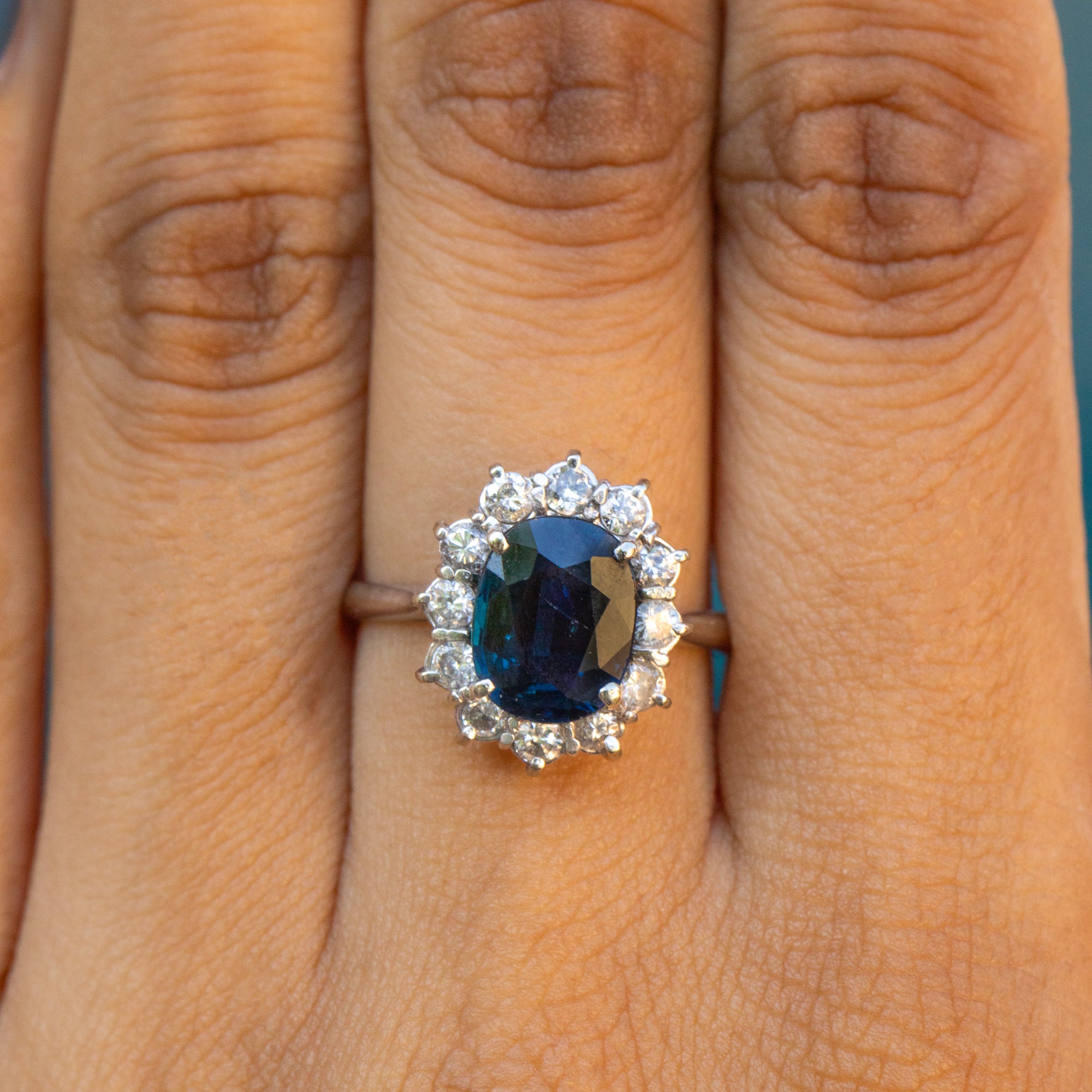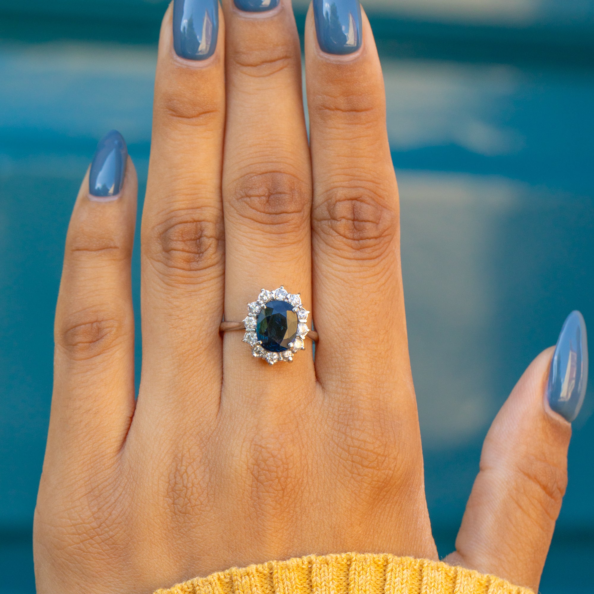 EXCELLENT. This lovely 18ct Gold natural Sapphire Diamond cluster ring is in excellent condition. The beautiful 1.40ct deep blue natural and unheated Sapphire and earth-mined Diamonds are securely set in their 18ct White Gold settings and are free from any chips or damage to note. The ring gallery is fully intact, and she shows no signs of previous resizing. With unmatched beauty, she makes the perfect engagement ring choice!