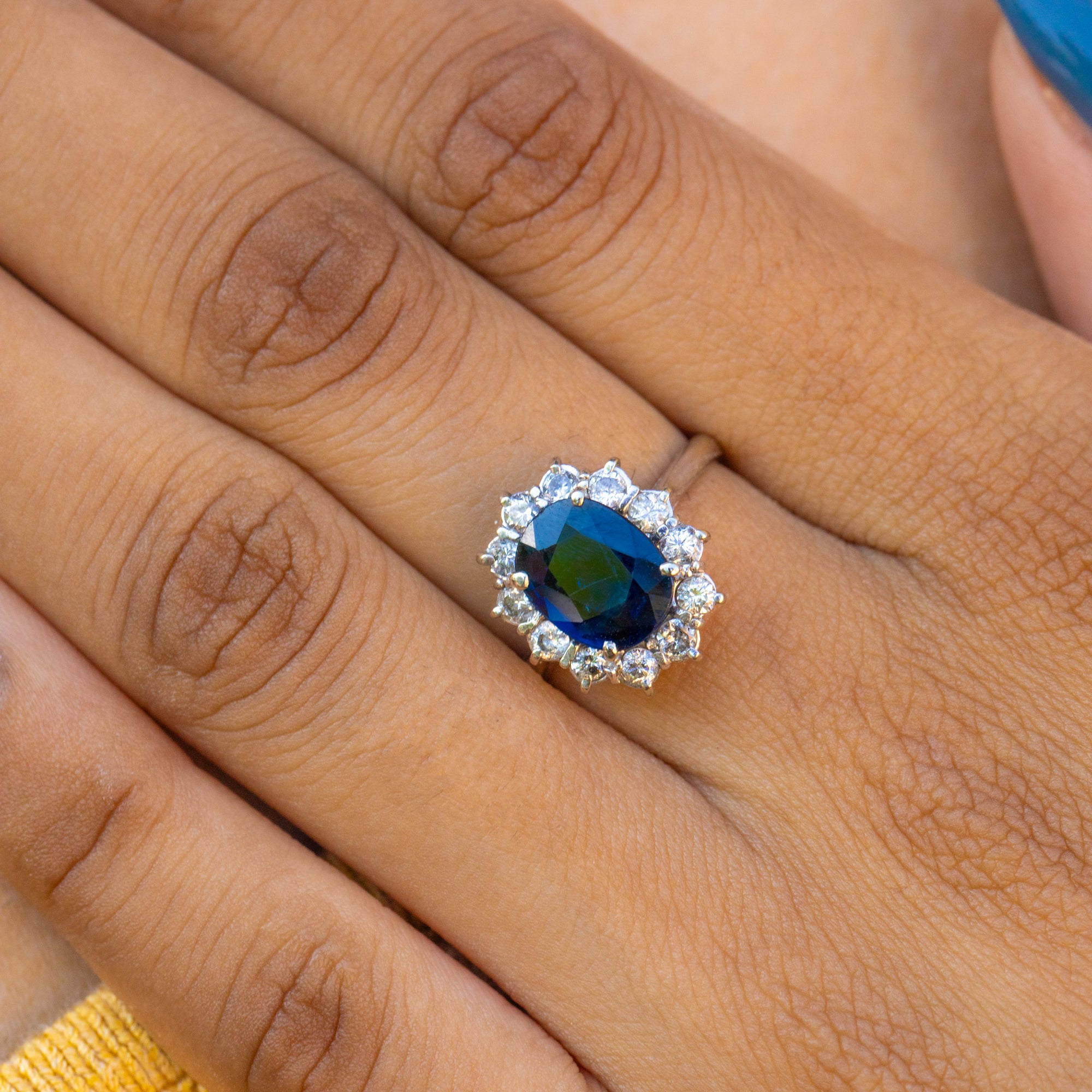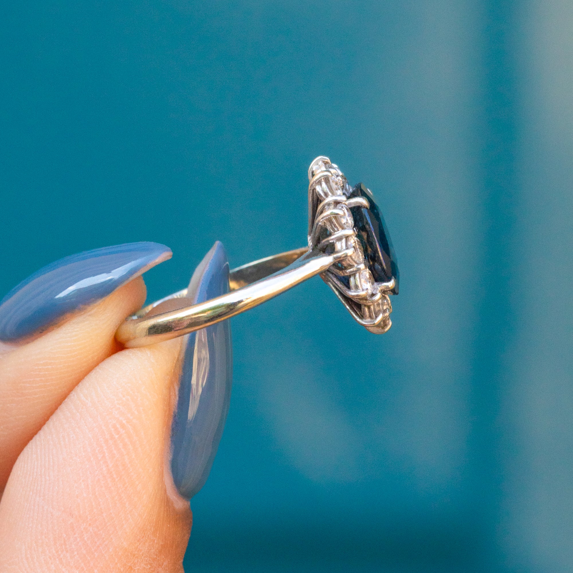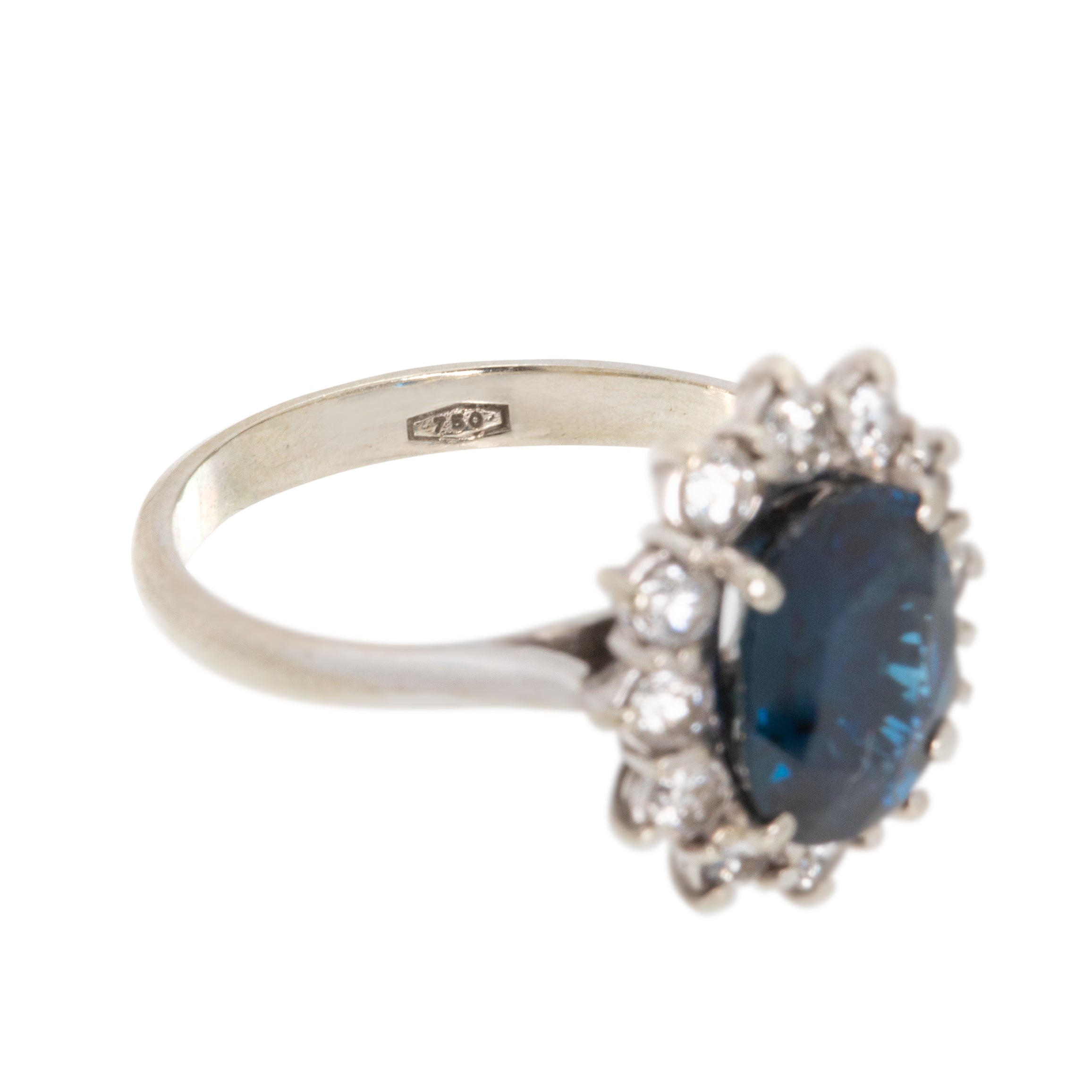 EXCELLENT. This lovely 18ct Gold natural Sapphire Diamond cluster ring is in excellent condition. The beautiful 1.40ct deep blue natural and unheated Sapphire and earth-mined Diamonds are securely set in their 18ct White Gold settings and are free from any chips or damage to note. The ring gallery is fully intact, and she shows no signs of previous resizing. With unmatched beauty, she makes the perfect engagement ring choice!