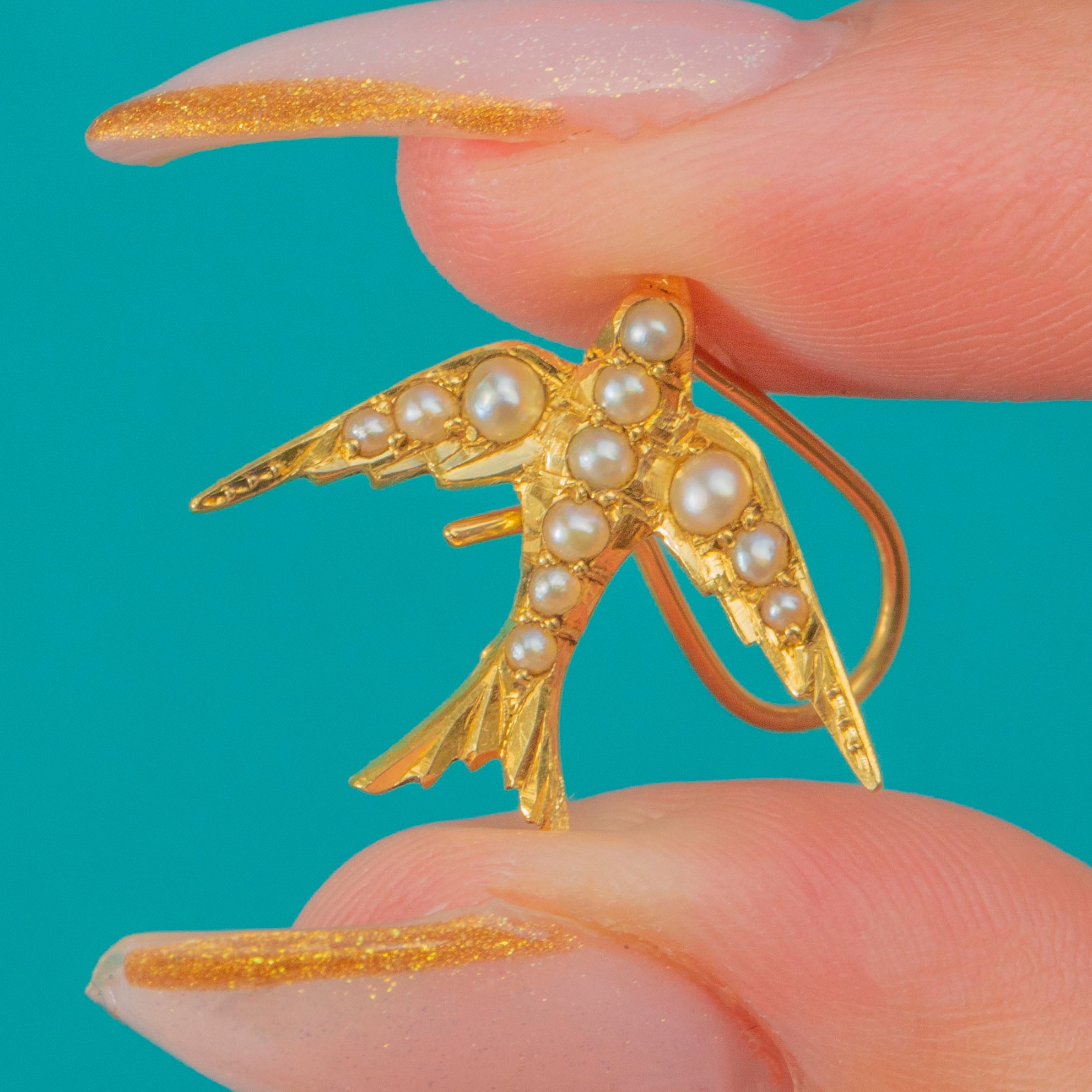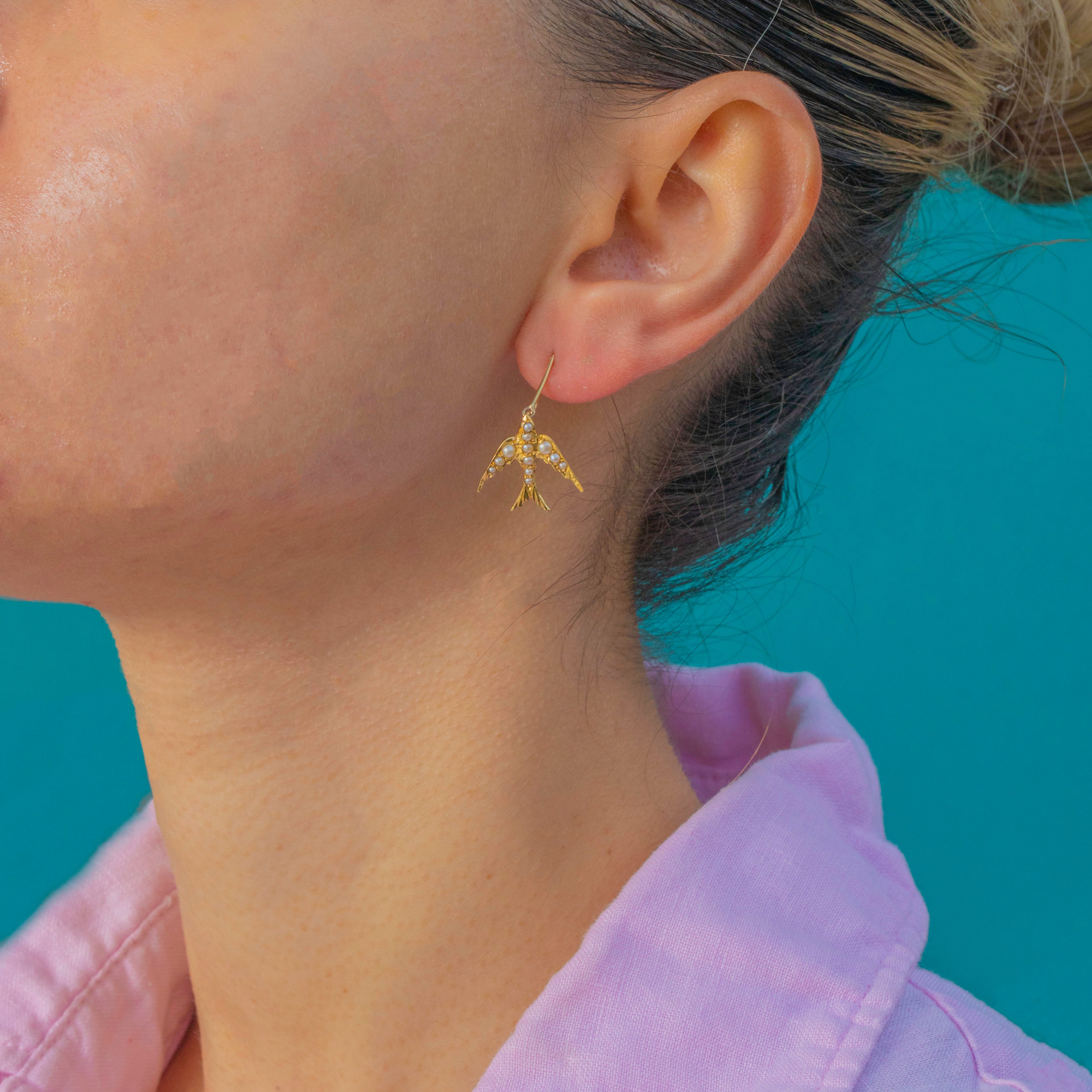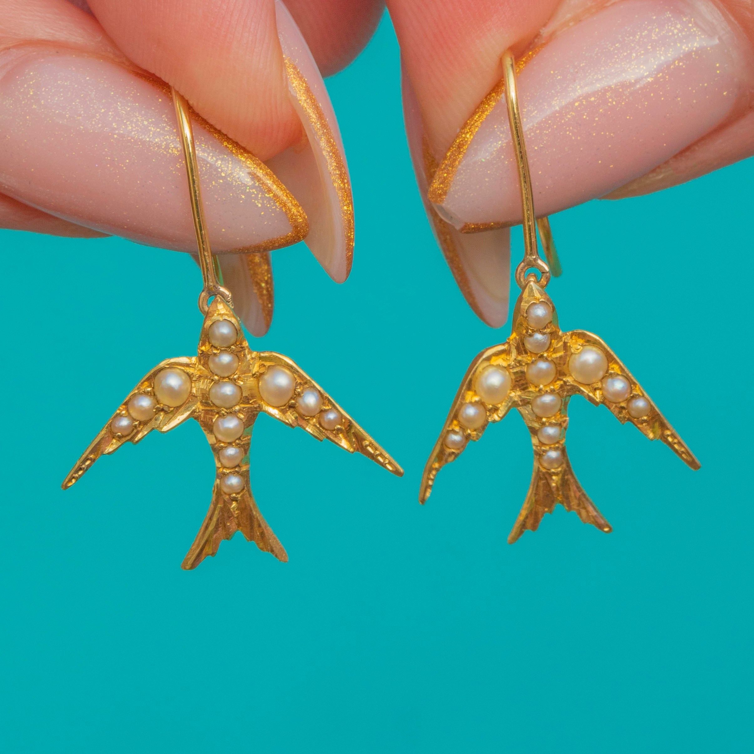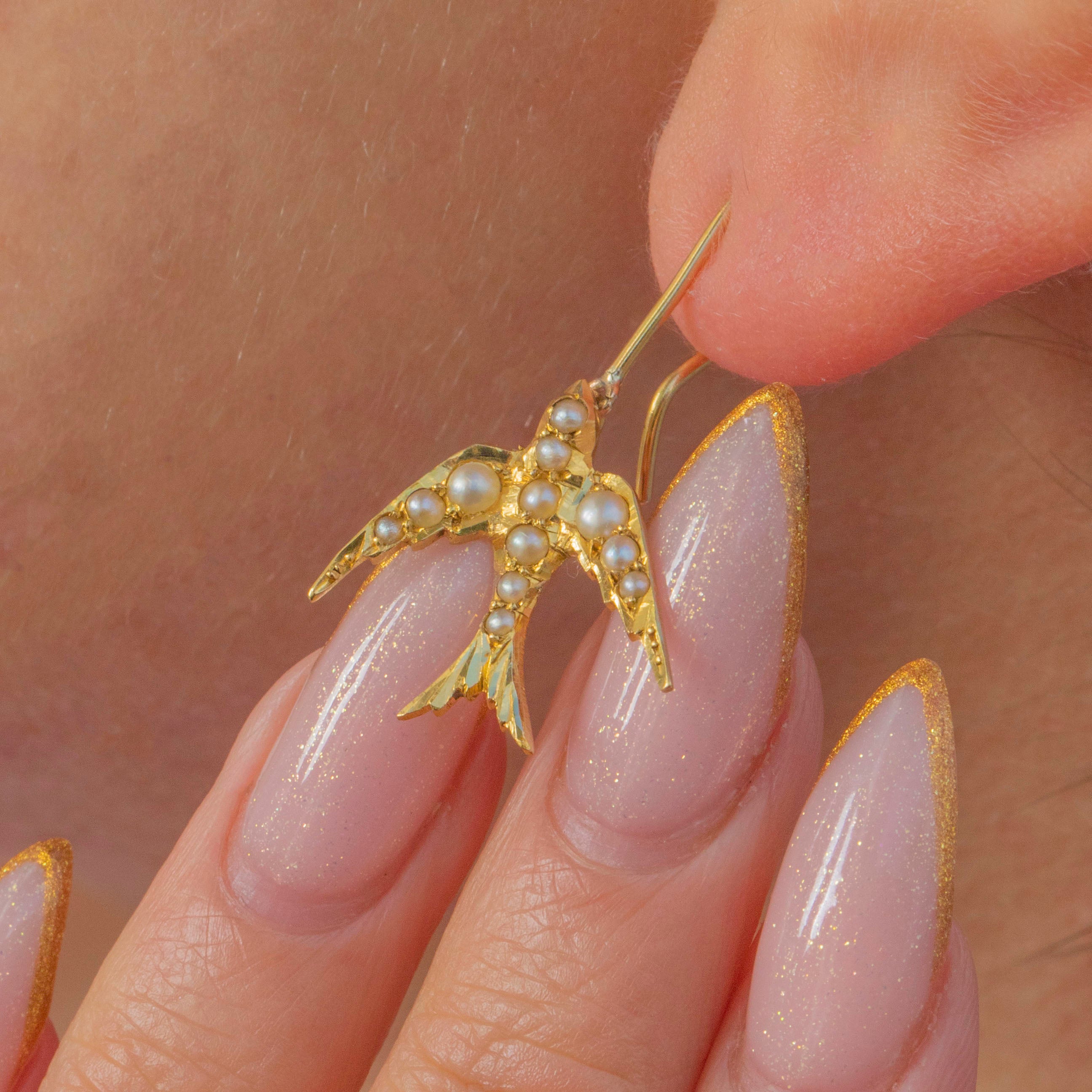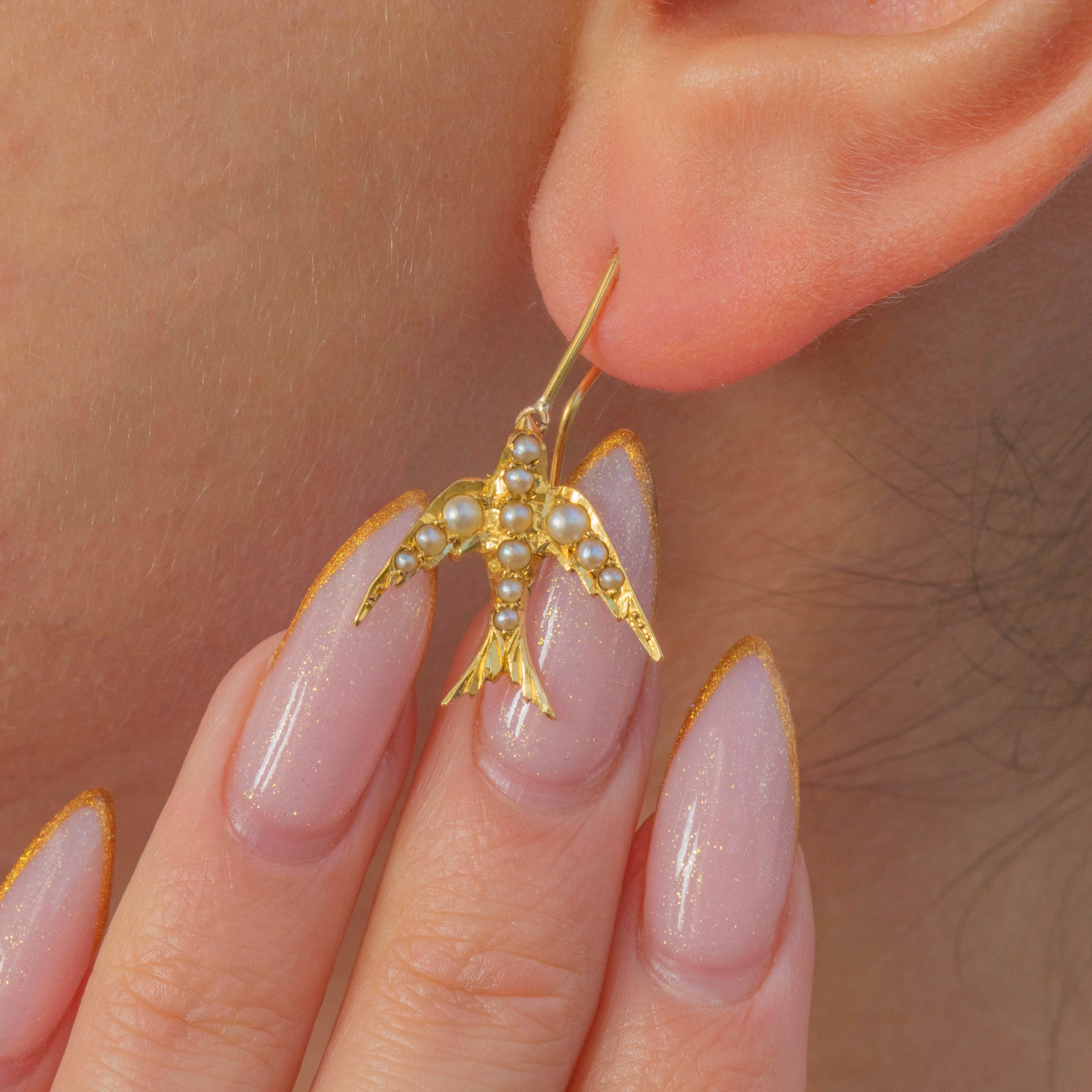 These Edwardian 18ct Gold Swallow earrings are a charming symbol of love and loyalty. Each Swallow is set with tiny Seed Pearls, giving them a soft, lustrous glow that catches the light beautifully.