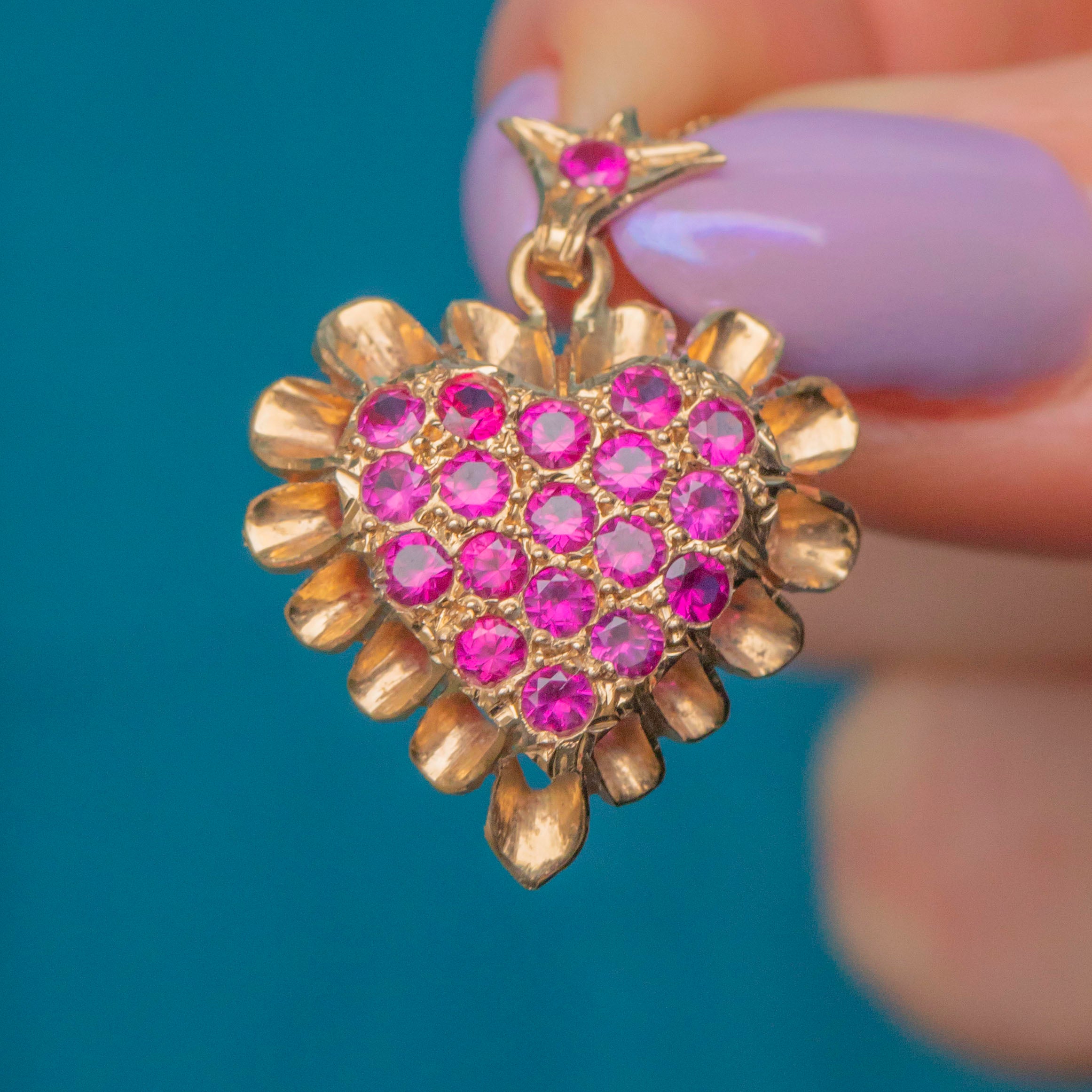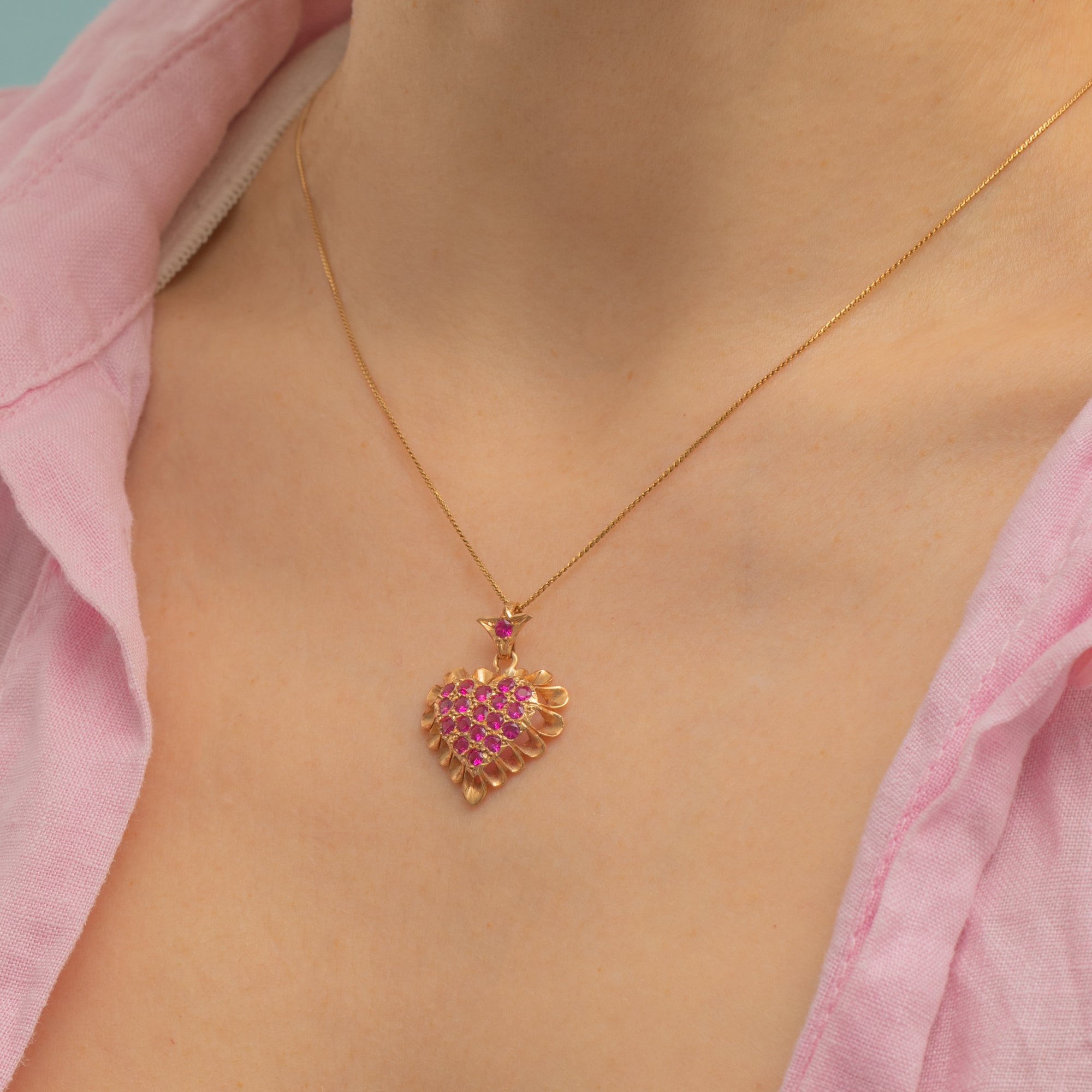 A 20" chain suspends an 18ct Gold pave heart pendant, adorned with a myriad of vibrant fuchsia Sapphires. With 19 pink Sapphires weighing 0.66ct in total, this vintage pendant is bursting with character and vibrancy.
