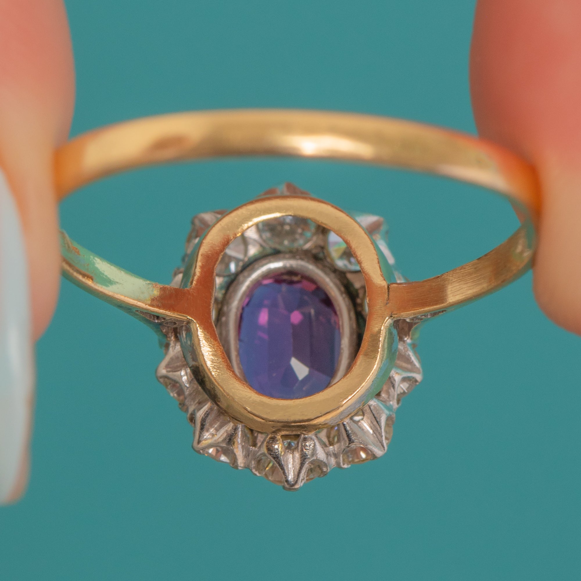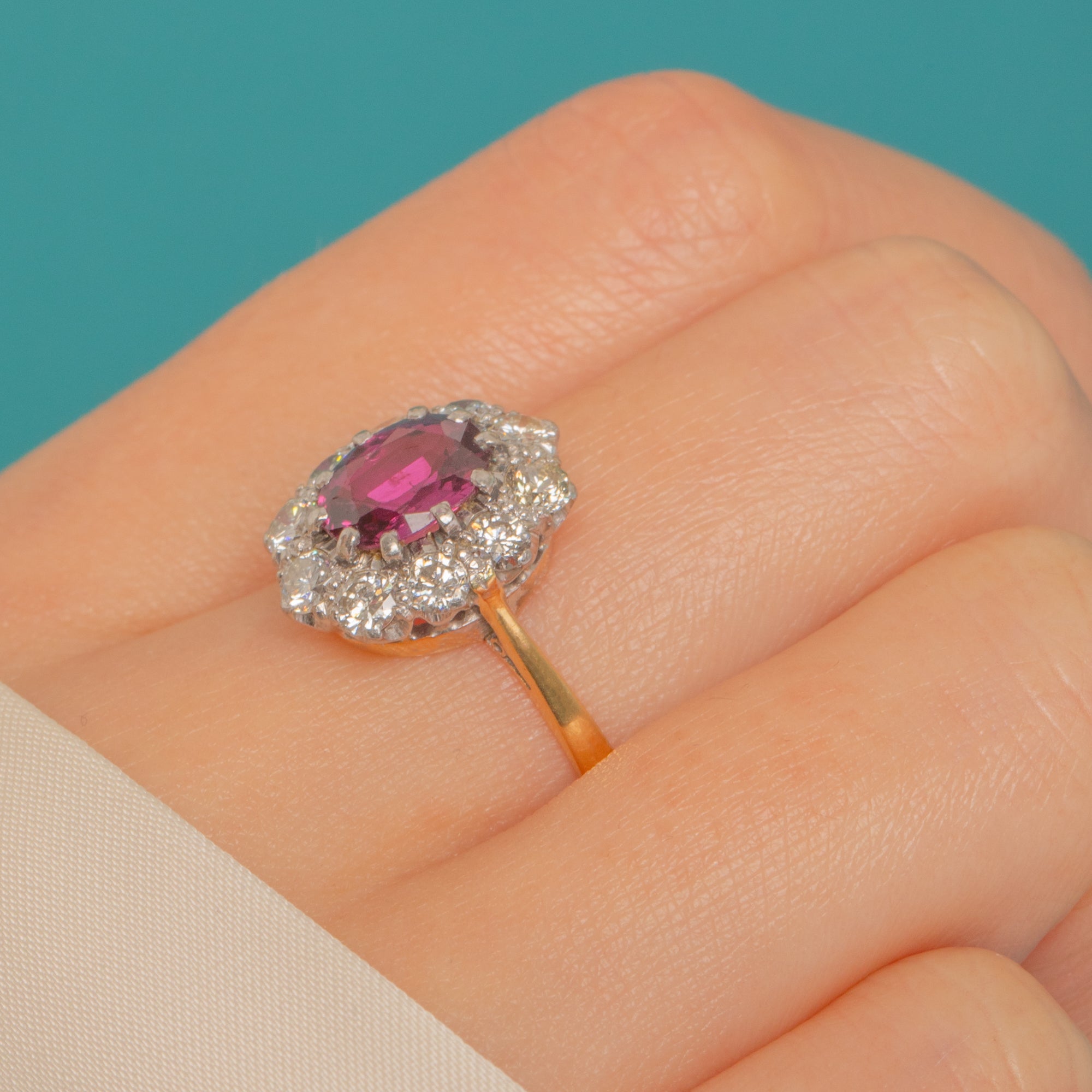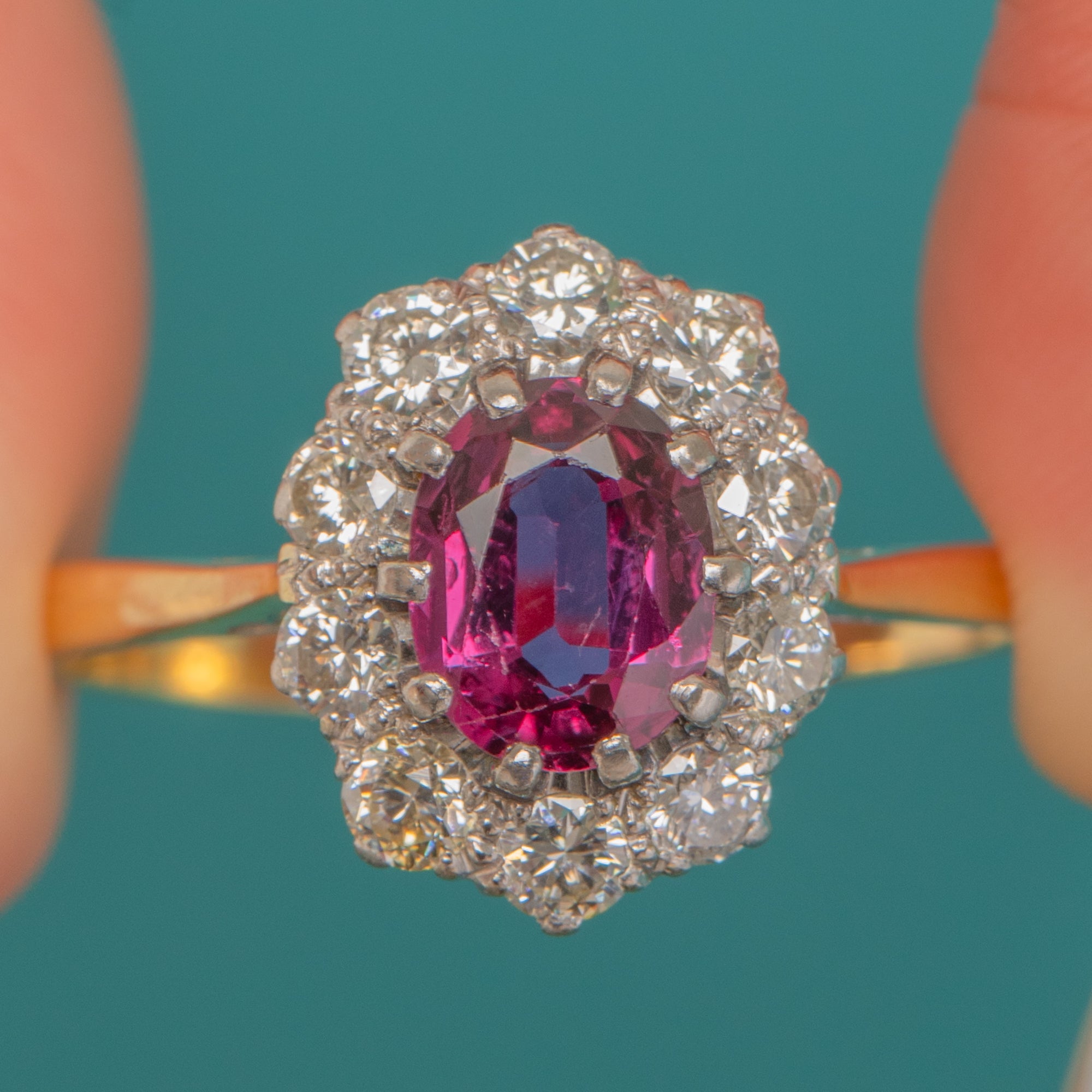 A beautifully poised Vintage cluster ring, crafted in rich 18ct Gold with elegant Platinum settings. At its heart sits a vivid oval Ruby, its saturated pink‑to‑purple hue framed by a scalloped halo of bright Diamonds. Fine bead and millegrain edges lend delicate texture and definition, enhancing the classic rosette silhouette.