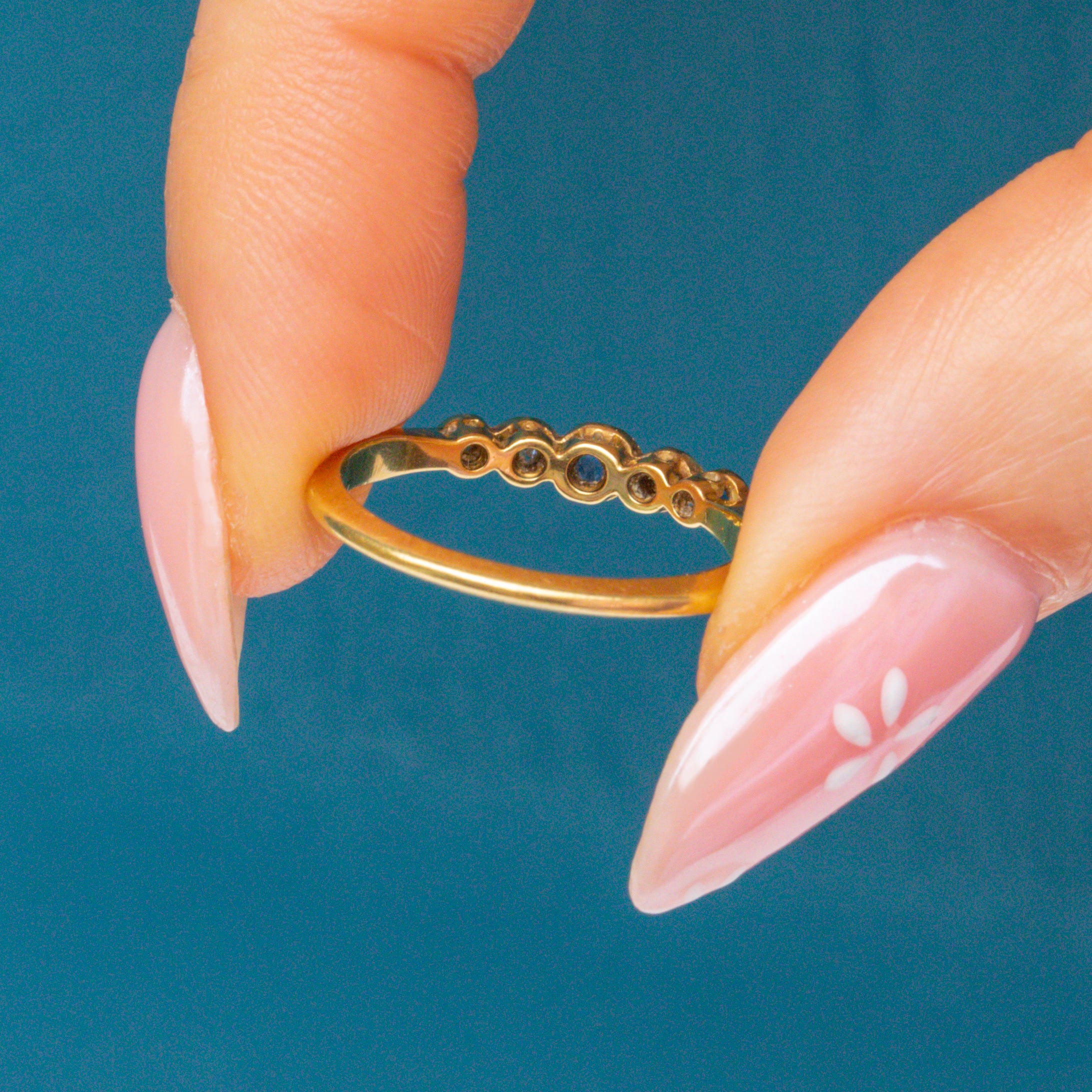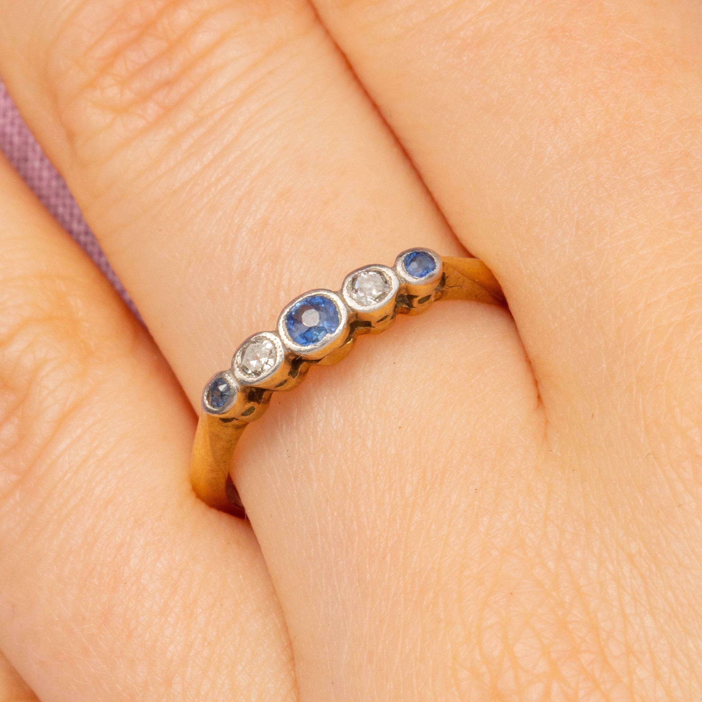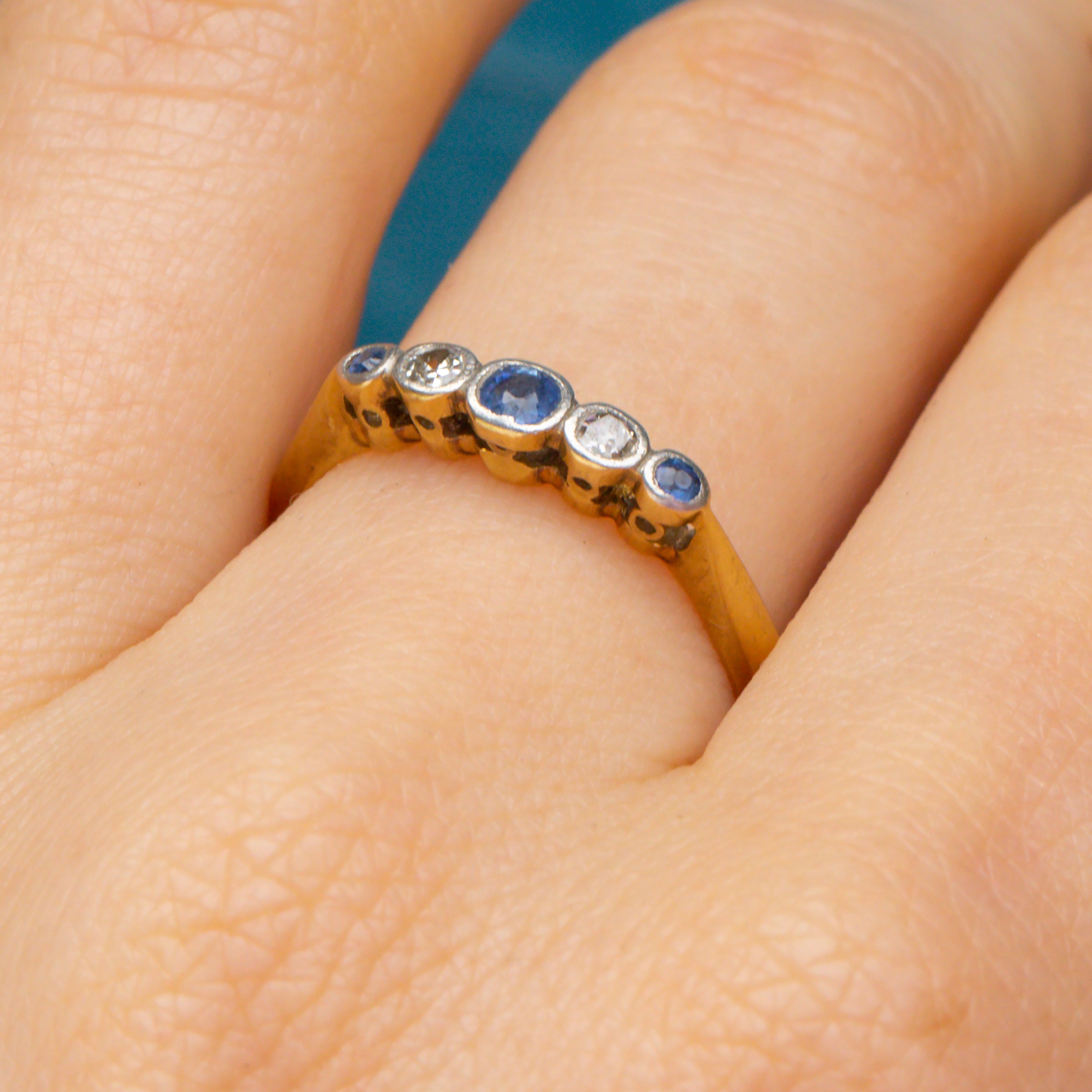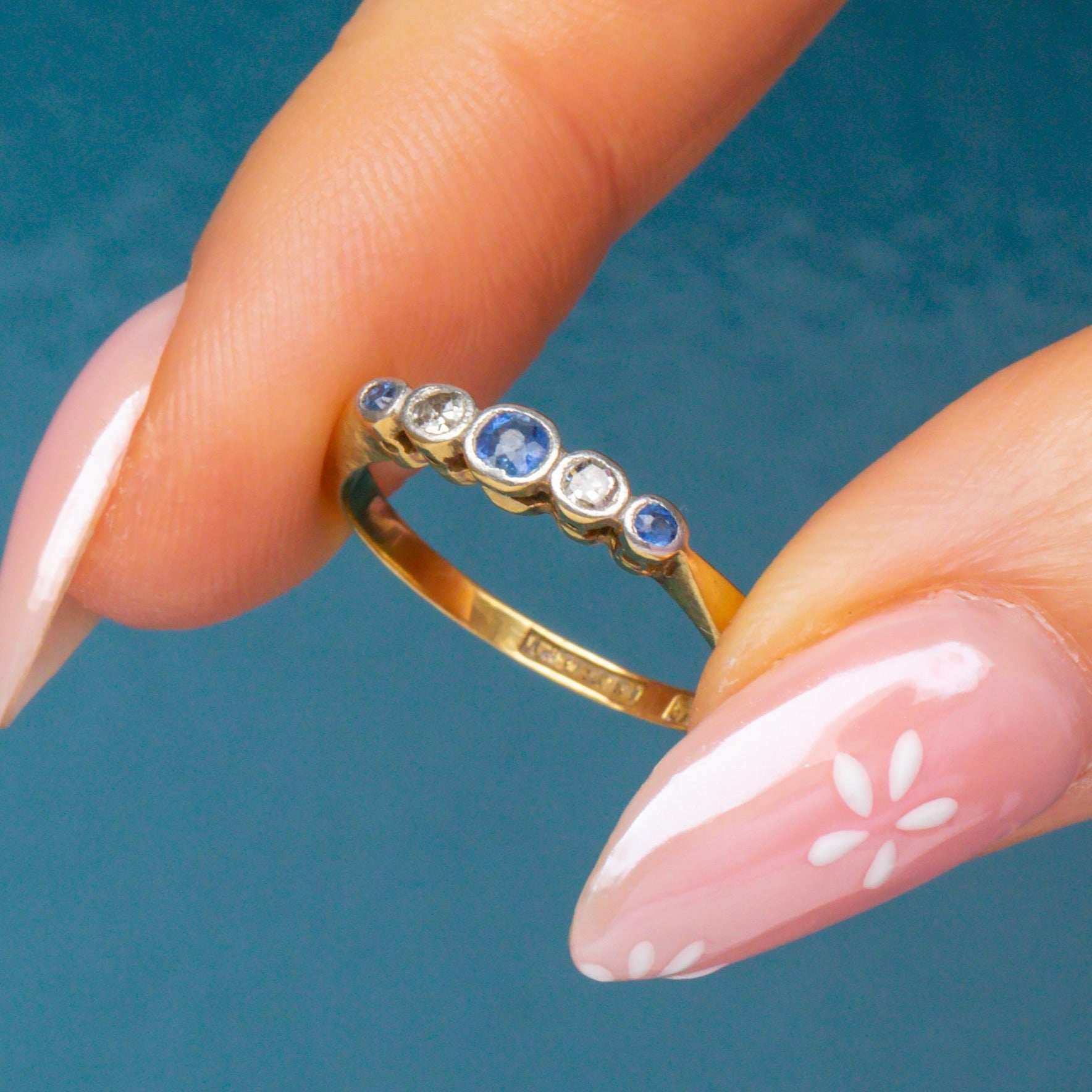 This 18ct Gold and Platinum Sapphire Diamond five stone ring is a Deco delight! Featuring alternating midnight blue Sapphires amongst dazzling Diamonds, this antique bezel-set Sapphire ring covers the width of your finger.