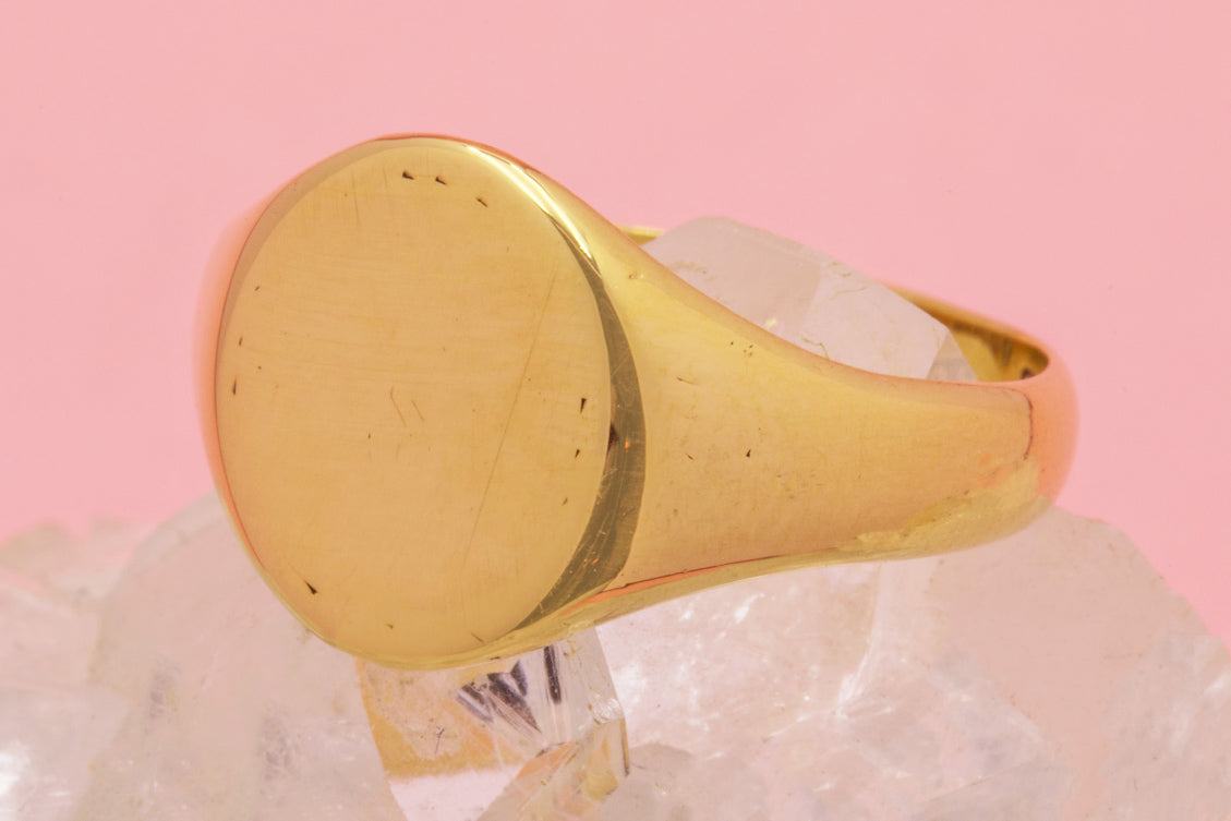 This is a fabulous 18ct Gold round signet ring to incorporate into your collection. What was once an engraved band, has now smoothed down to become a plain signet ring. Whilst there is still every so slight engraving visible to the border of the round signet face, you can keep it as it is, or engrave something of your own onto it!