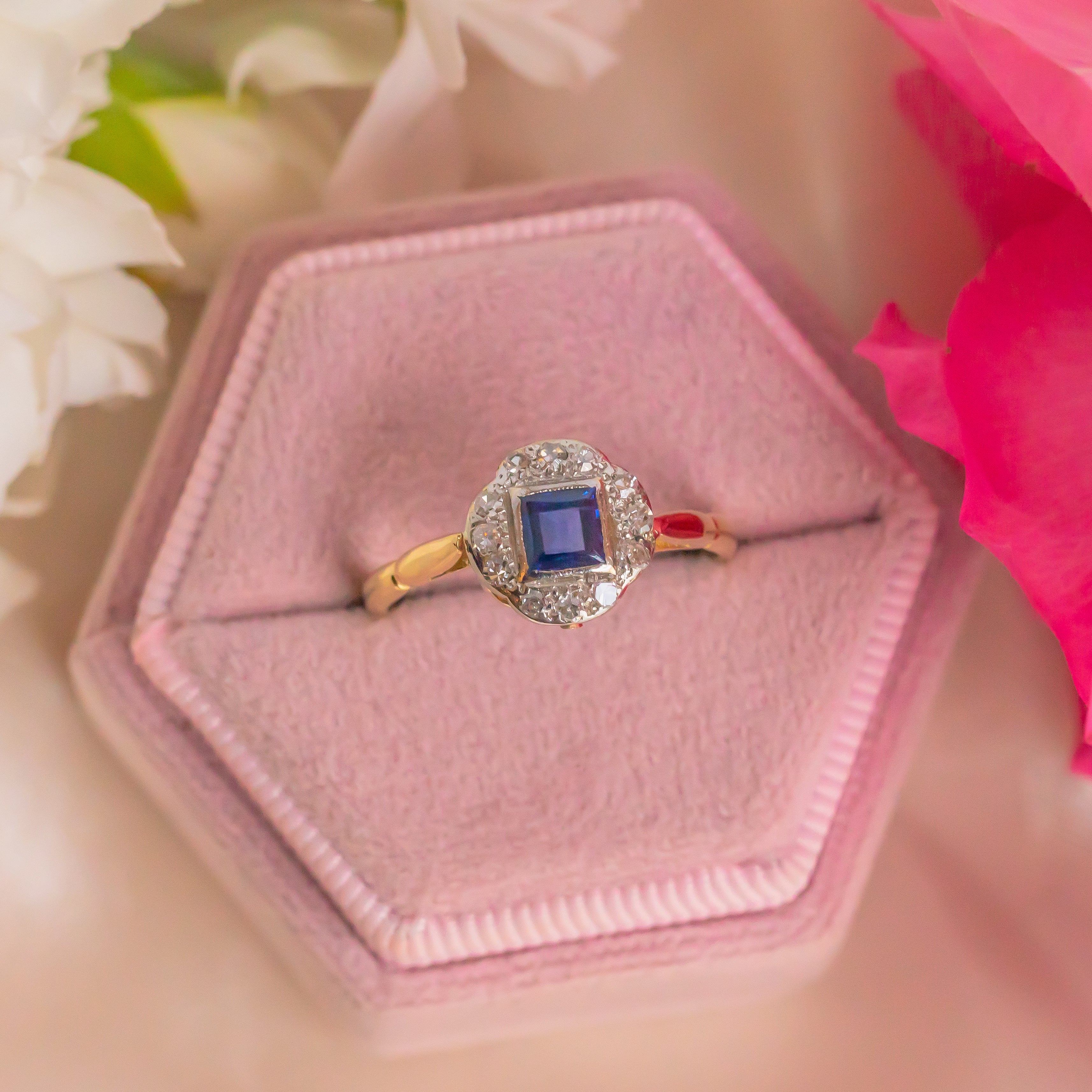 With dazzling Diamonds set in a soft Diamond form surrounding the Sapphire, this Vintage Sapphire ring has a definite Art Deco feel about her. With a smooth 18ct Gold band, this Gold Diamond ring glides onto your hand a dream; she might even be your perfect pick for a unique engagement ring!
