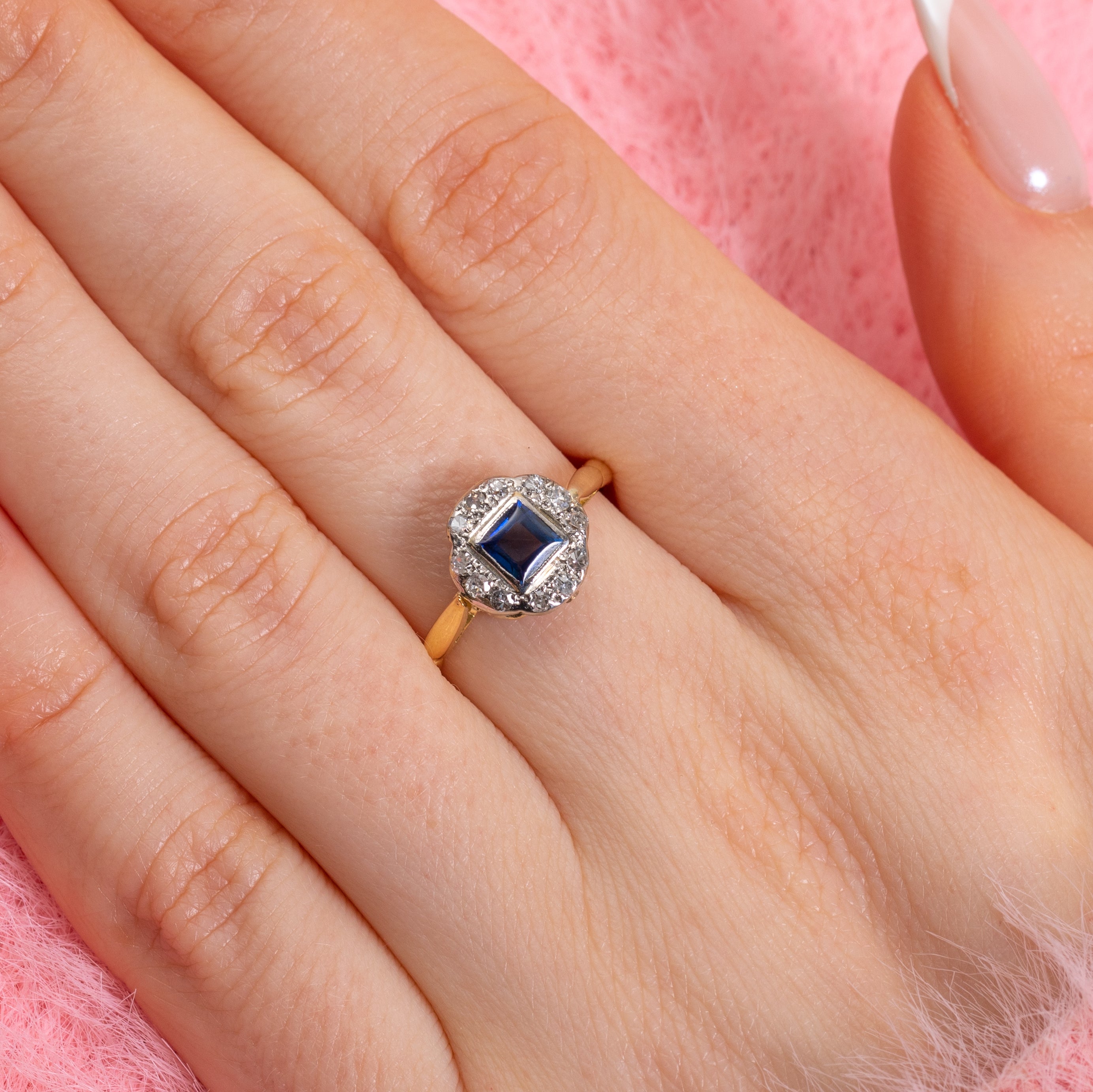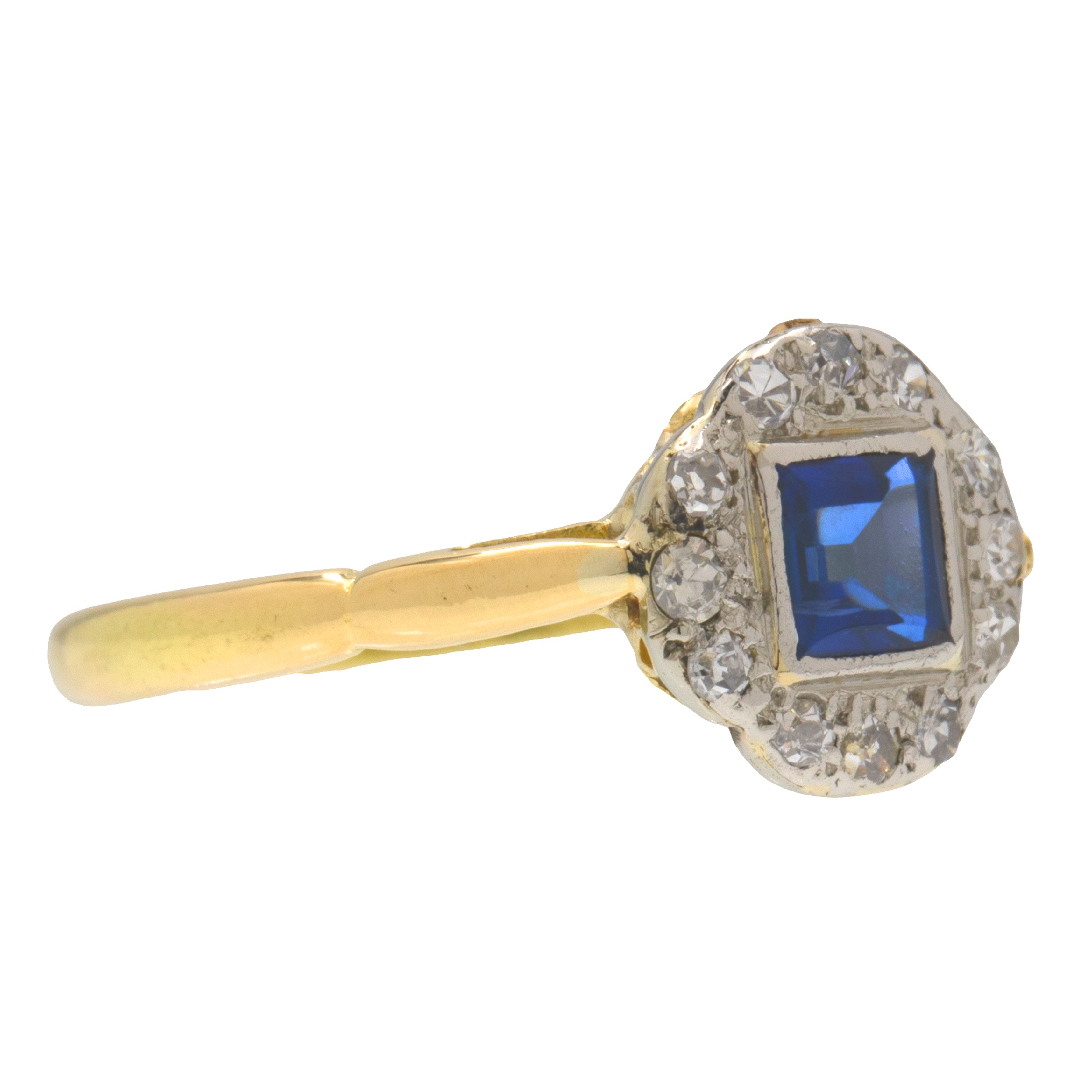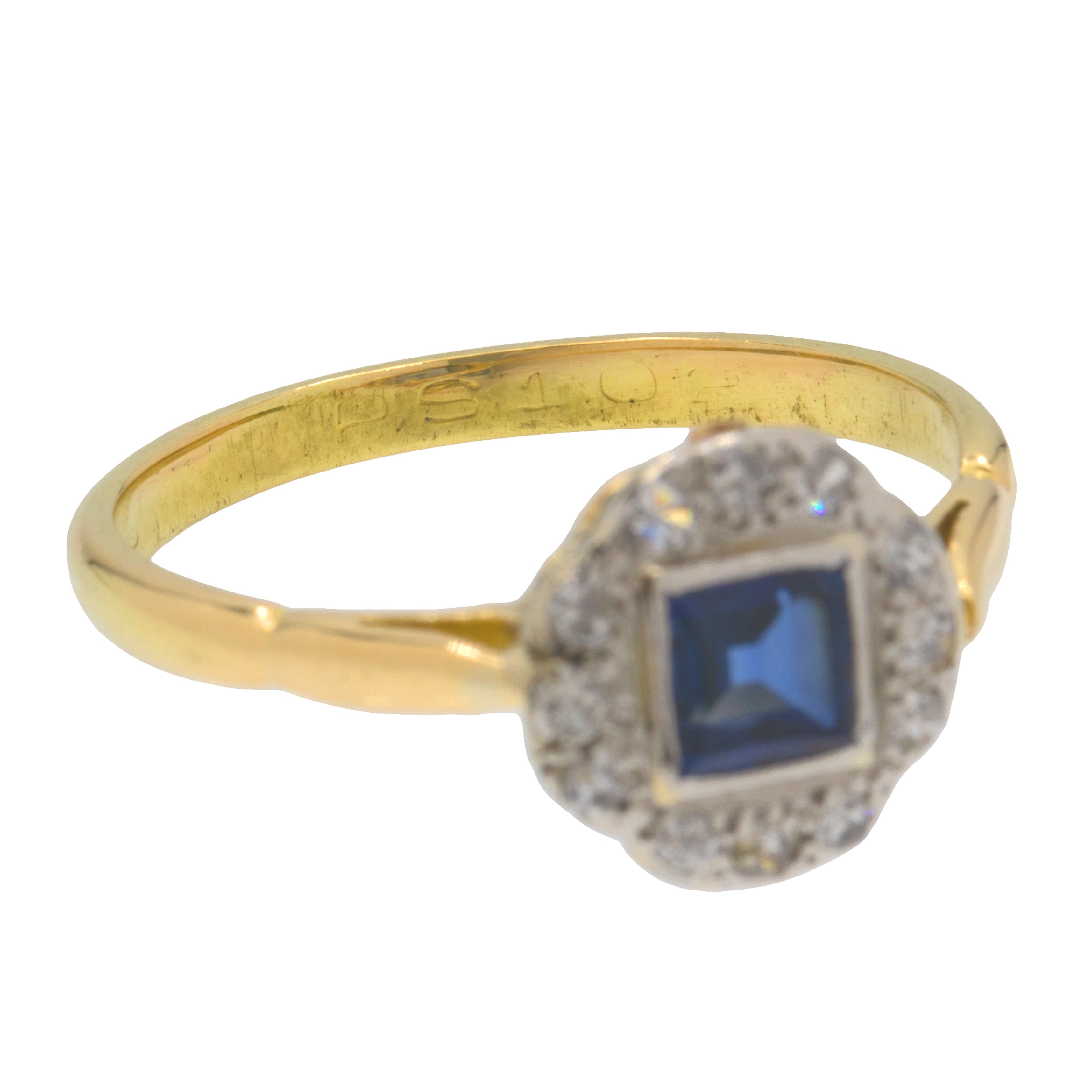 This 18ct Gold Sapphire Diamond cluster ring will make a classy addition to any Vintage jewellery collection. A square-cut Diamond sits poised at her centre, with deep midnight blue hues dancing from facet to facet.
