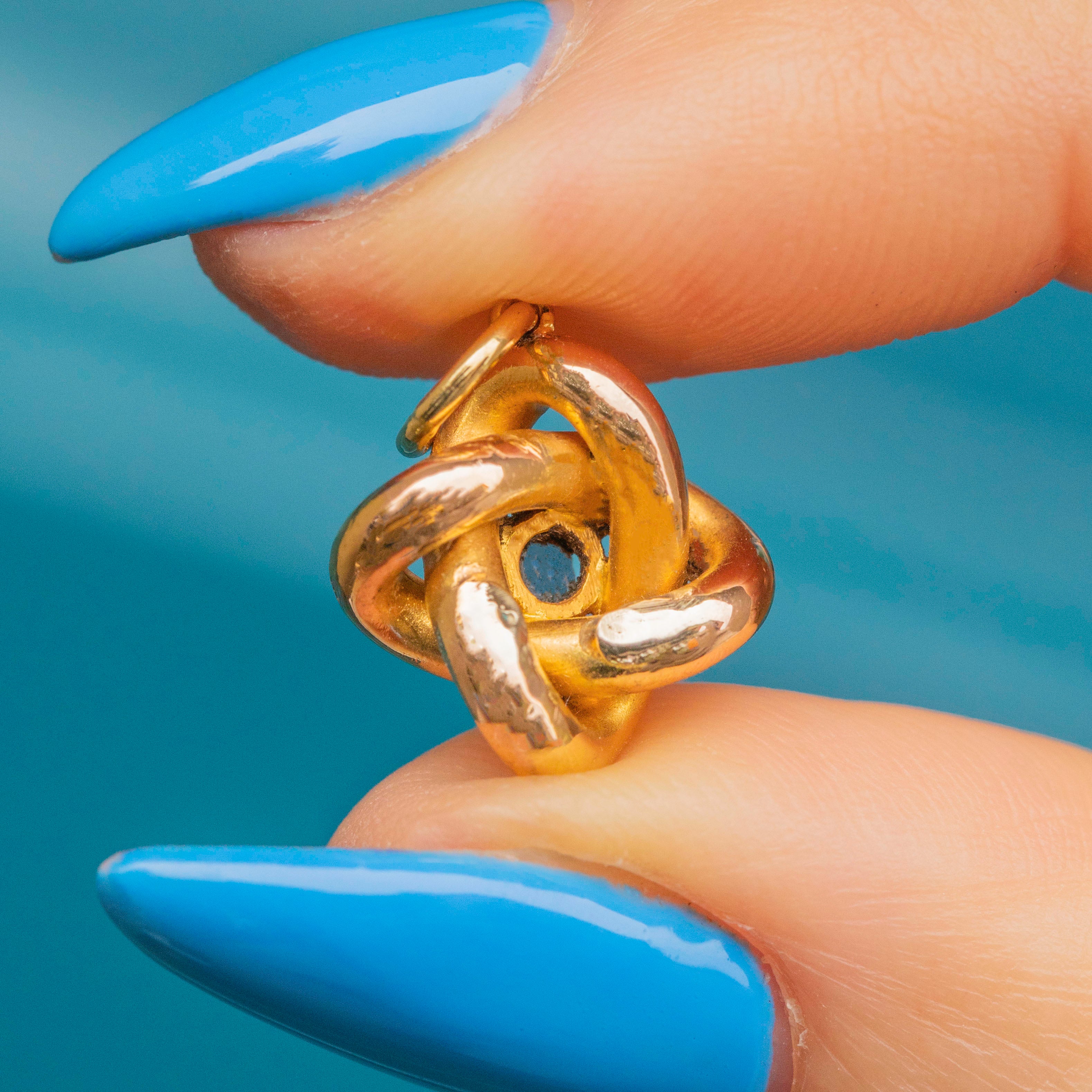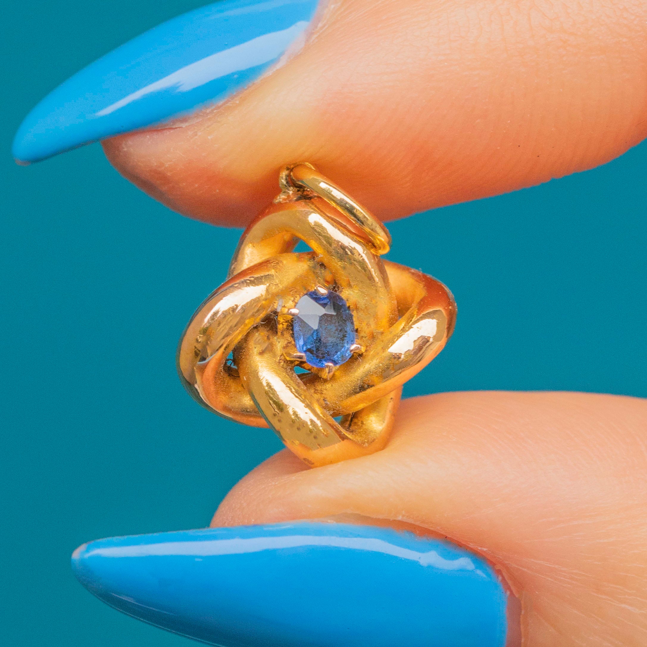 We adore this sweet 18ct Gold Sapphire knot charm! This Mid-Century Vintage pendant is crafted from a rich, honey-hued 18ct Gold, and takes the form of an elegant lover's knot, a symbol of the unbreakable bond between lovers.