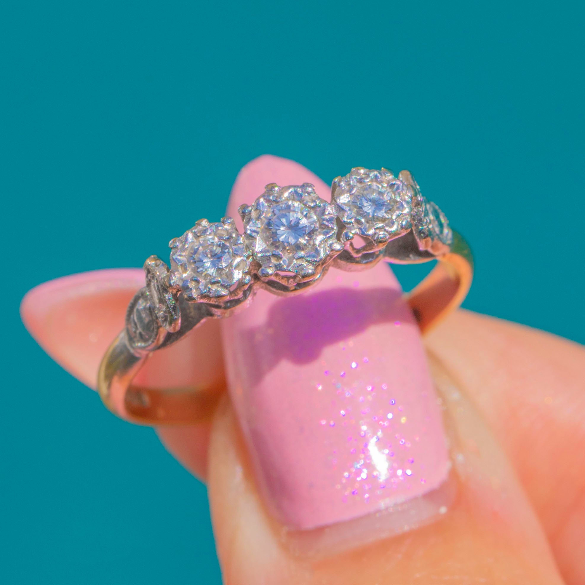 A luminous Art Deco style trilogy, this 18ct Gold ring is star-set with three natural, earth-mined Diamonds totalling approximately 0.25ct. The sculpted star rays frame each sparkling stone beautifully, while the white-metal settings lend extra brilliance against the rich 18ct Gold shank.