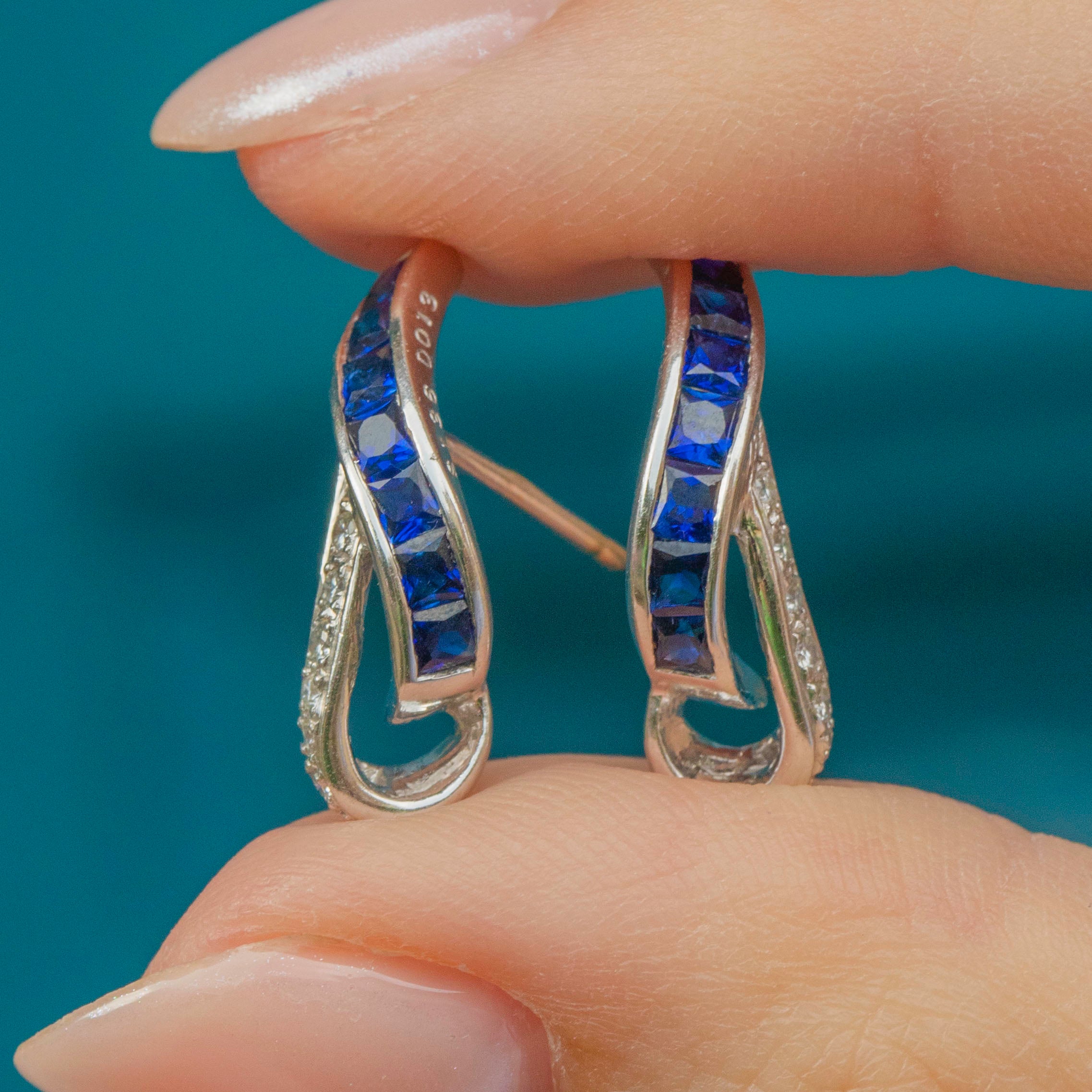 Pop these 18ct white Gold Sapphire Diamond twist earrings into your ears and embrace their elegant charm! Akin to two strands of ribbon, these Vintage earrings effortlessly caress the shape of your lobe, inlaid with a row of midnight blue Sapphires and crisp white Diamonds that catch the light beautifully.