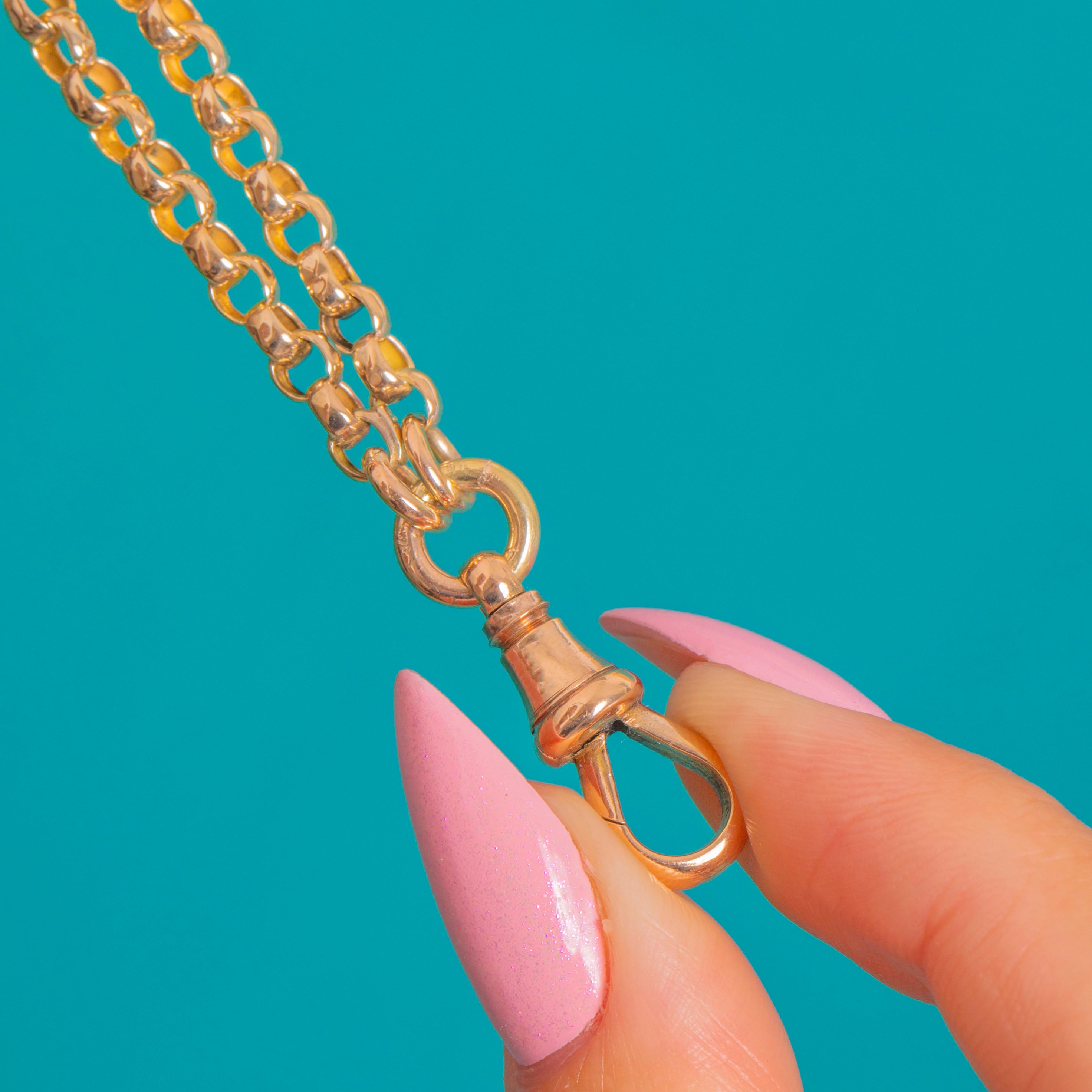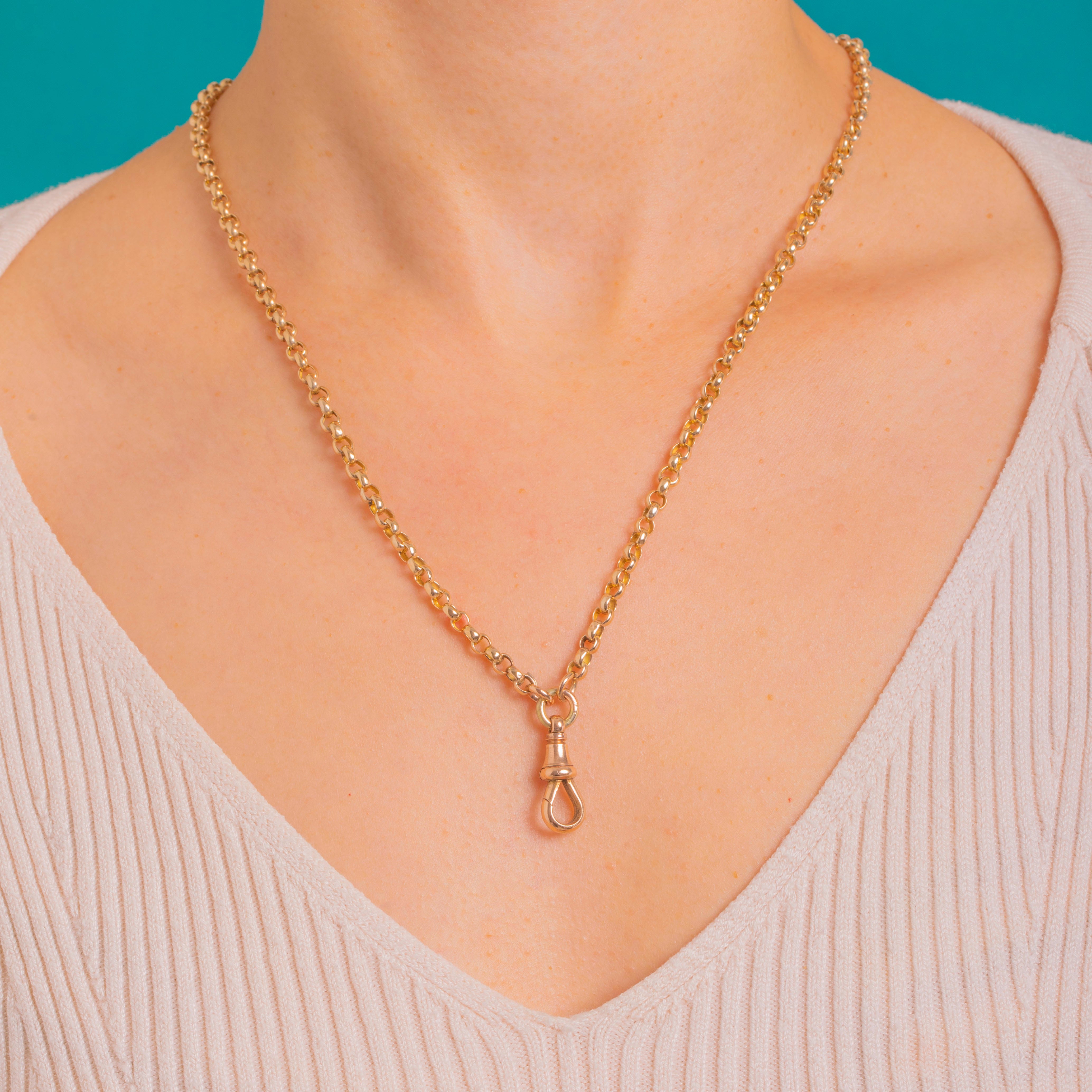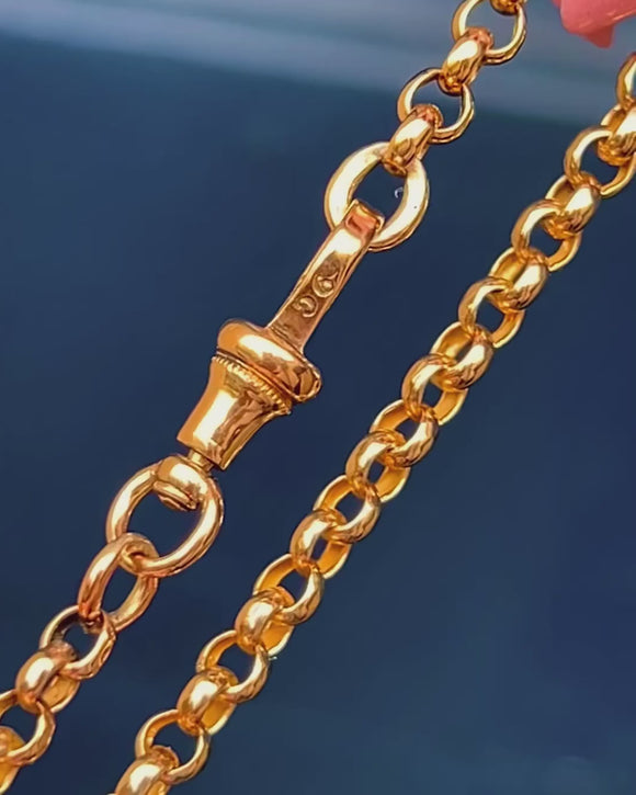 A classic Victorian 9ct Gold belcher chain with a coveted dog-clip charm-holder, marrying form and function in the most elegant way. The rounded belcher links gleam with a bright polish, while the turned terminals and twin clips lend that authentic watch‑chain allure.