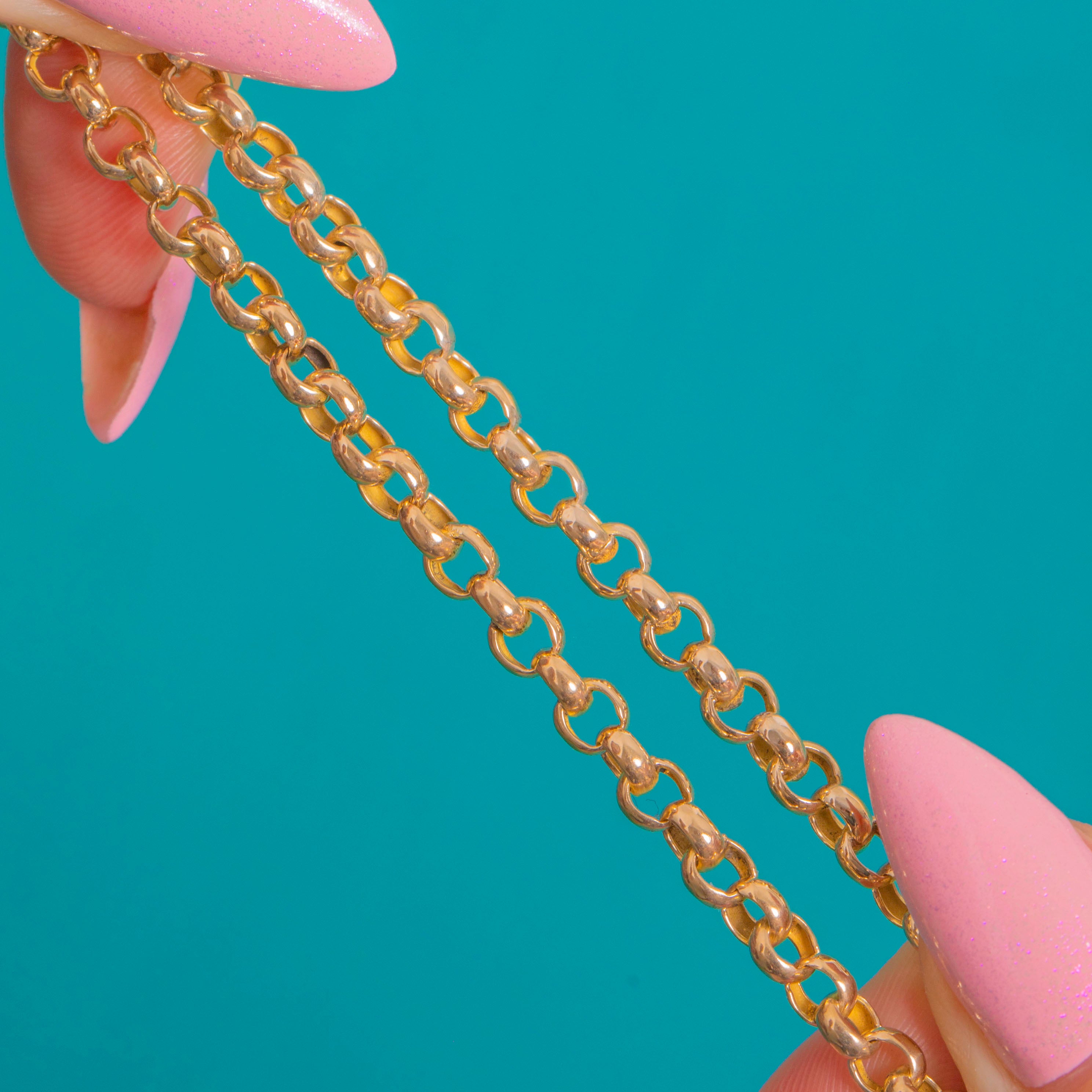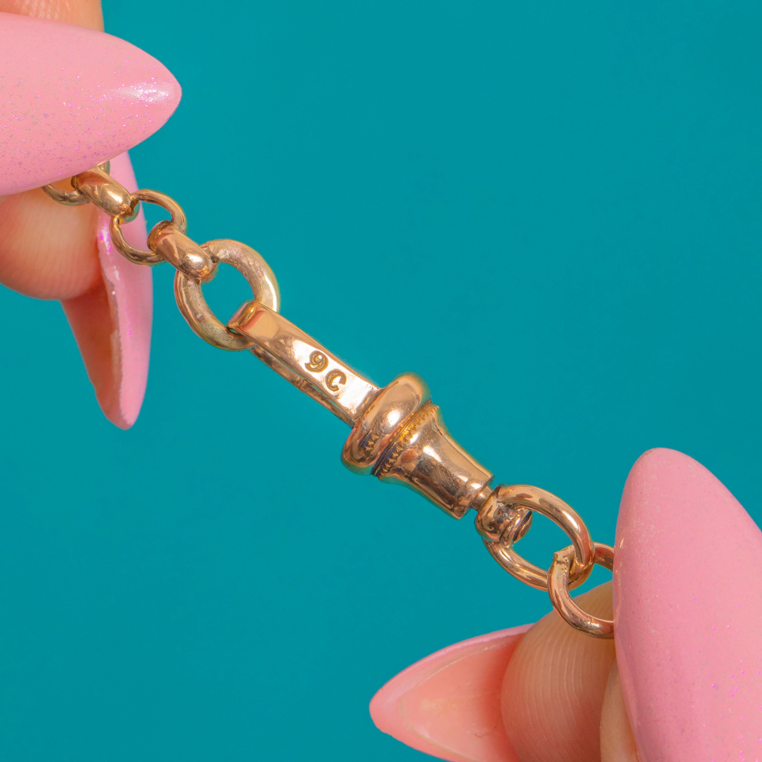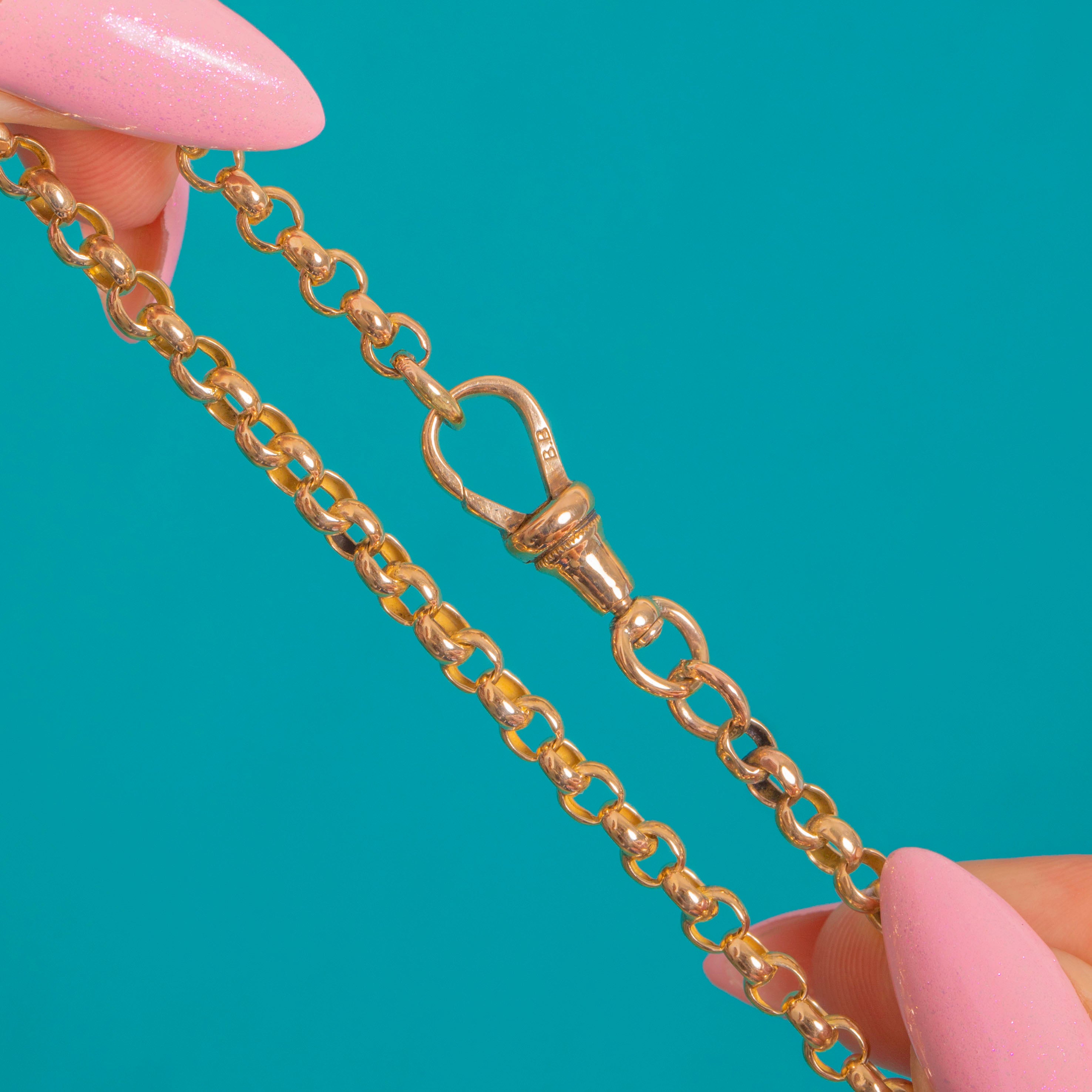 A classic Victorian 9ct Gold belcher chain with a coveted dog-clip charm-holder, marrying form and function in the most elegant way. The rounded belcher links gleam with a bright polish, while the turned terminals and twin clips lend that authentic watch‑chain allure.