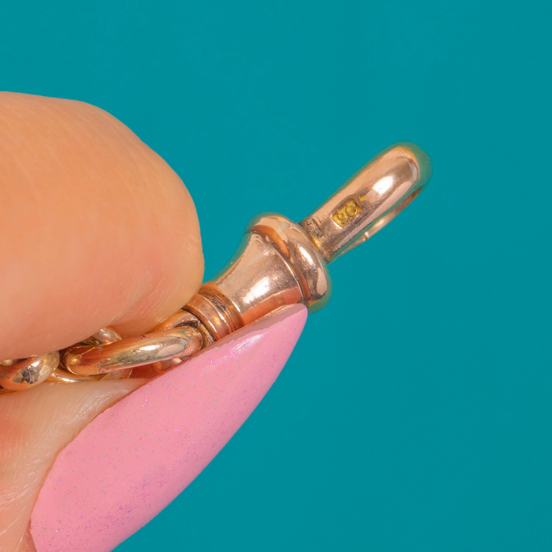 STAMPS: 9C stamped on each dog clip, B.B maker's mark on dog‑clip clasp.