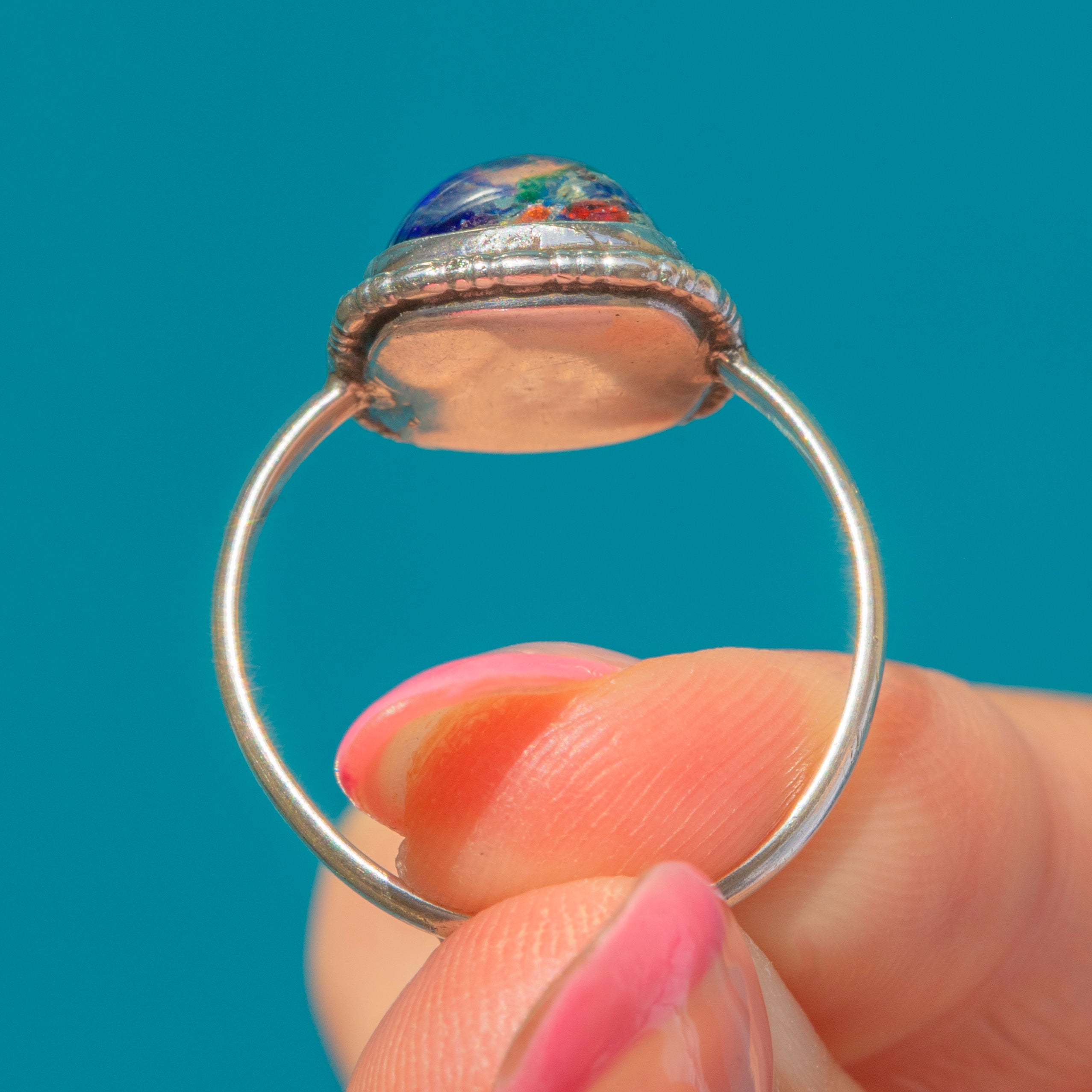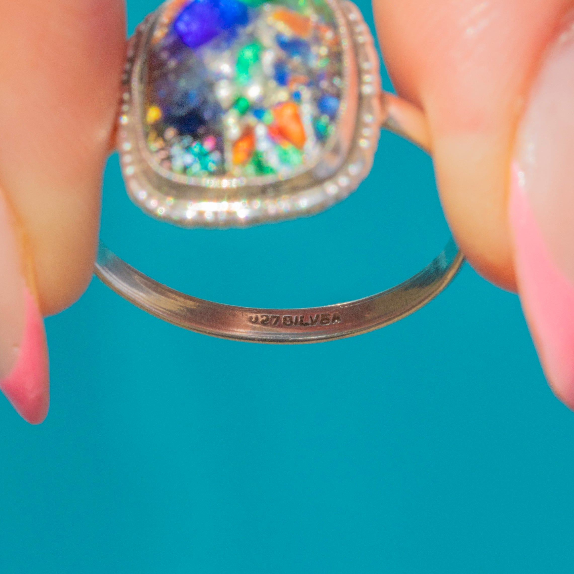 VERY GOOD. This 1920's antique Silver Venetian glass ring wears comfortably on the finger. The domed resin top does have one or two very minor scuffs, but the multicoloured nature of the ring is very forgiving so it isn't obvious to the naked eye.