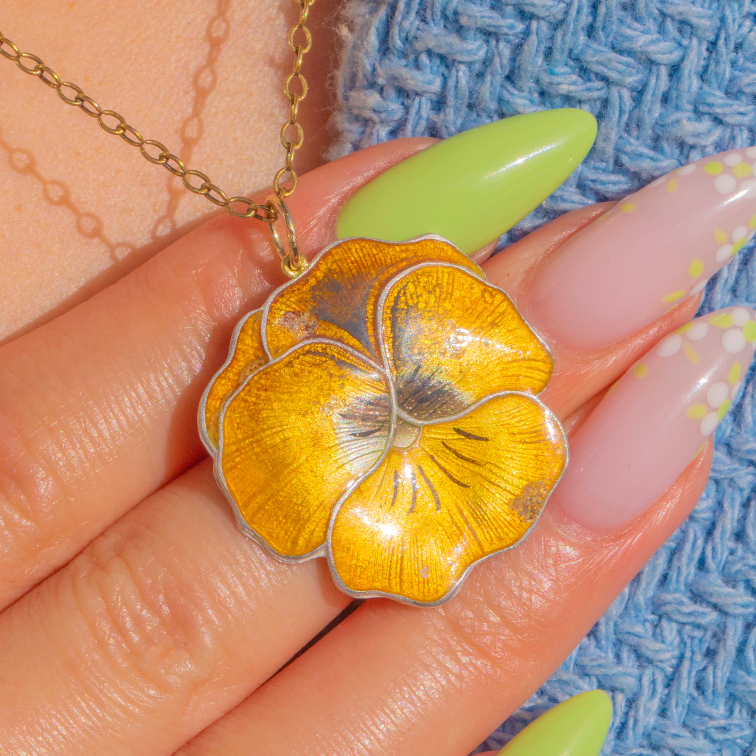 A cheerful mid-century jewel, this Sterling Silver pansy pendant blooms with sunny yellow Enamel and a softly shaded, deeper centre. Delicate veining and a finely striated ground show through the translucent Enamel, creating beautiful depth and naturalistic detail.