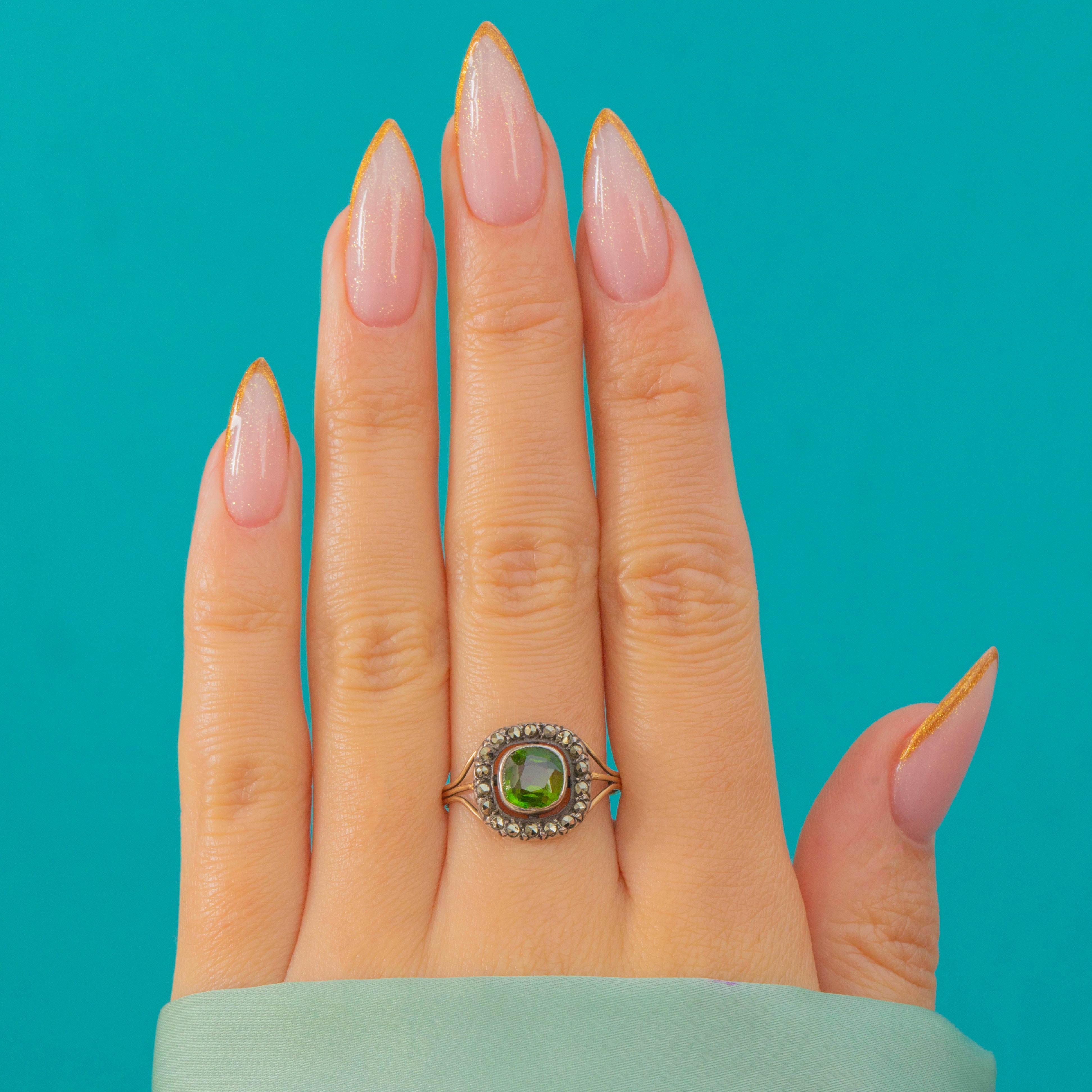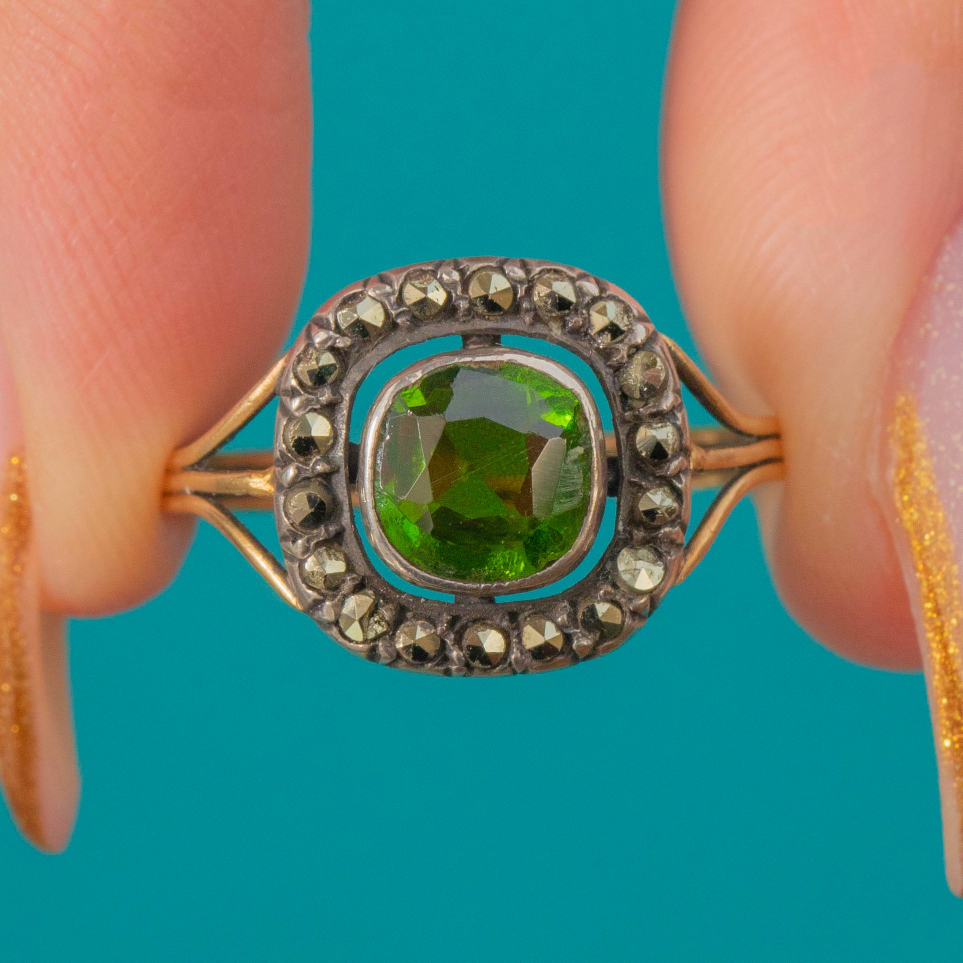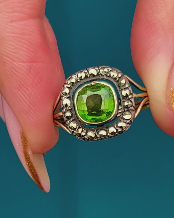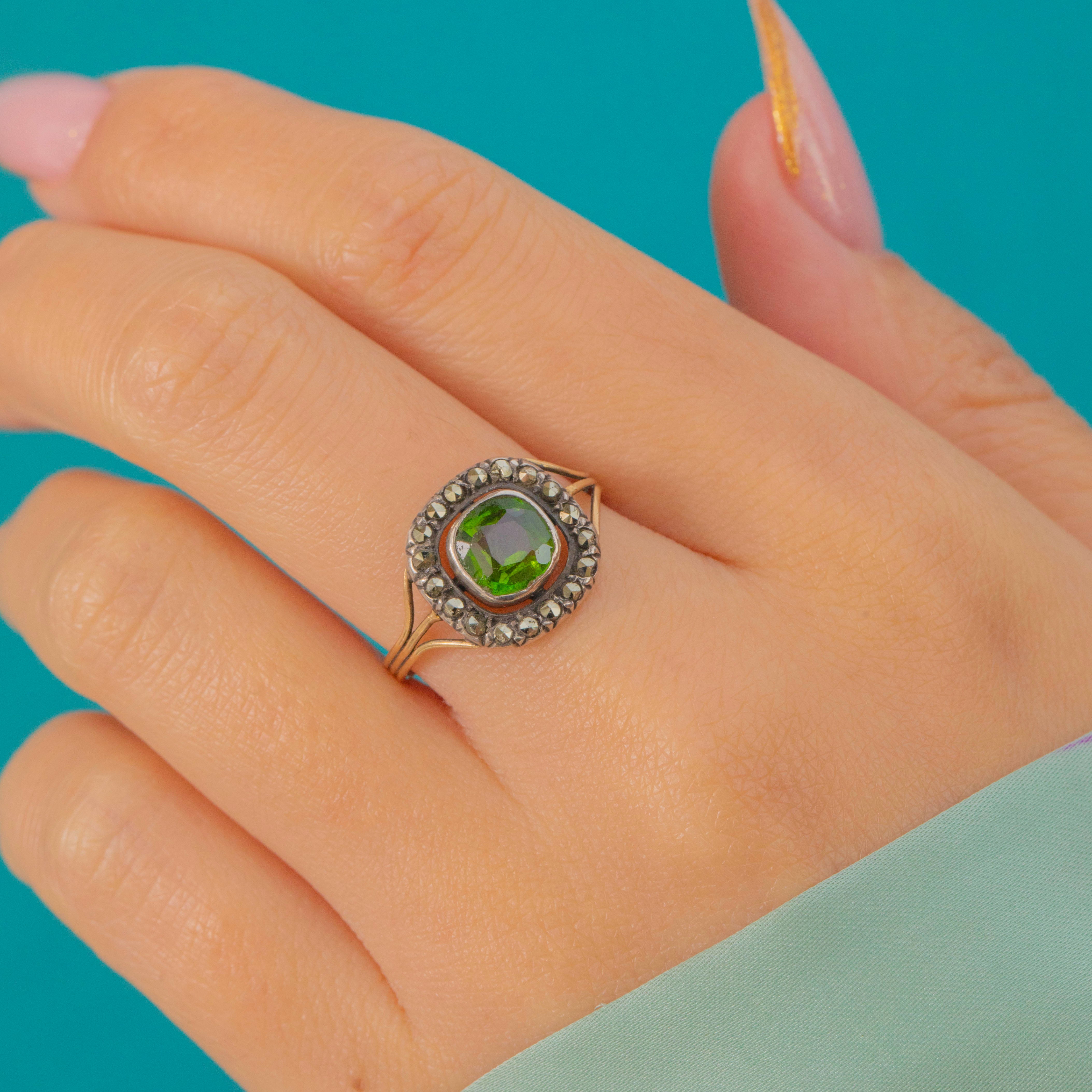 A rare and elegant 19th-century French cluster ring, handcrafted in rich 18ct Gold and set with a vivid Green Paste centre surrounded by a halo of sparkling Marcasite.