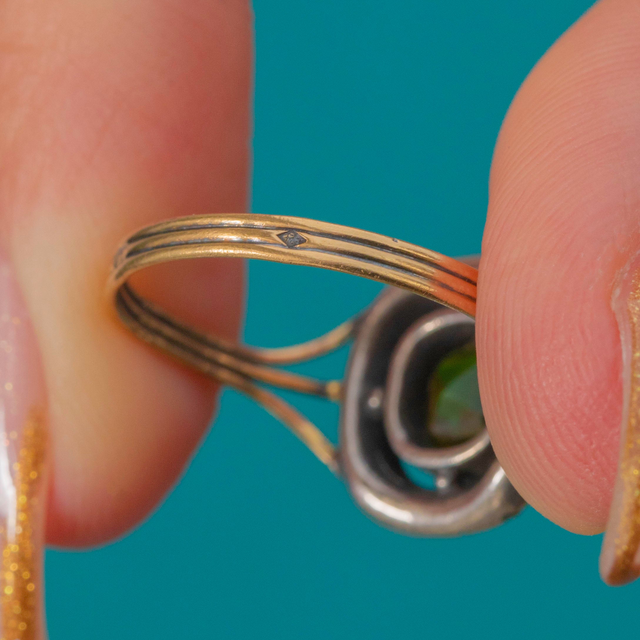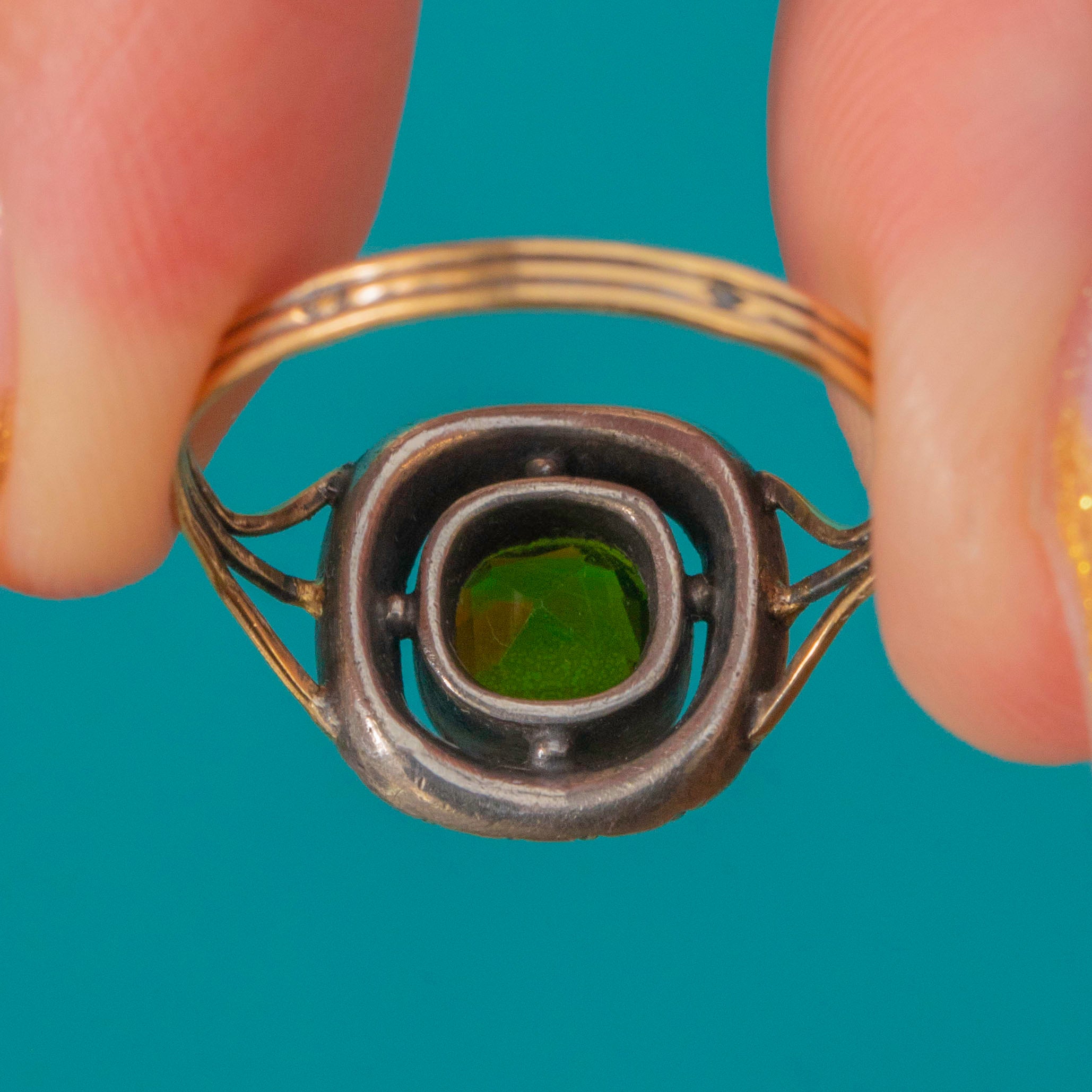 The colour and composition are beautifully balanced — the bright verdant hue of the Paste perfectly offset by the soft metallic shimmer of Marcasite and the warmth of the antique Gold. Its charming split triple-band design and handmade setting embody the craftsmanship of the Georgian to early 19th-century era, making this a truly special antique treasure.