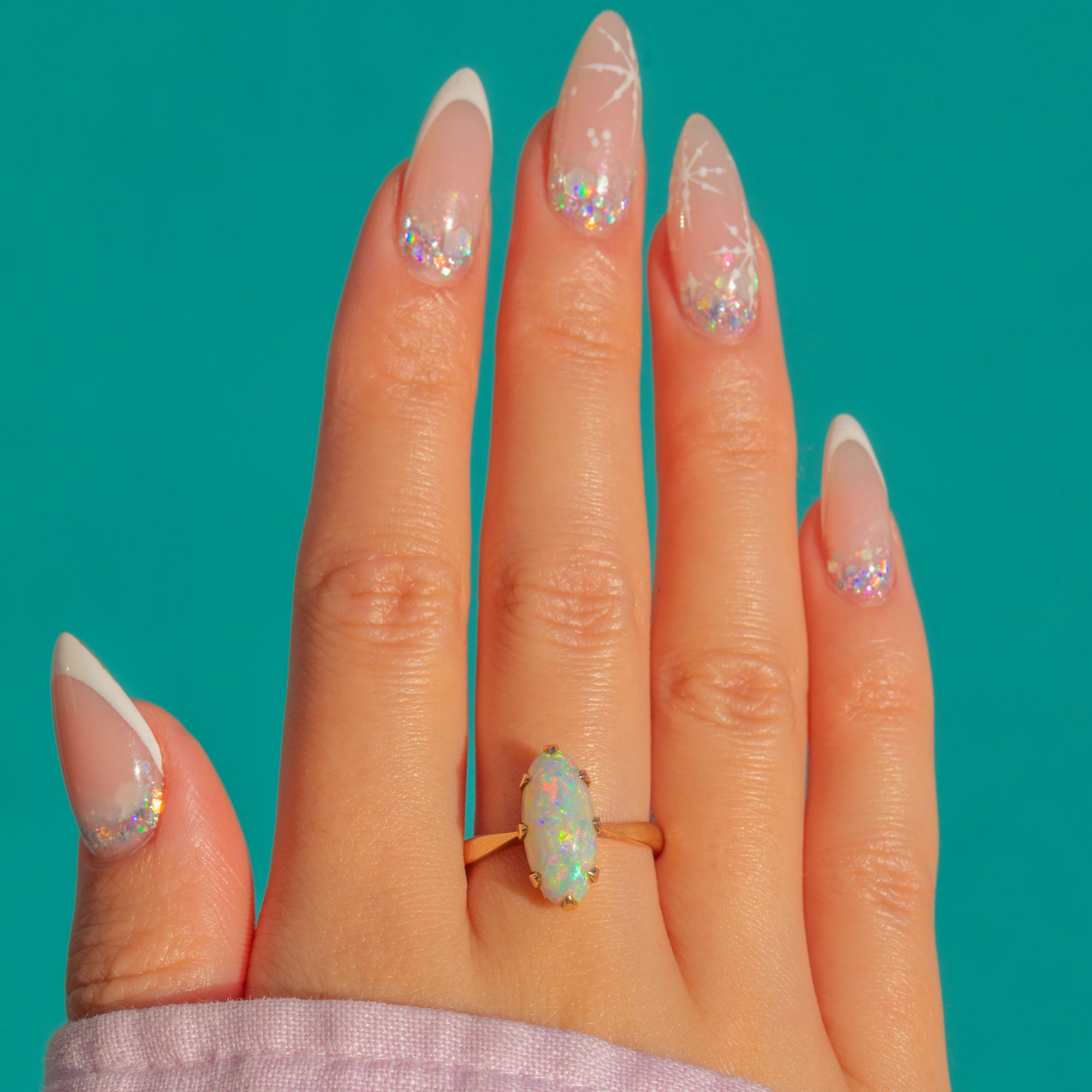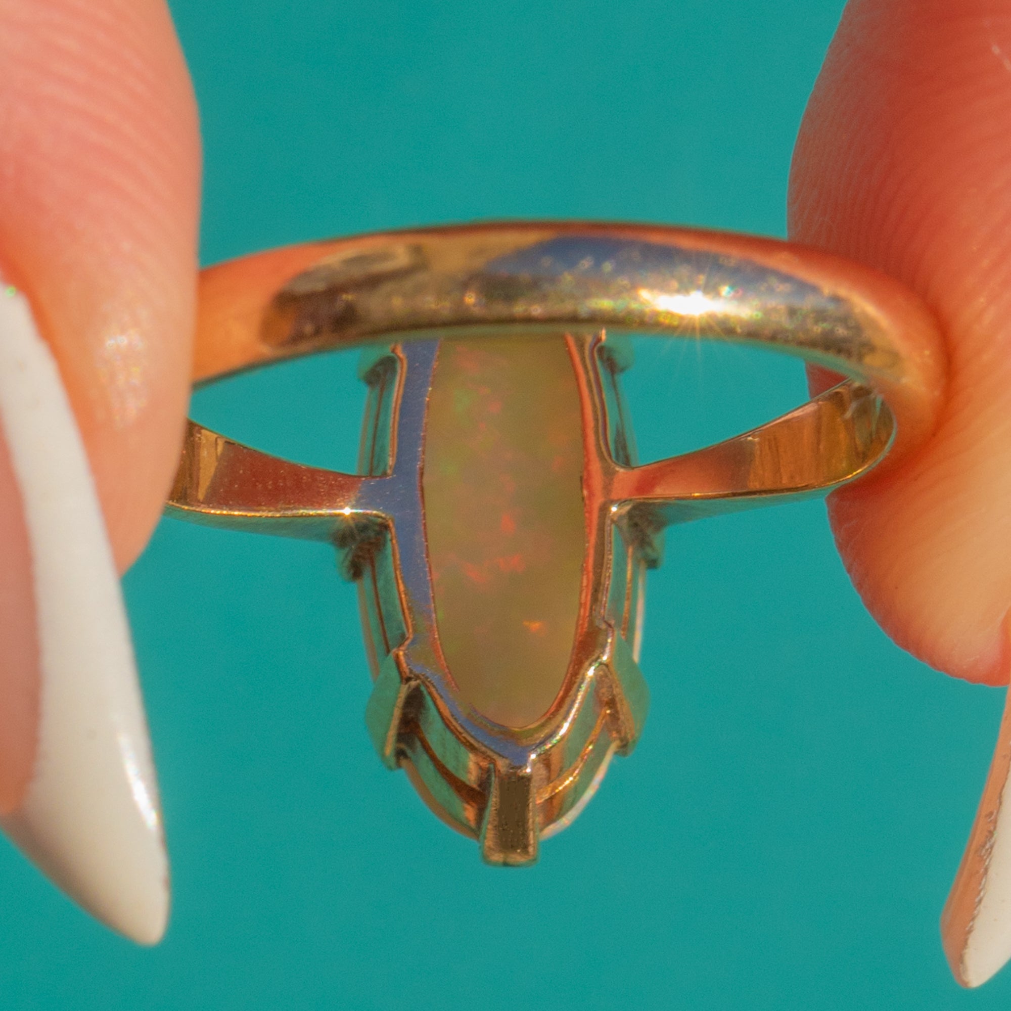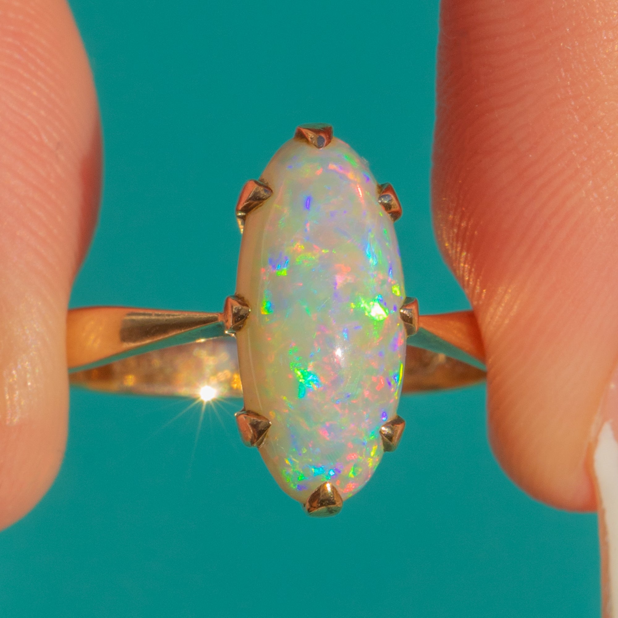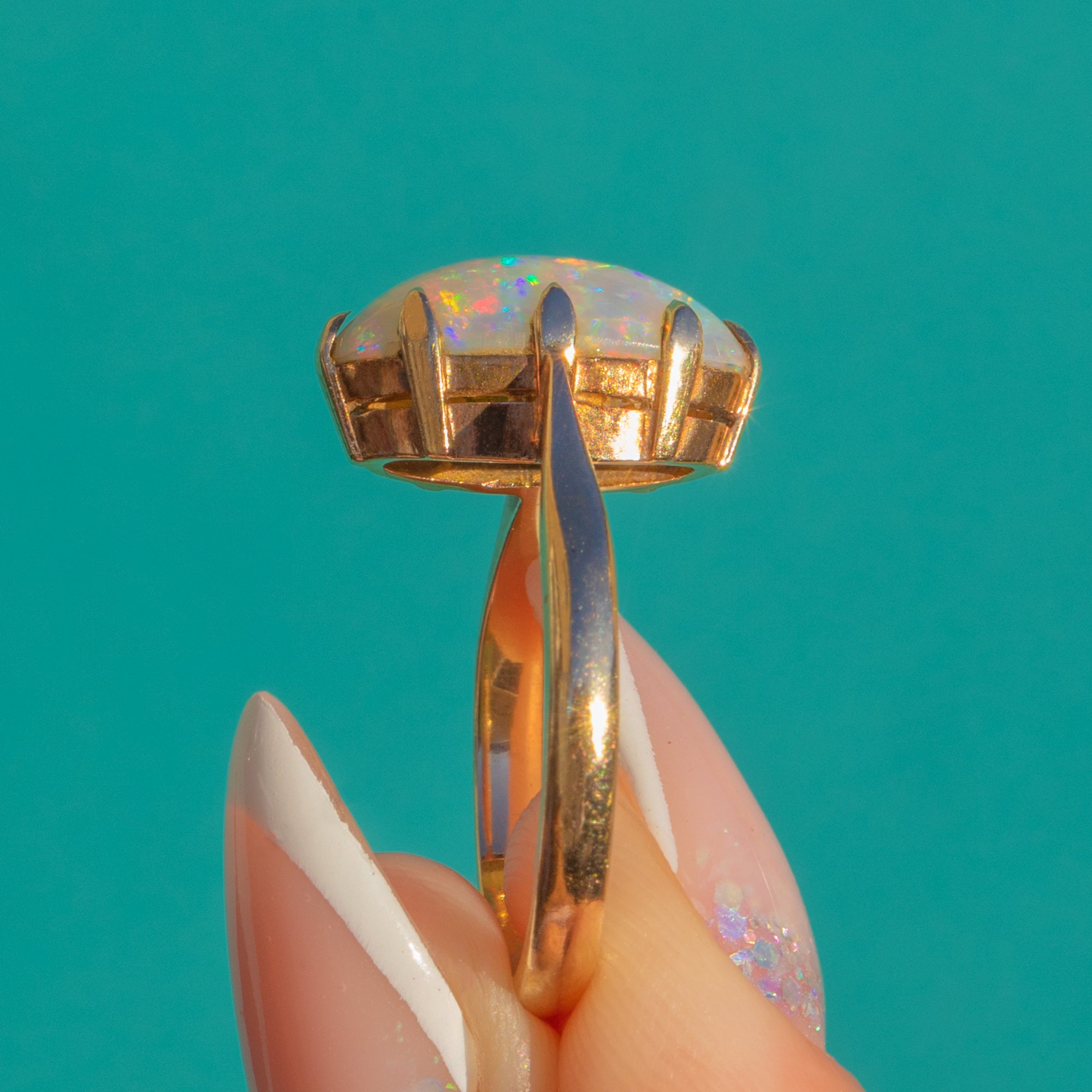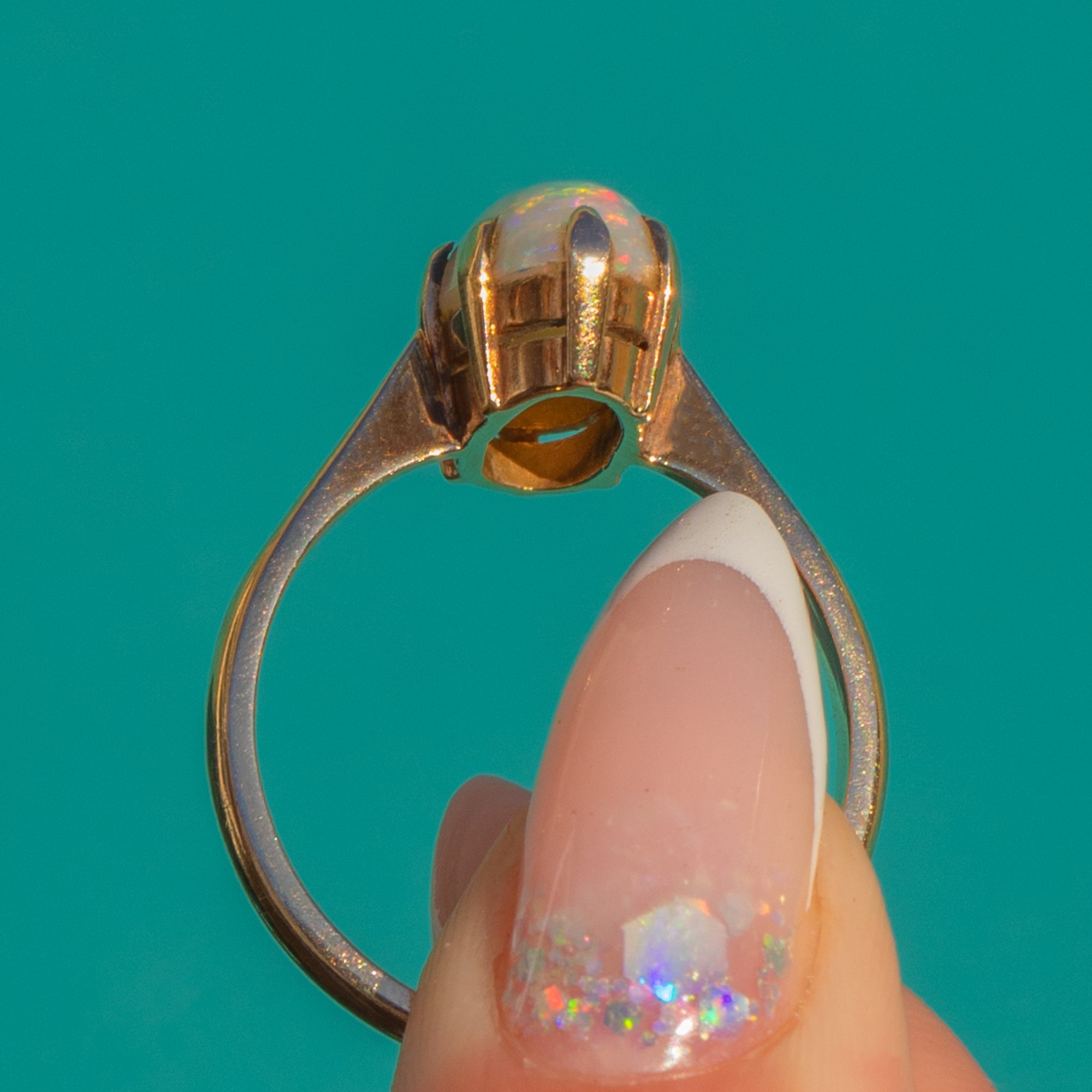 EXCELLENT: The Opal cabochon is ultra-glossy with no chips, cracks or wear, and displays vivid flashes of colour. The setting is secure and the shoulders crisp, showing minimal wear in line with age.