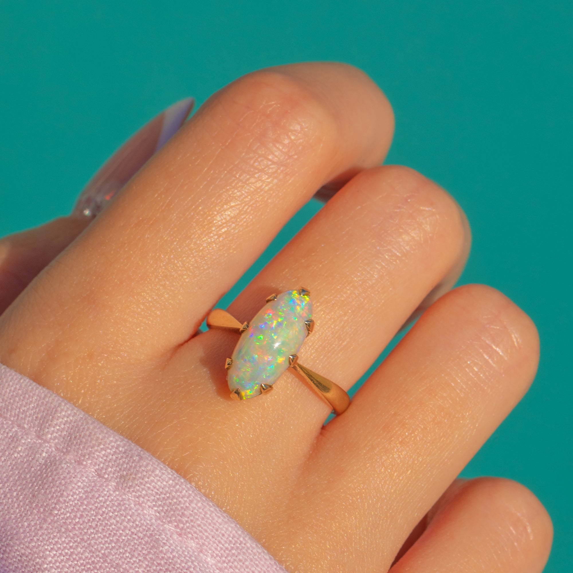 This striking Art Deco Opal solitaire ring showcases a vibrant 2.00ct natural solid Opal cabochon, its rectangular shape and high-domed profile glowing with colourful fire. Bold geometric shoulders create a strong Deco silhouette, making this a standout design from the period.