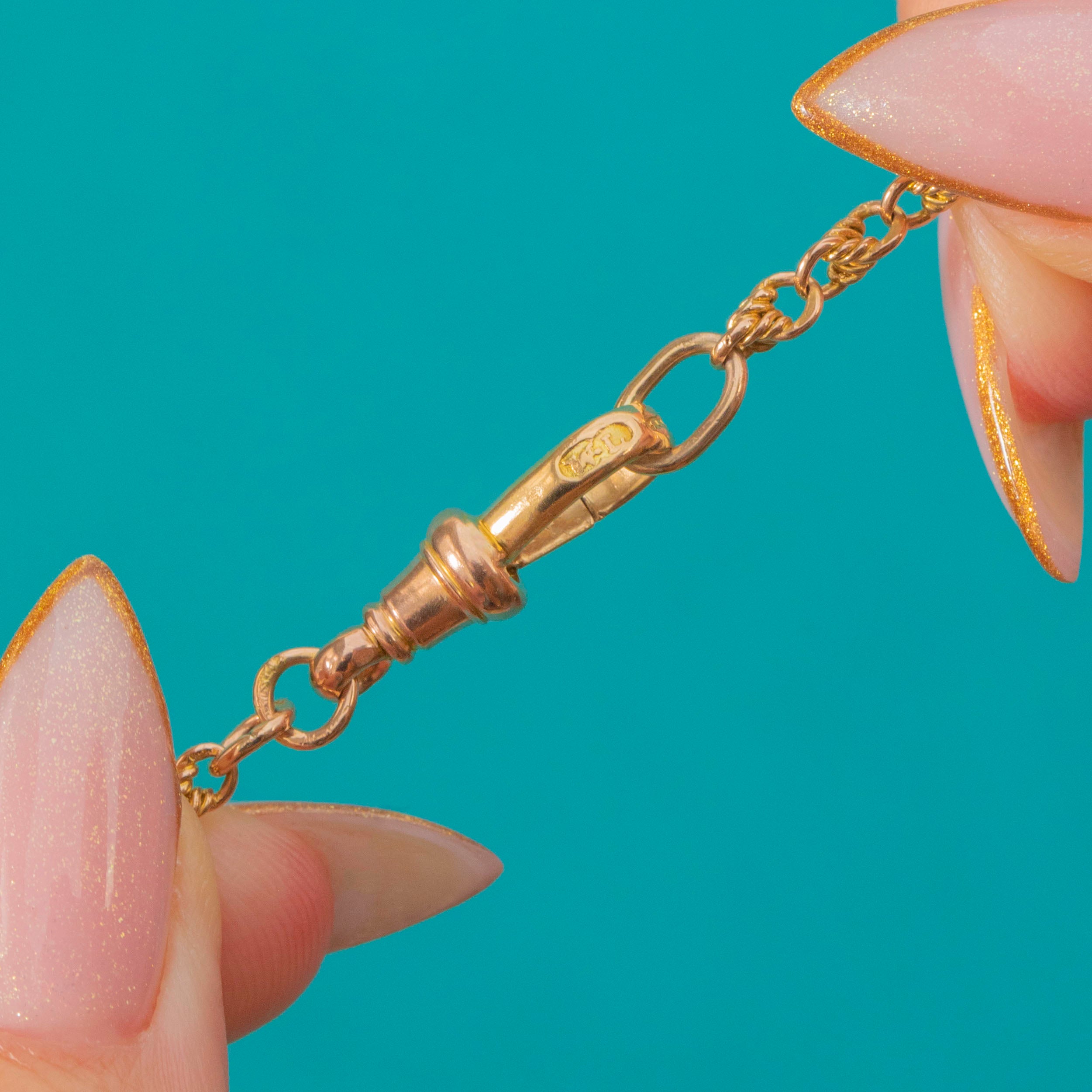 The original dog-clip clasp is both practical and decorative, stamped with full marks for 15ct Gold and the maker’s initials “W.L”. A timeless piece that layers beautifully or makes a statement on its own.
