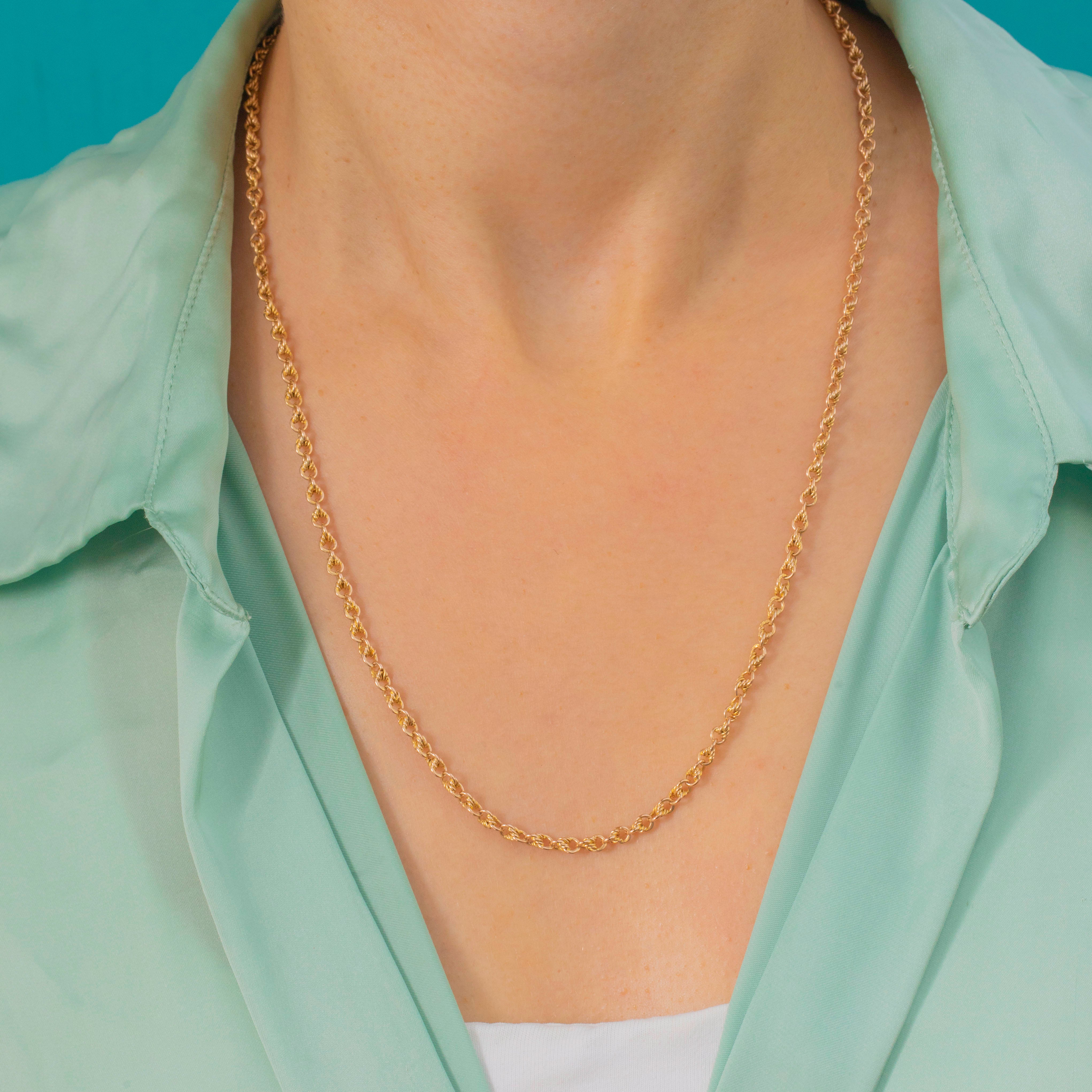 An exquisite Victorian 15ct Gold lover’s knot chain with its original dog-clip clasp. Each link is intricately twisted and interwoven, creating a beautiful display of movement and light.