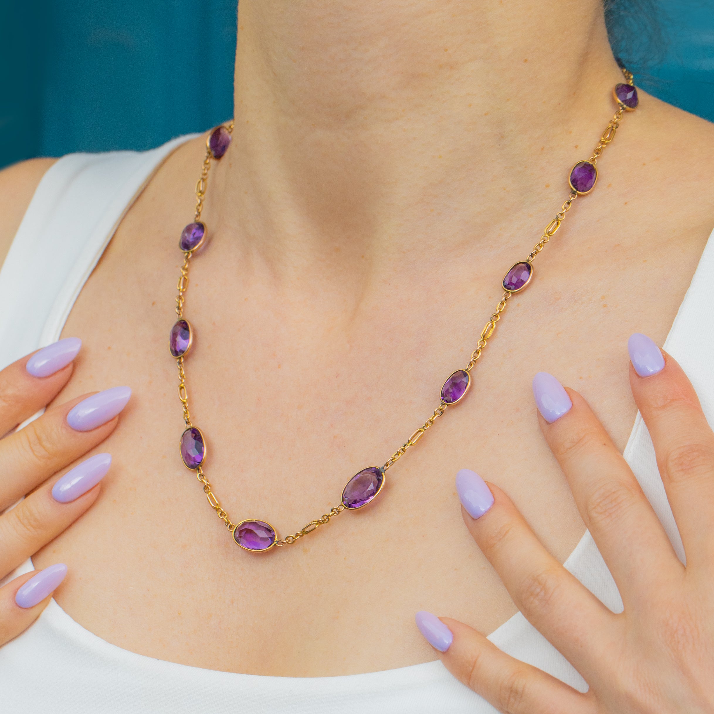 Add a regal touch to any outfit with this Victorian 9ct Gold Amethyst necklace! Inlaid with 13 vibrant, violet Amethysts boasting an impressive 27.34ct, their graduating size accentuates your neckline resting just above the collarbone.